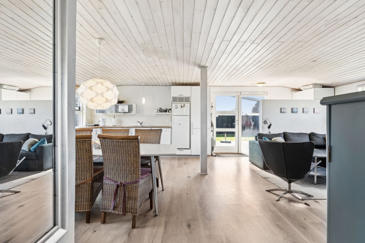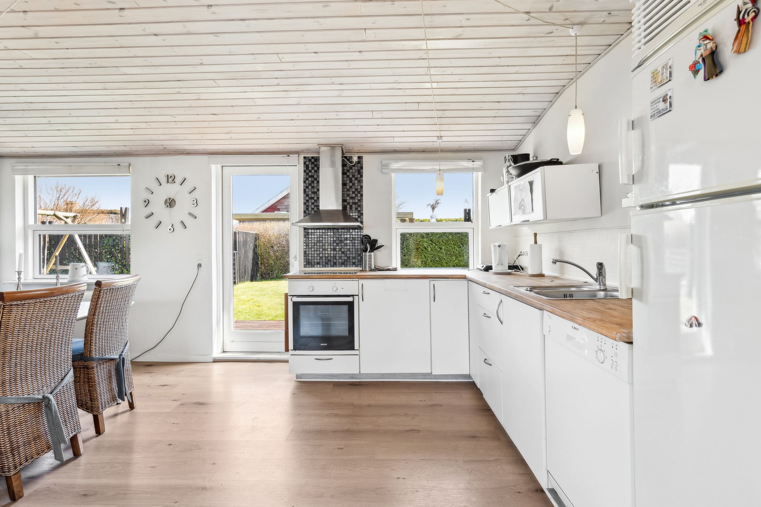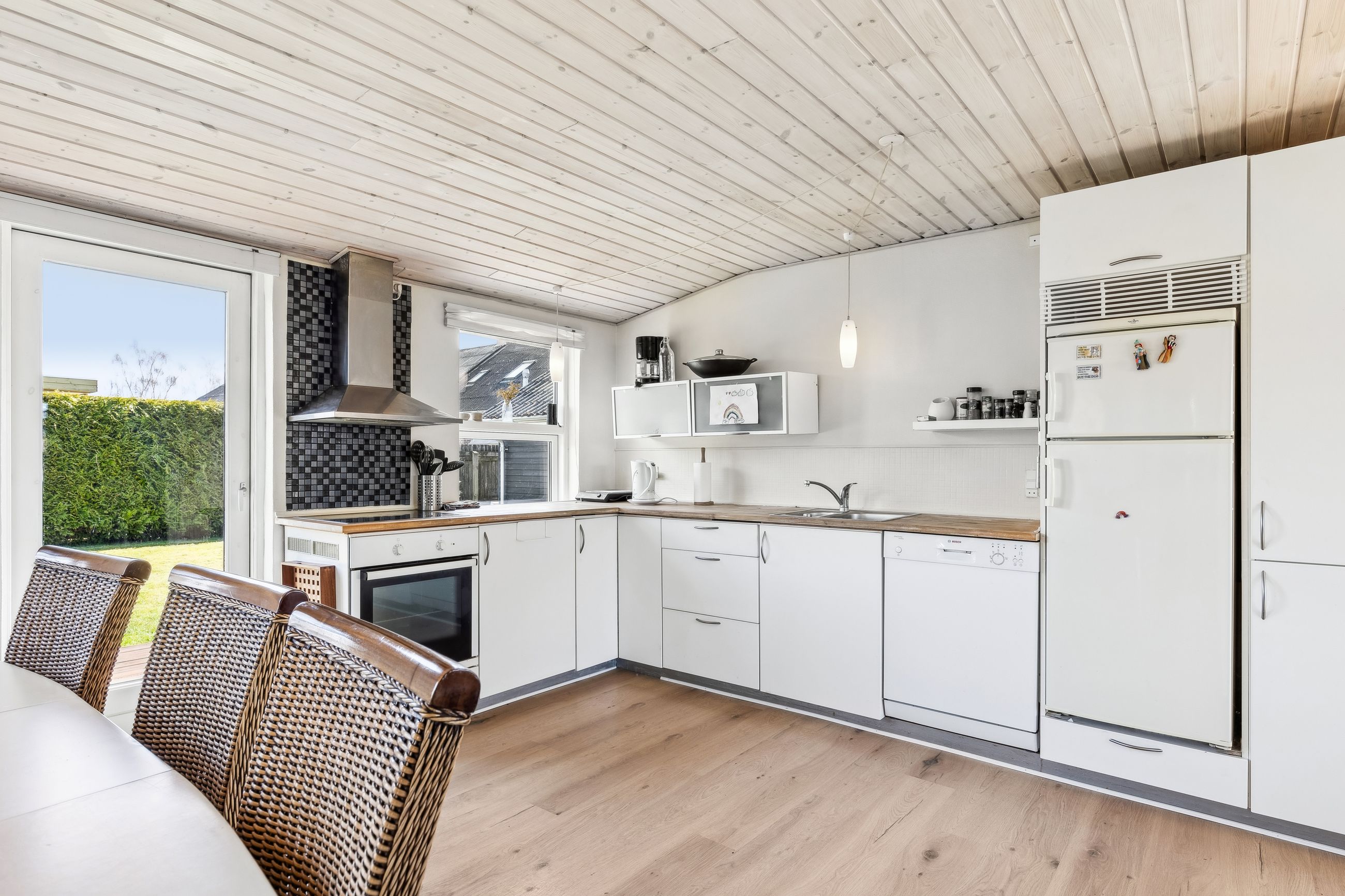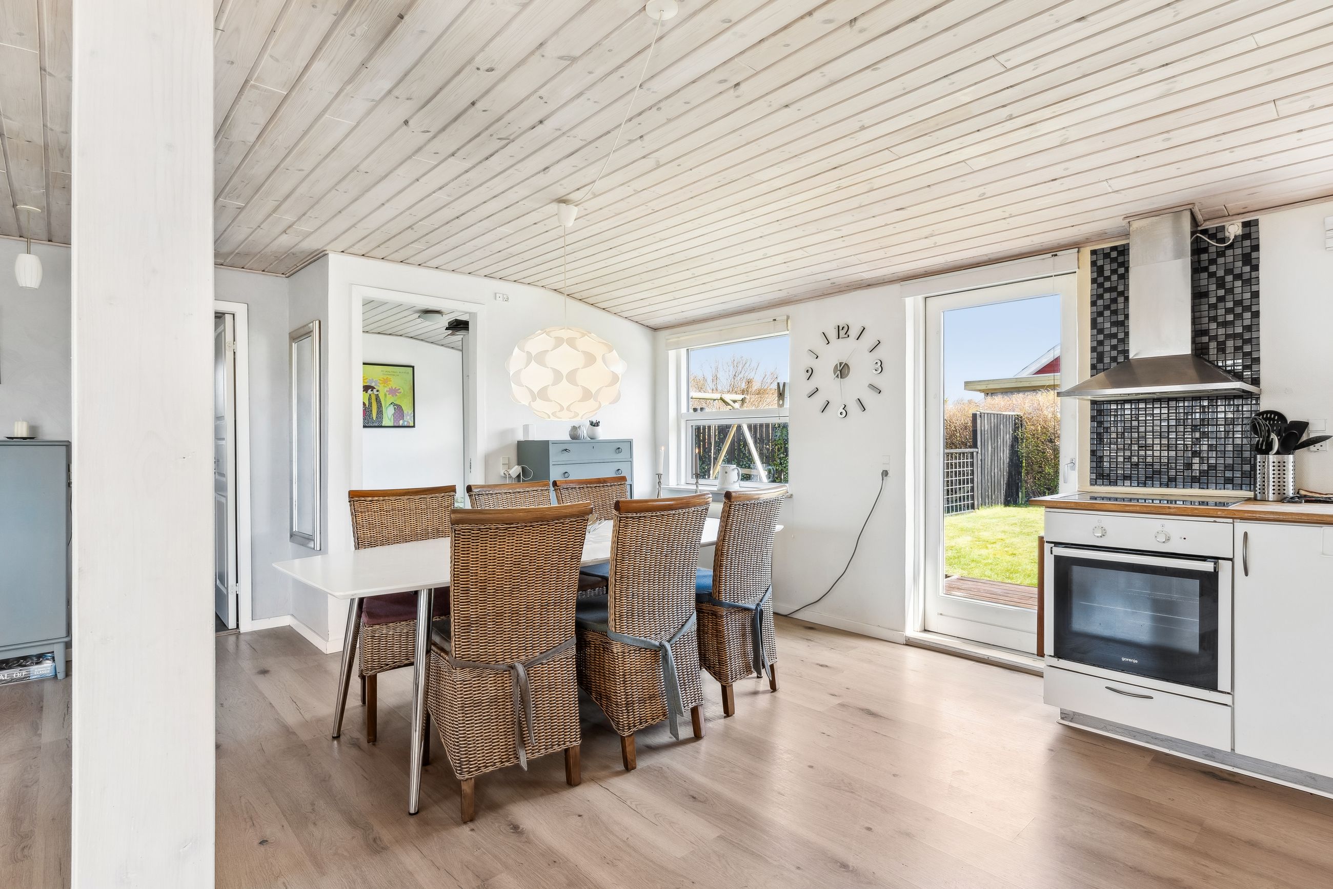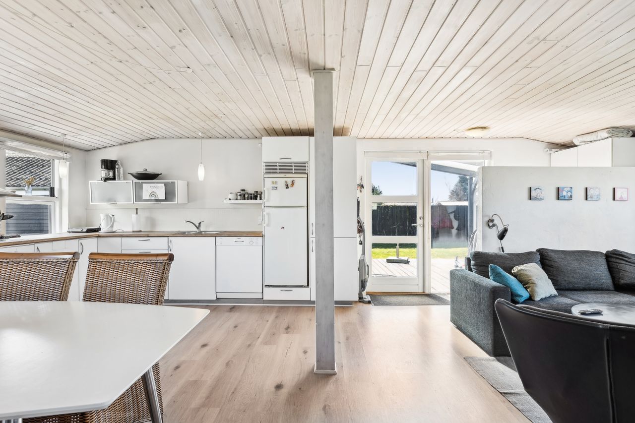 Når du træder ind i huset, mødes du af et lyst og åbent køkken, hvor du nemt kan trylle lækre måltider frem, mens du nyder den hyggelige atmosfære. Her er masser af plads til både madlavning og samvær, og fra køkkenet er der direkte adgang til den overdækkede terrasse, hvor du kan sidde i ly for regnen og stadig nyde udsigten over haven. Denne terrasse er en lille oase, perfekt til at starte dagen med en god kop kaffe eller afslutte den med en uforglemmelig middag i godt selskab.