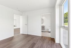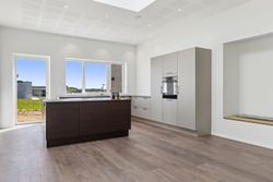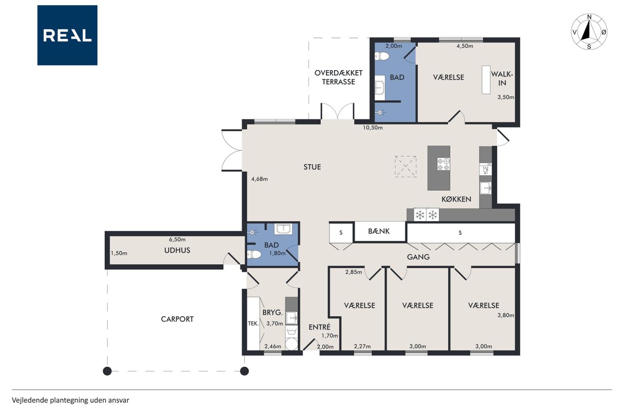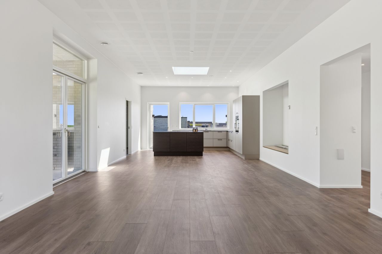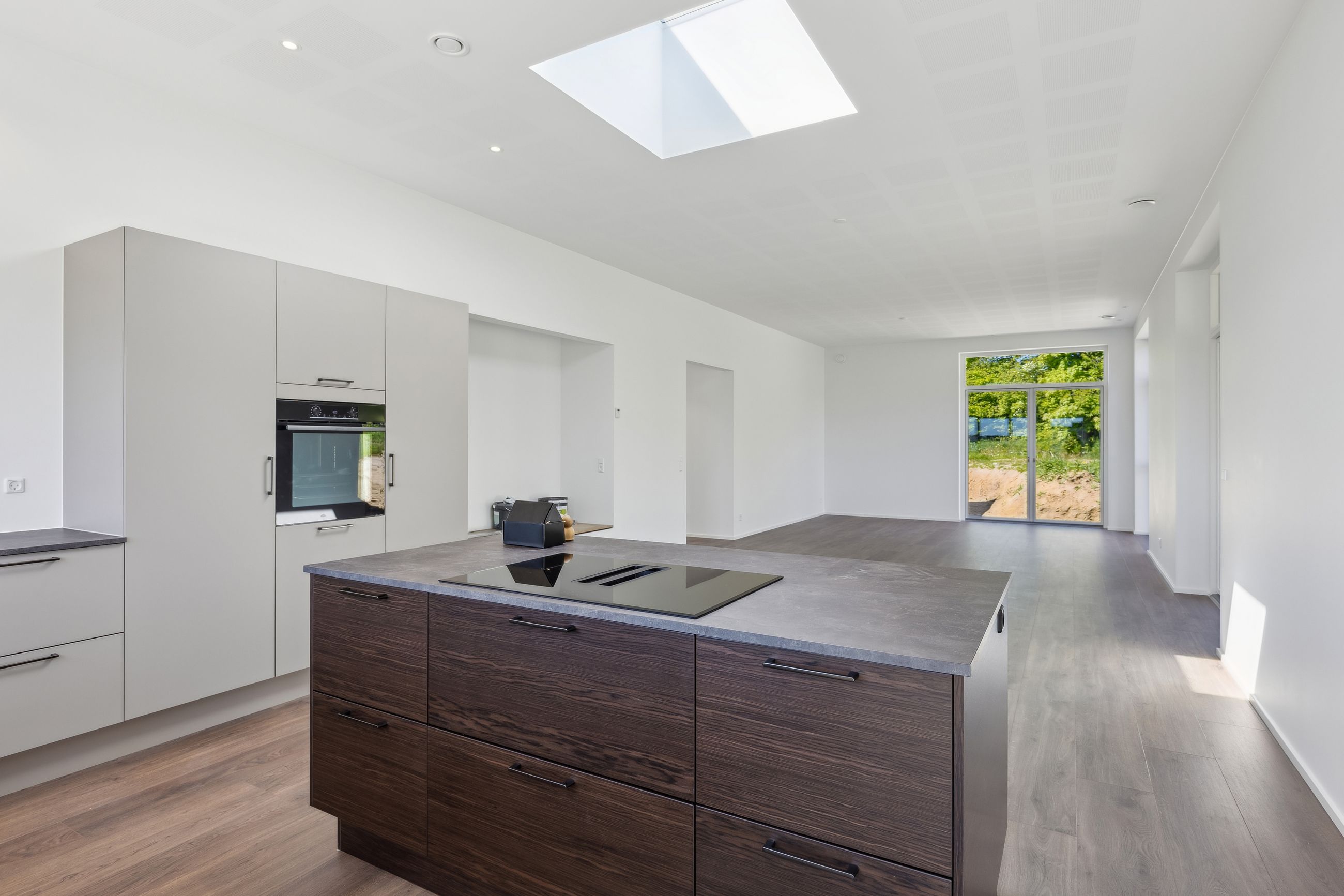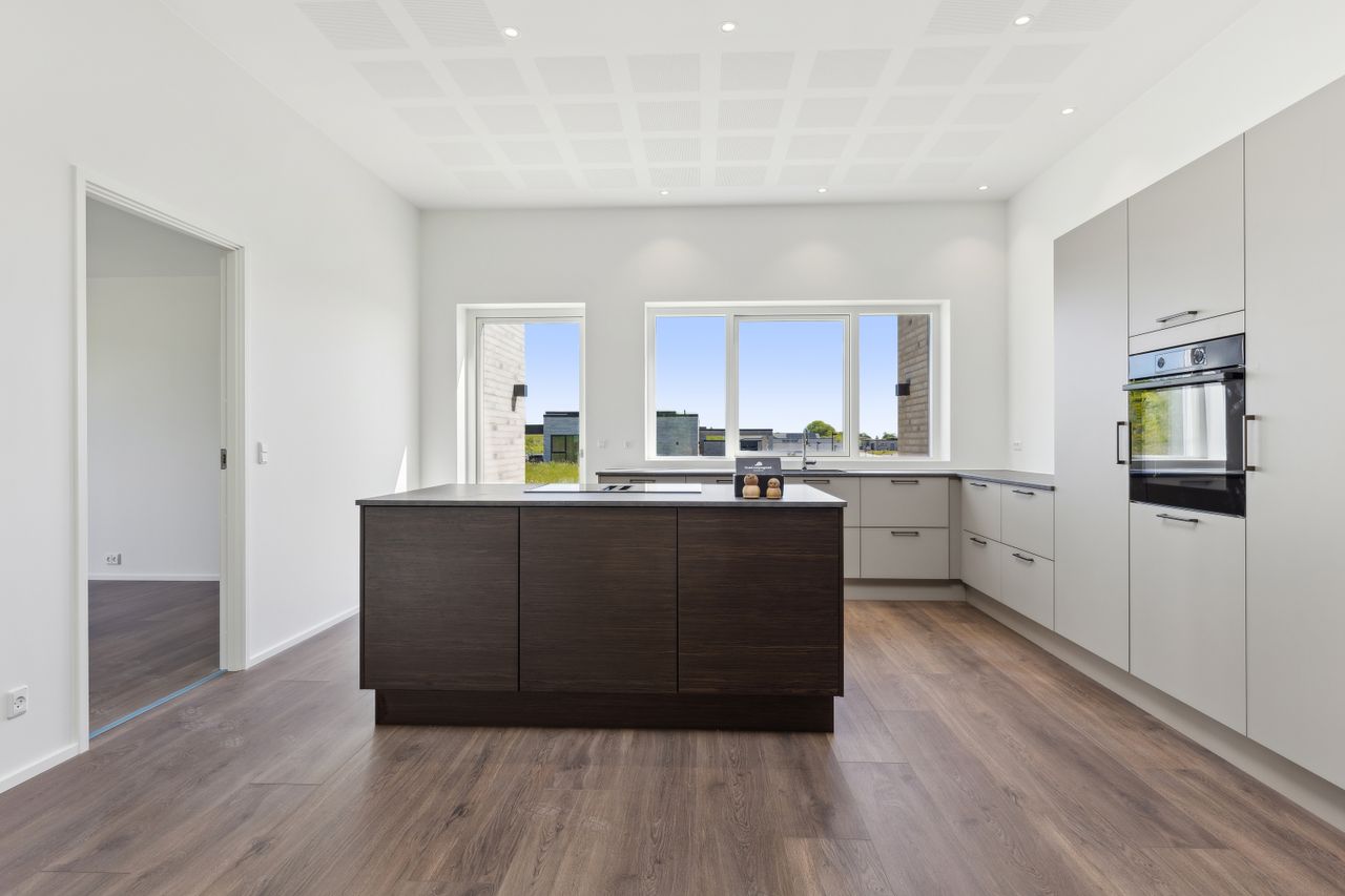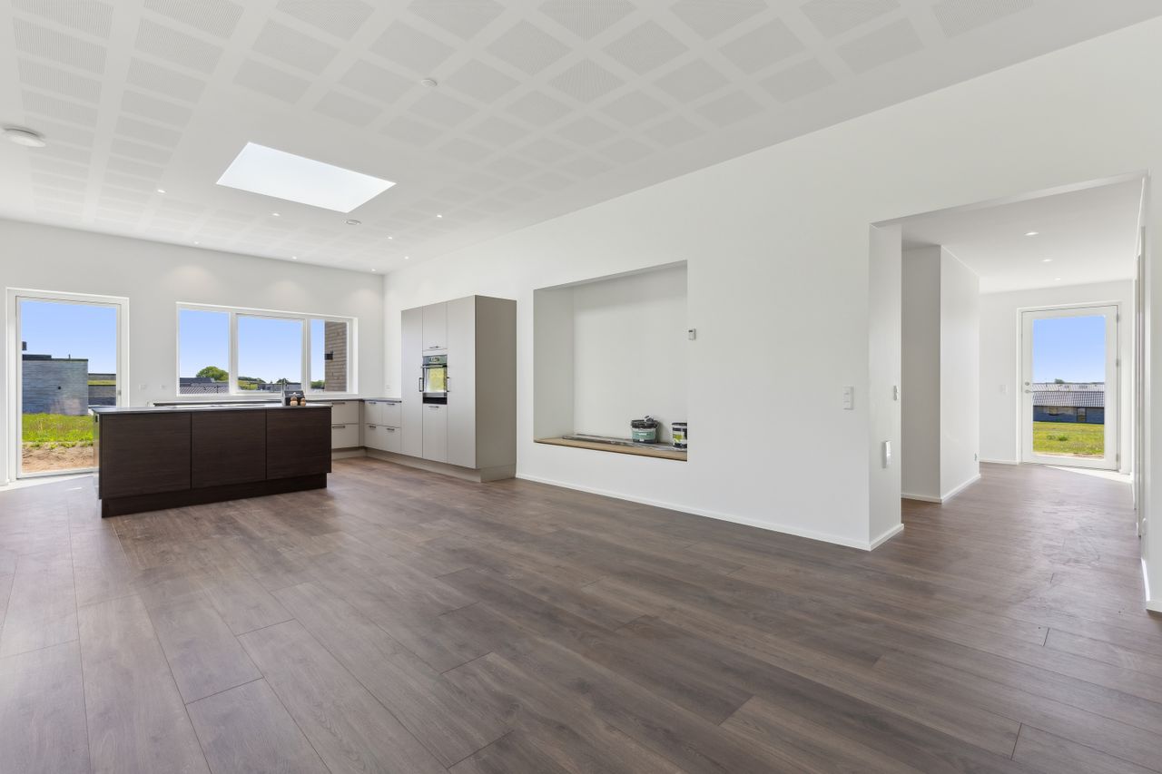 Huset byder på en rummelig og gennemtænkt planløsning, hvor både funktionalitet og lysindfald er i fokus. Der er to badeværelser, fire værelser og et stort åbent køkken-alrum, der går hånd i hånd med en lys stue. Det store vinduesparti giver masser af naturligt lys, og den hyggelige alkove i køkkenalrummet skaber et perfekt hjørne til afslapning. Soveværelset har en velindrettet walk-in og eget badeværelse, som giver ekstra komfort.