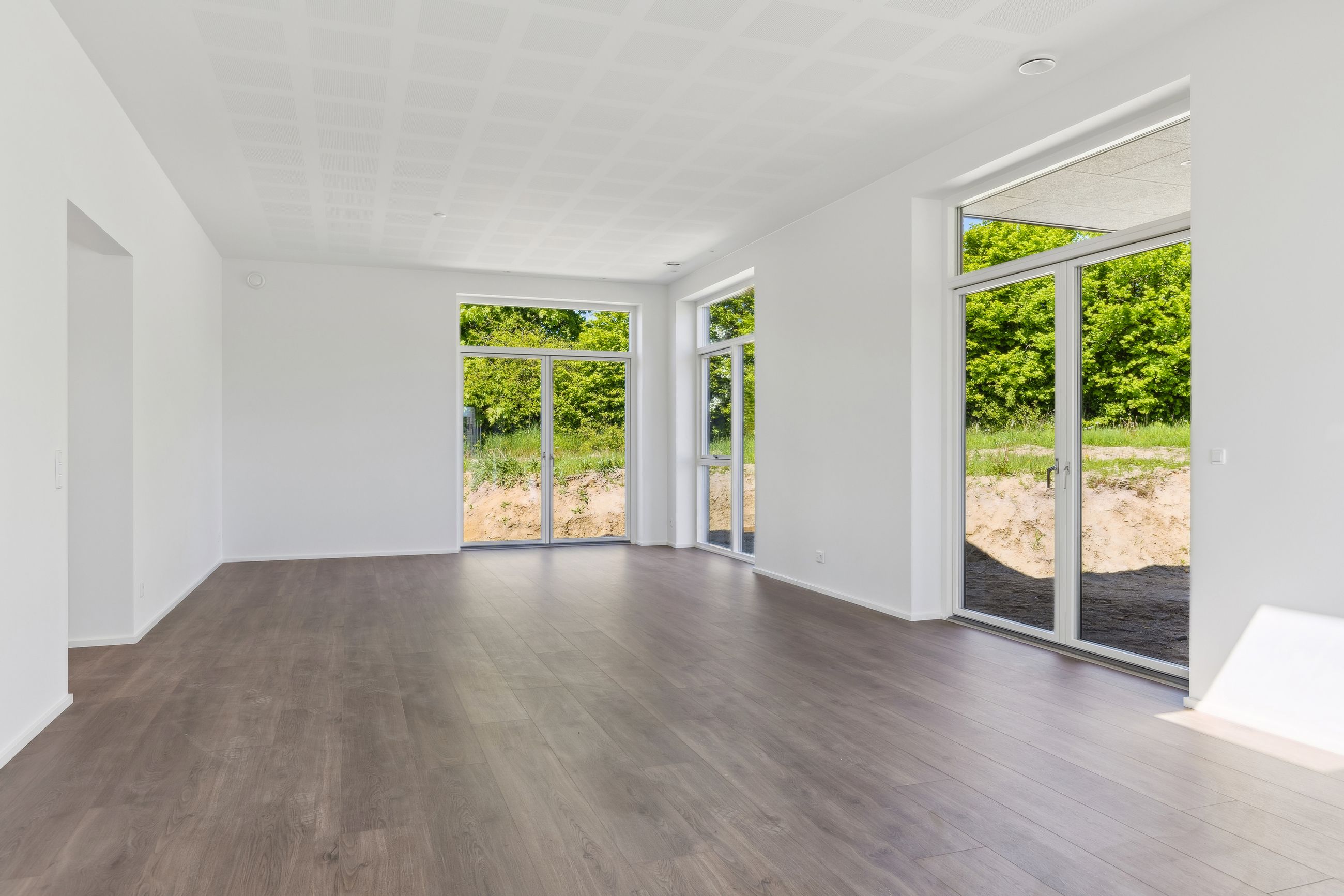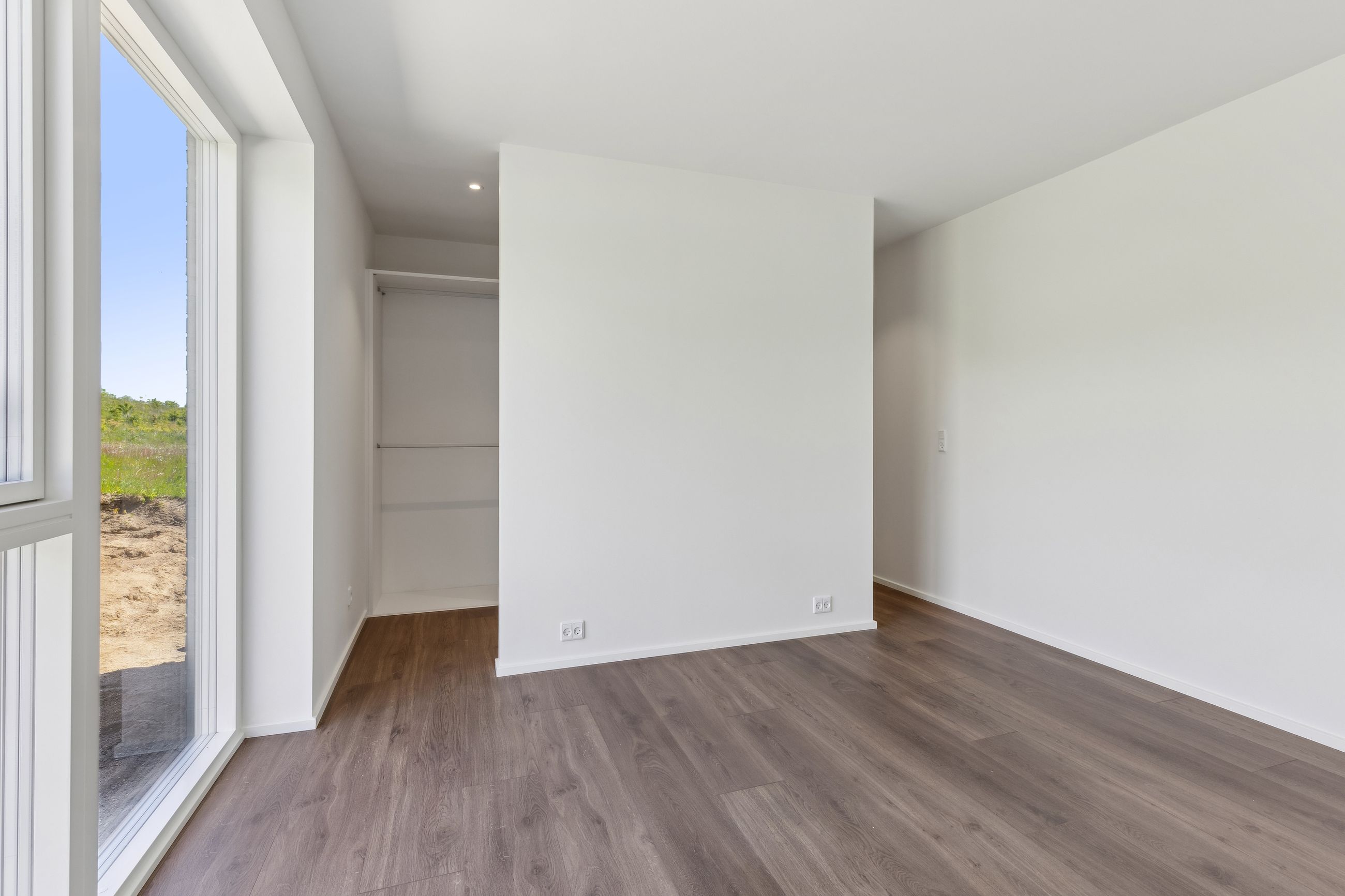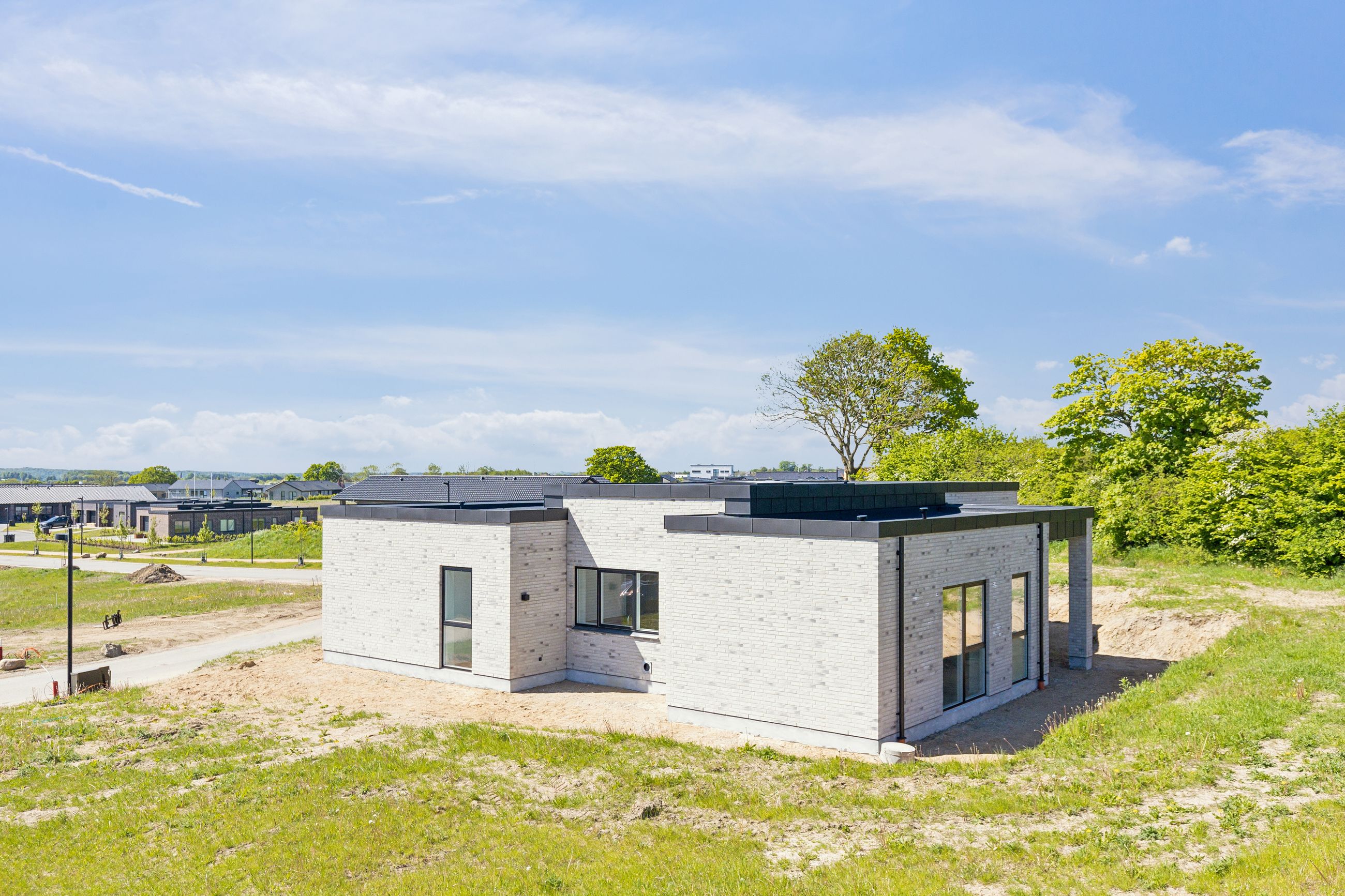 Udenfor får du en have og indkørsel, der endnu ikke er anlagt, hvilket giver dig mulighed for at sætte dit eget præg og skabe dit drømmeudendørsområde.