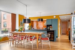Med sine 134 veludnyttede kvadratmeter byder boligen på både rummelighed og harmoni. Det åbne køkken-alrum skaber en naturlig ramme om hverdagen – her er plads til madlavning, nærvær og samtaler, mens lyset strømmer ind gennem store vinduespartier. De to soveværelser er lyse og indretningsvenlige, og badeværelset er funktionelt og stilrent, med både brus og vaskesøjle, som gør hverdagen nem.