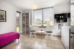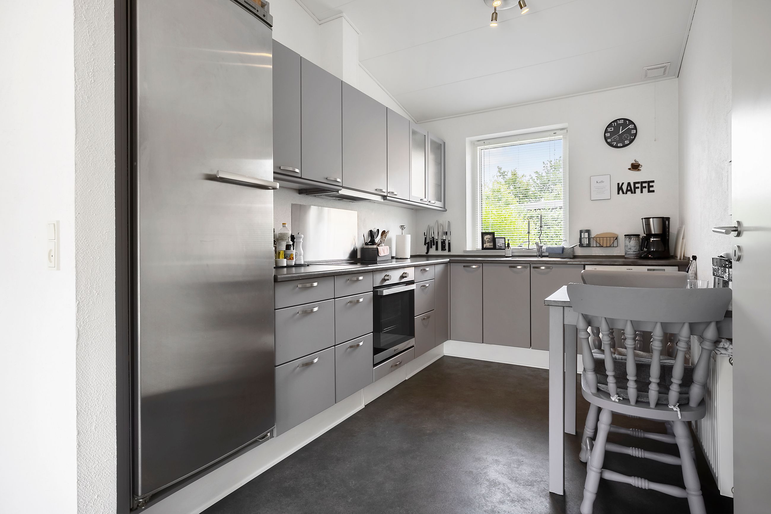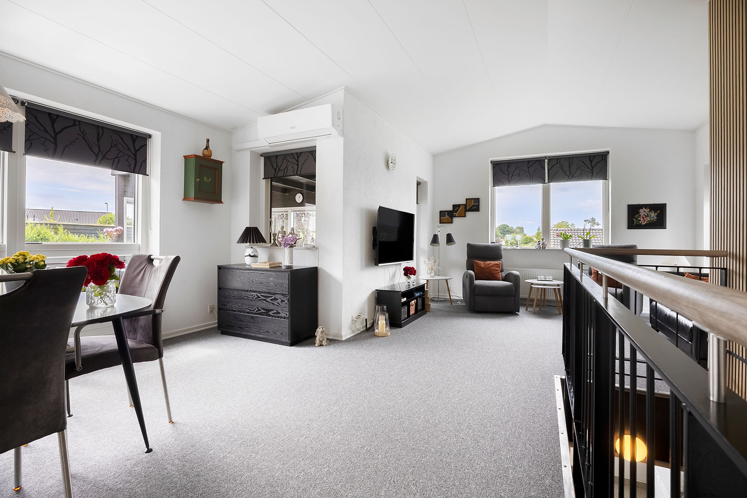 Boligen byder på et lyst og åbent opholds- og alrum, hvor stue og spisestue ligger i forbindelse med hinanden og skaber et naturligt samlingspunkt i hjemmet. Det åbne køkken har en hyggelig lille spiseplads, perfekt til morgenkaffen eller en hurtig hverdagsmiddag.