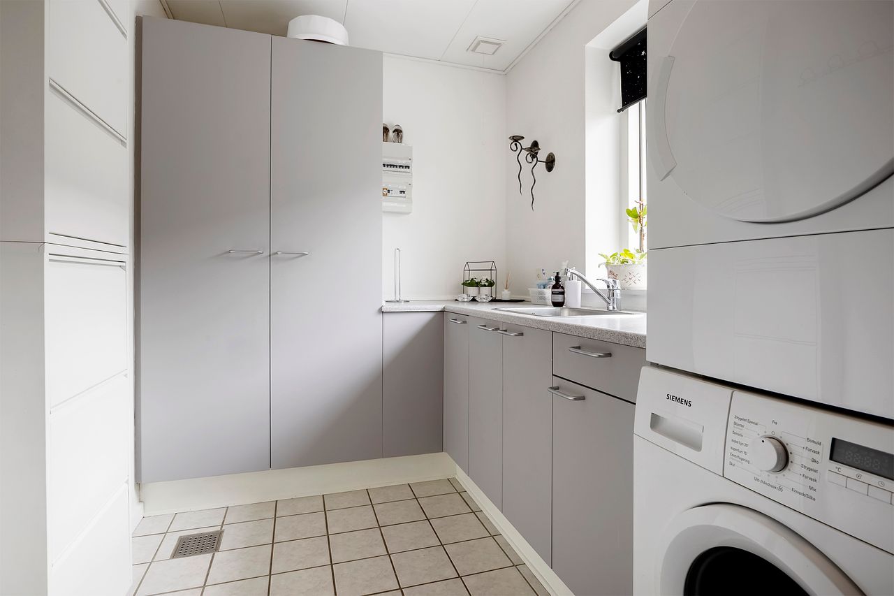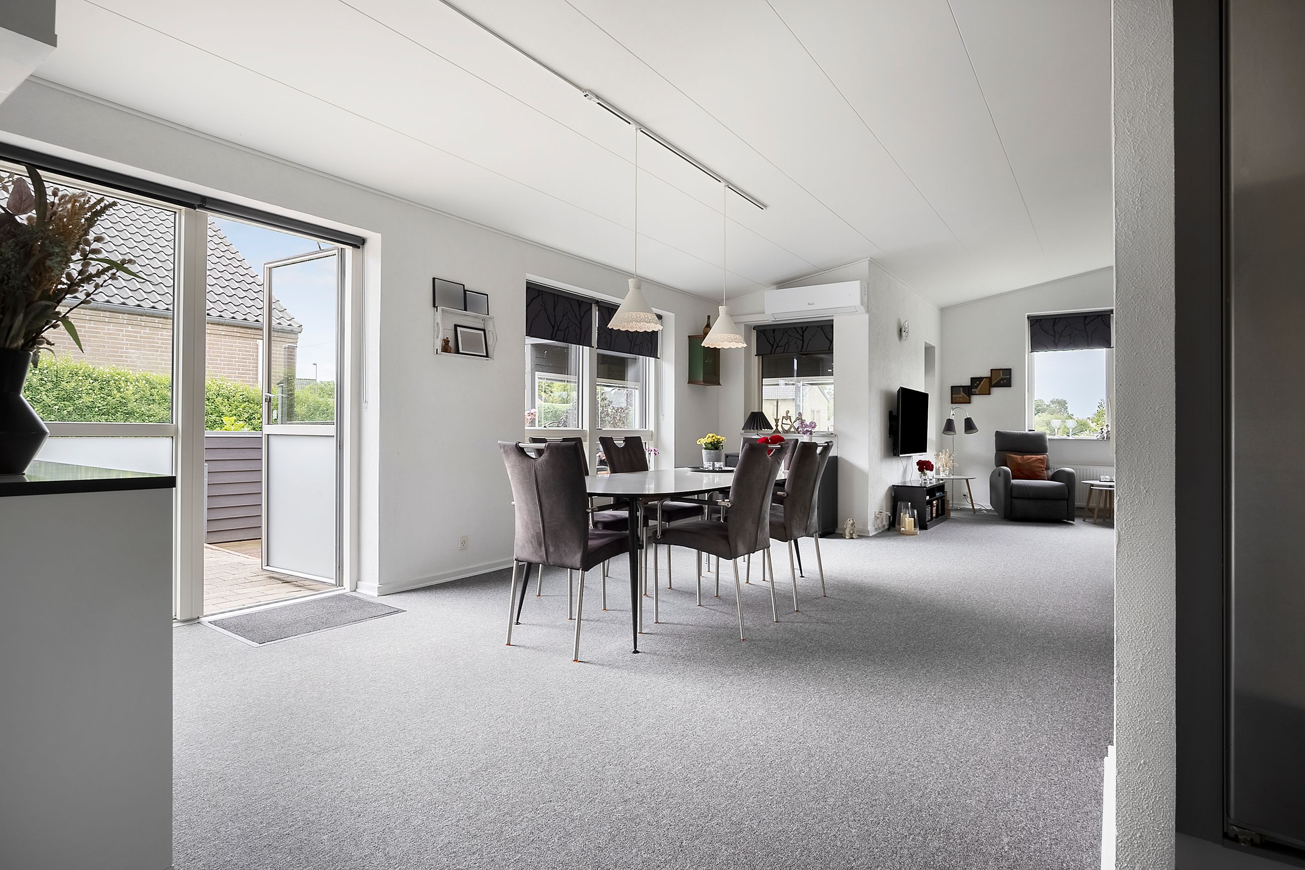Spisestuen er lys og indbydende med plads til både hverdag og gæster, og de store vinduer giver et dejligt lysindfald, der skaber en behagelig atmosfære i hele hjemmet.