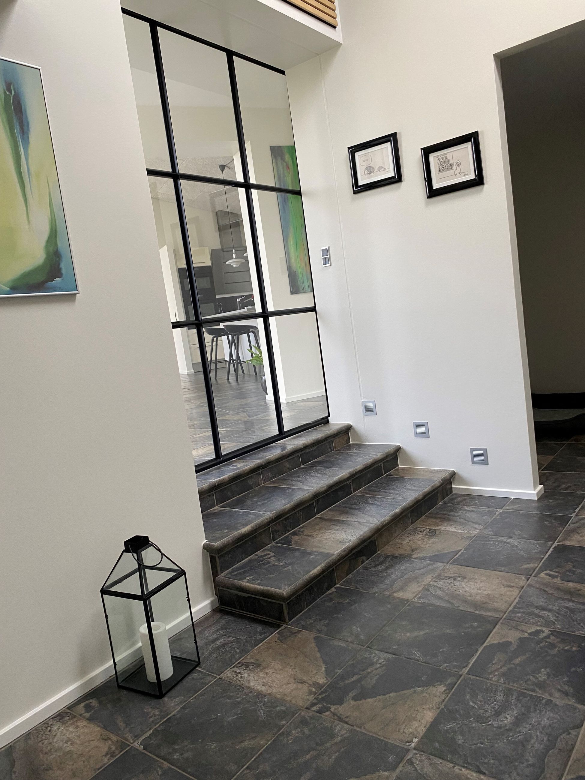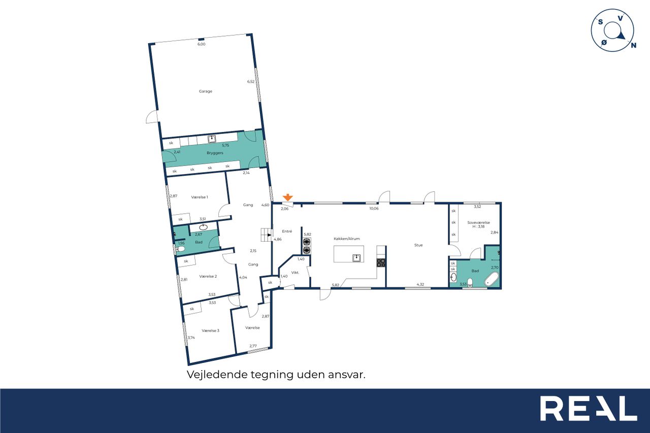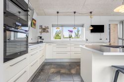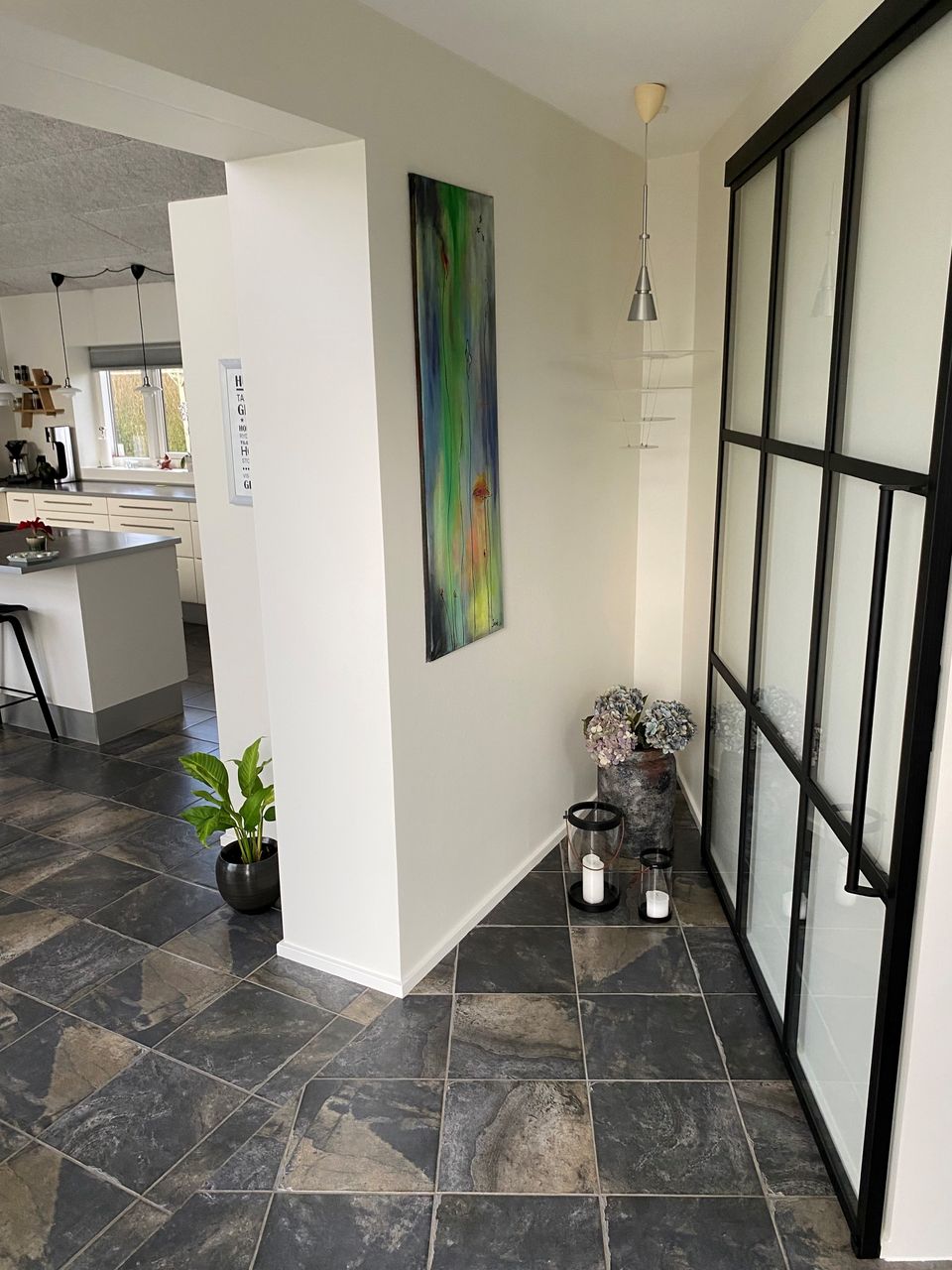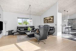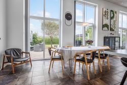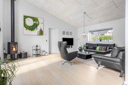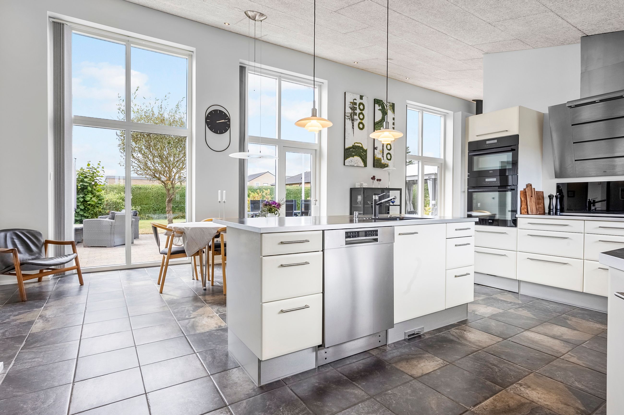 Indendørs mødes man af et lyst og åbent køkken-alrum, hvor loft til kip og store vinduespartier skaber en fantastisk rumfornemmelse og et naturligt lysindfald dagen igennem. Her er plads til både hverdag og fest – med viktualierum og masser af albuerum i det moderne køkken, som glider ubesværet over i hjemmets hyggelige stue. Brændeovnen tilføjer varme og stemning på de køligere dage og gør rummet til et naturligt samlingspunkt.
