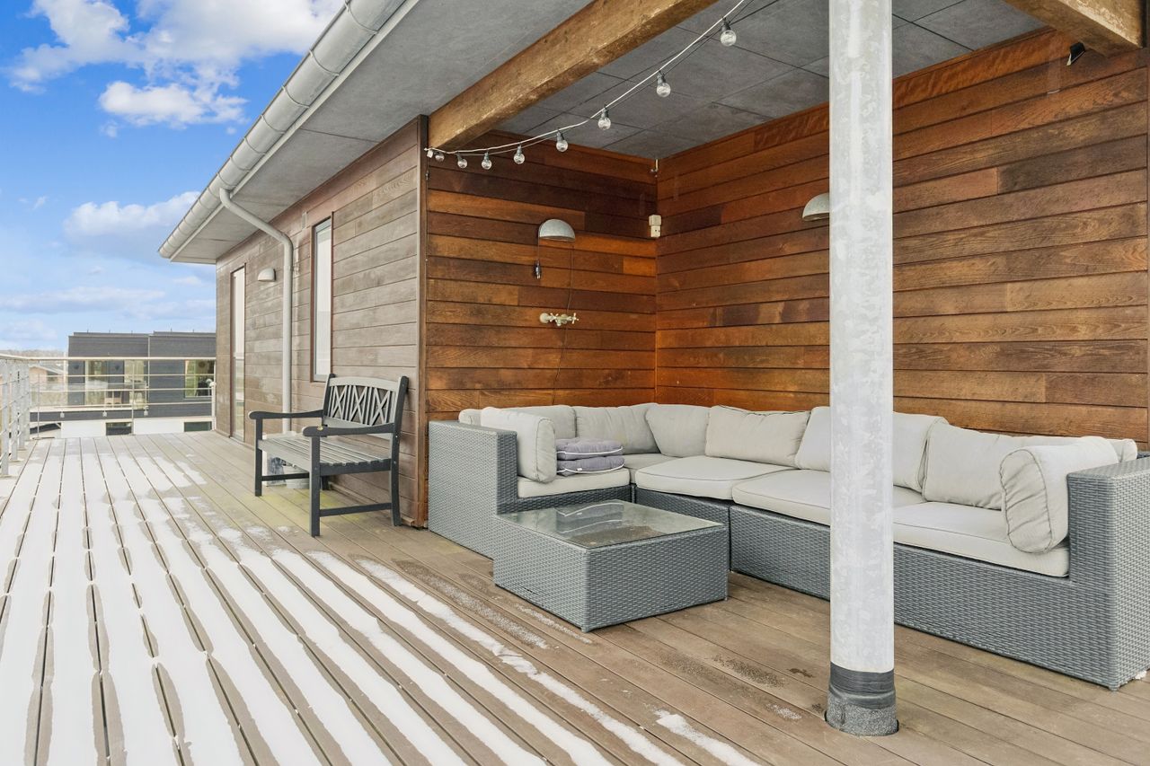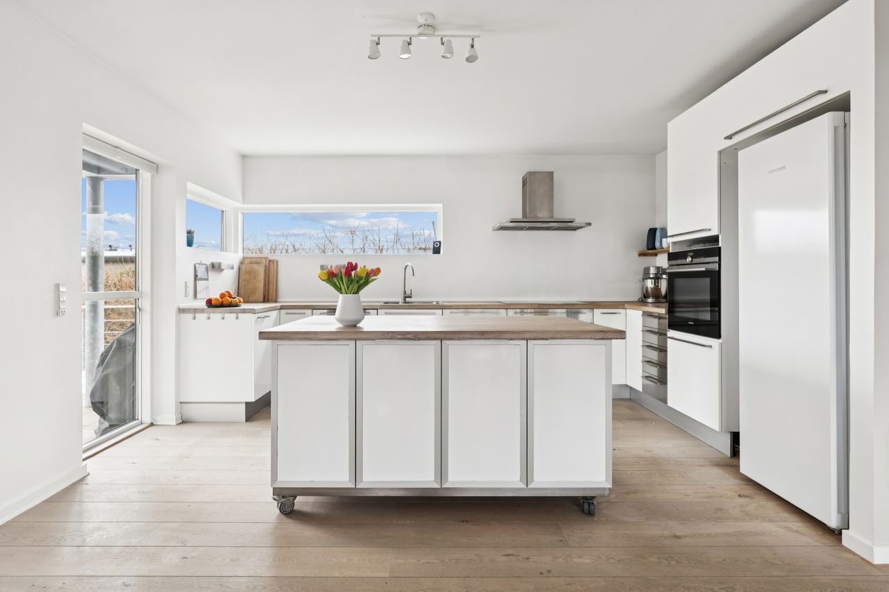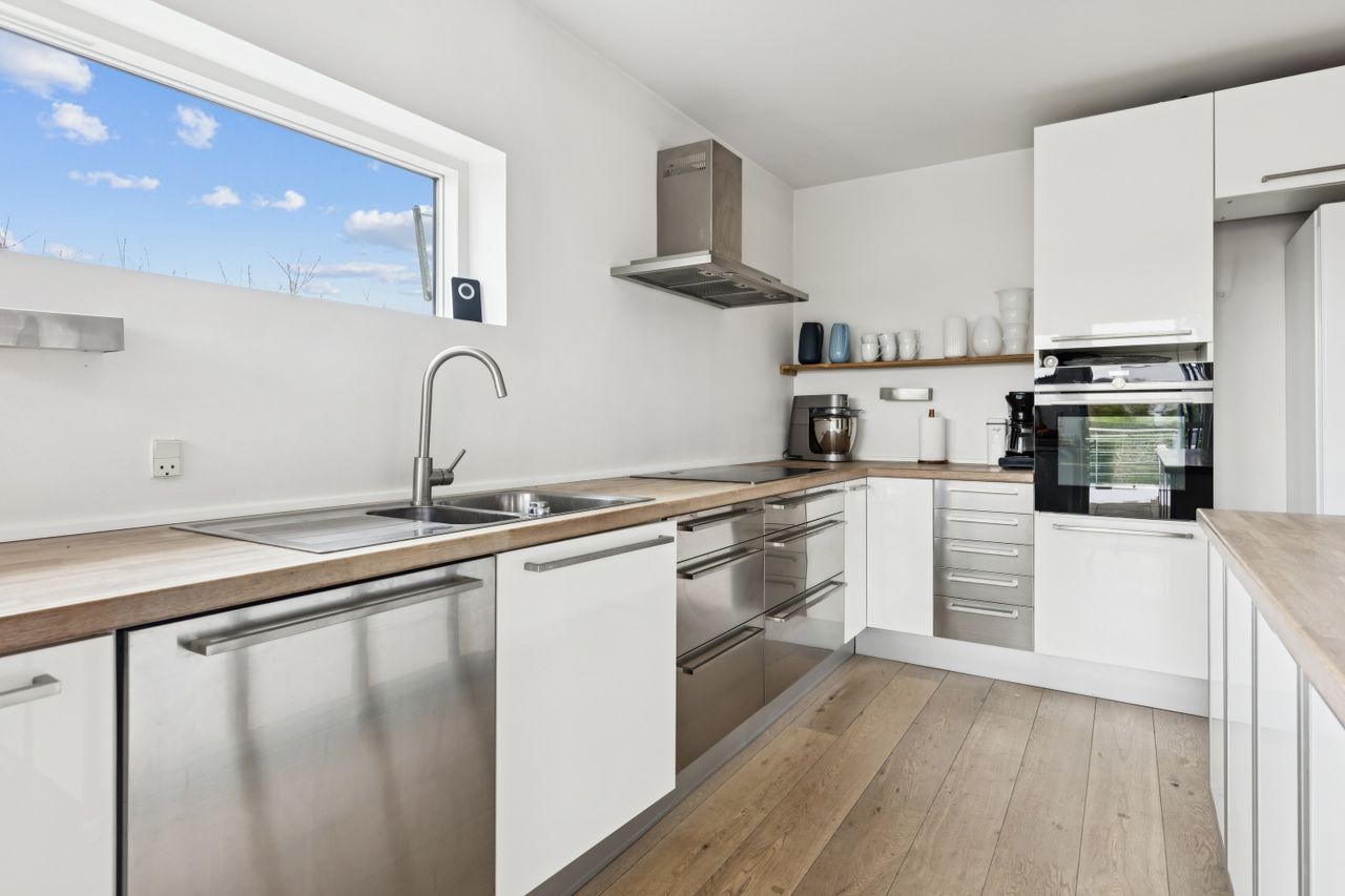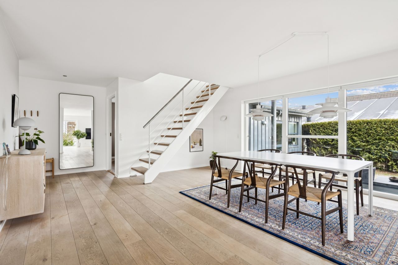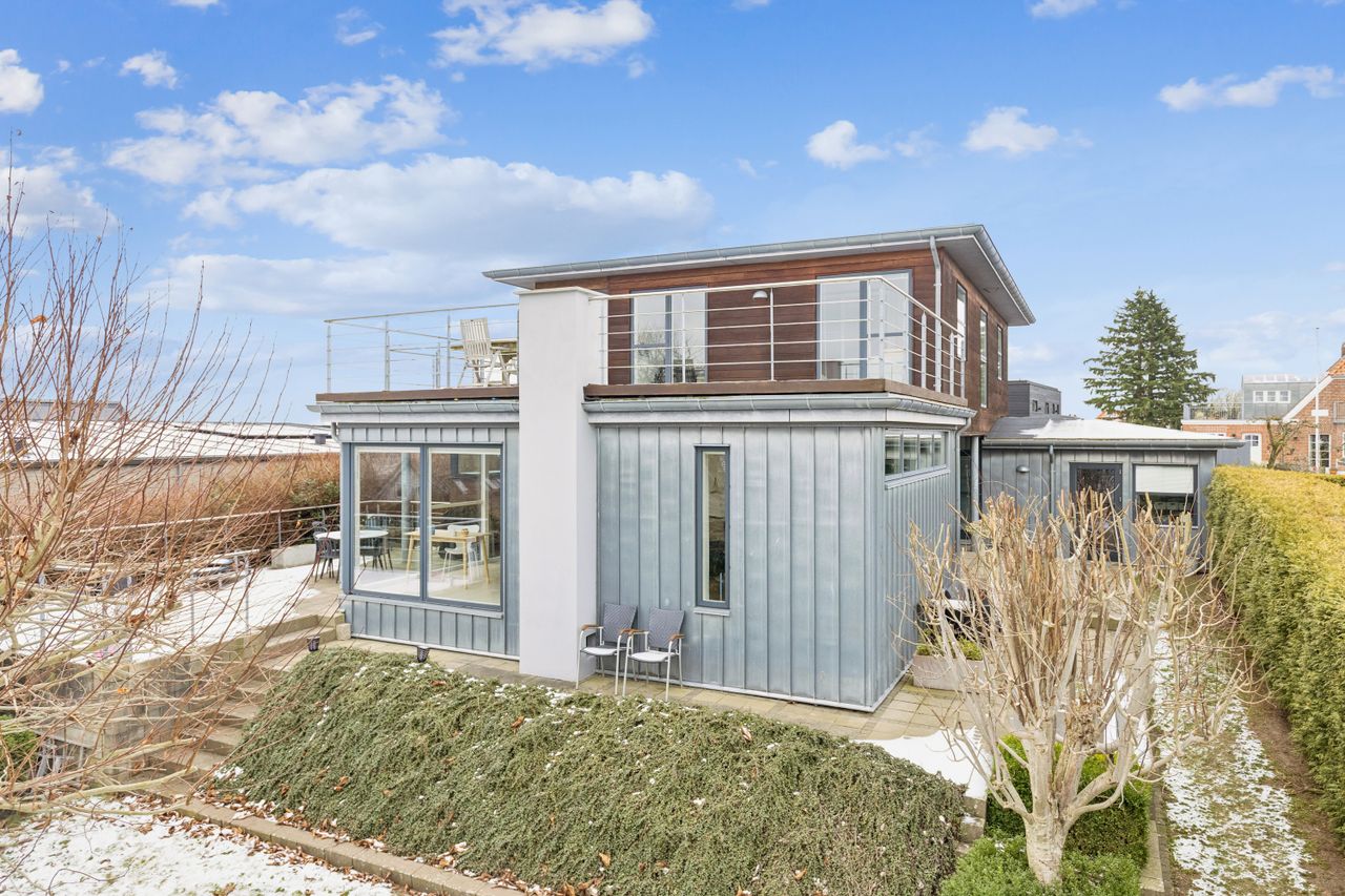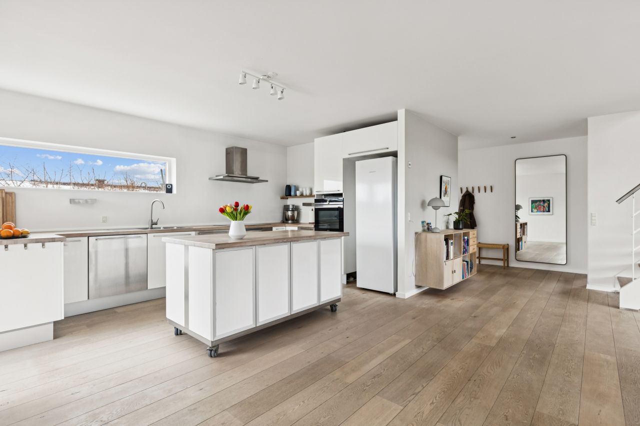 Hjemmet åbner sig naturligt op mod det store køkkenalrum, som indbyder til både hverdagsliv og fester. Køkken-alrummet glider elegant over i stuen, hvorfra der er udsigt til midtbyen og Urhøj. Fra både køkken-alrum og stue er der direkte udgang til terrasserne. I det sydvendte gårdhavemiljø er der adgang til det isolerede hobbyrum og til værkstedet.