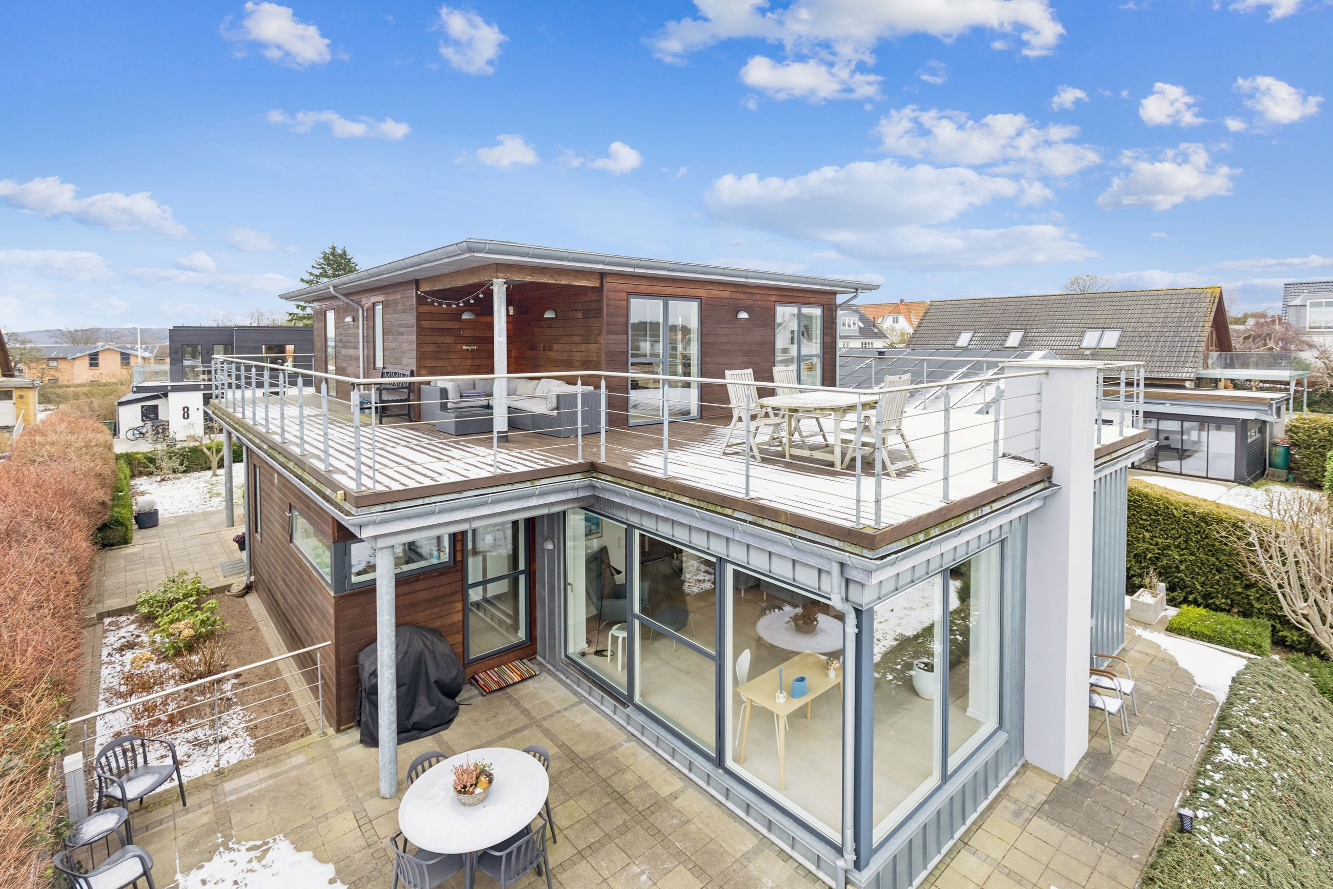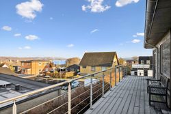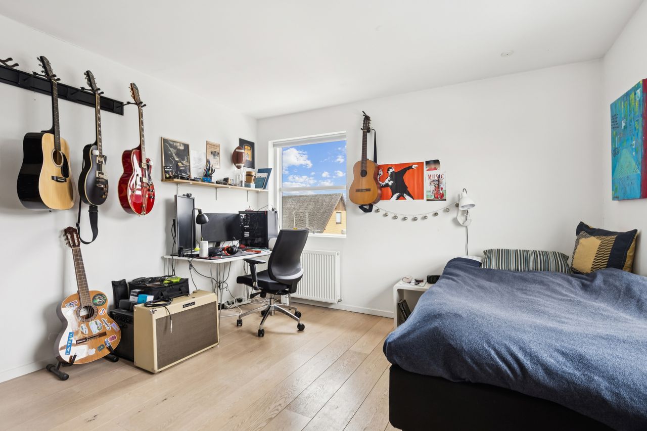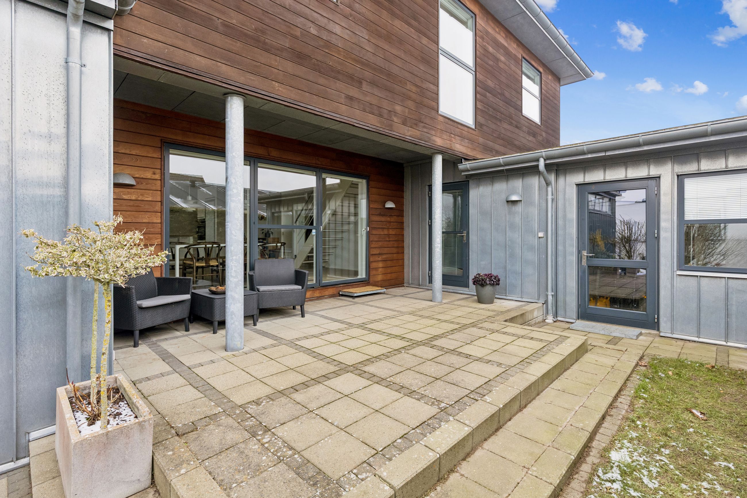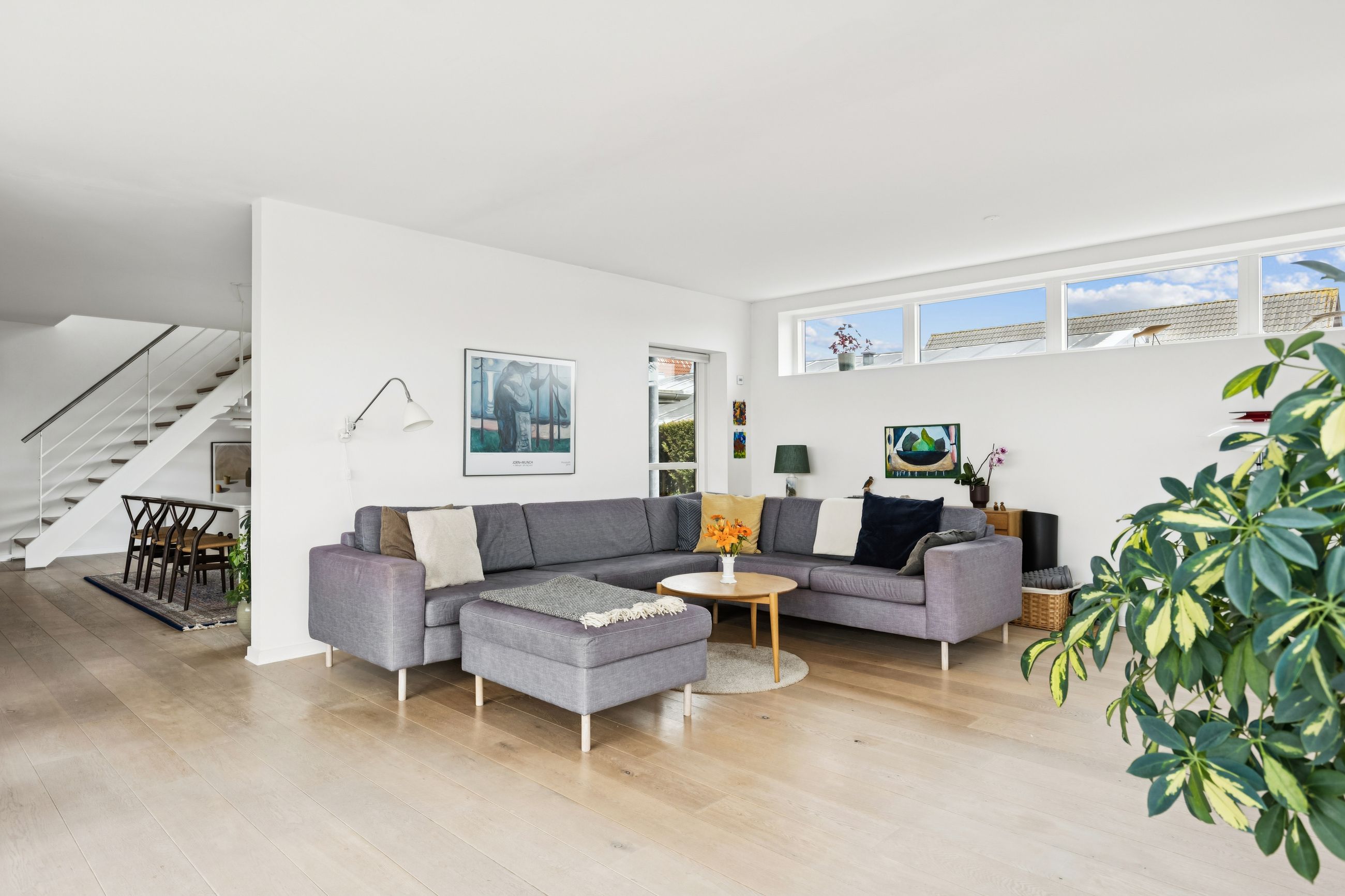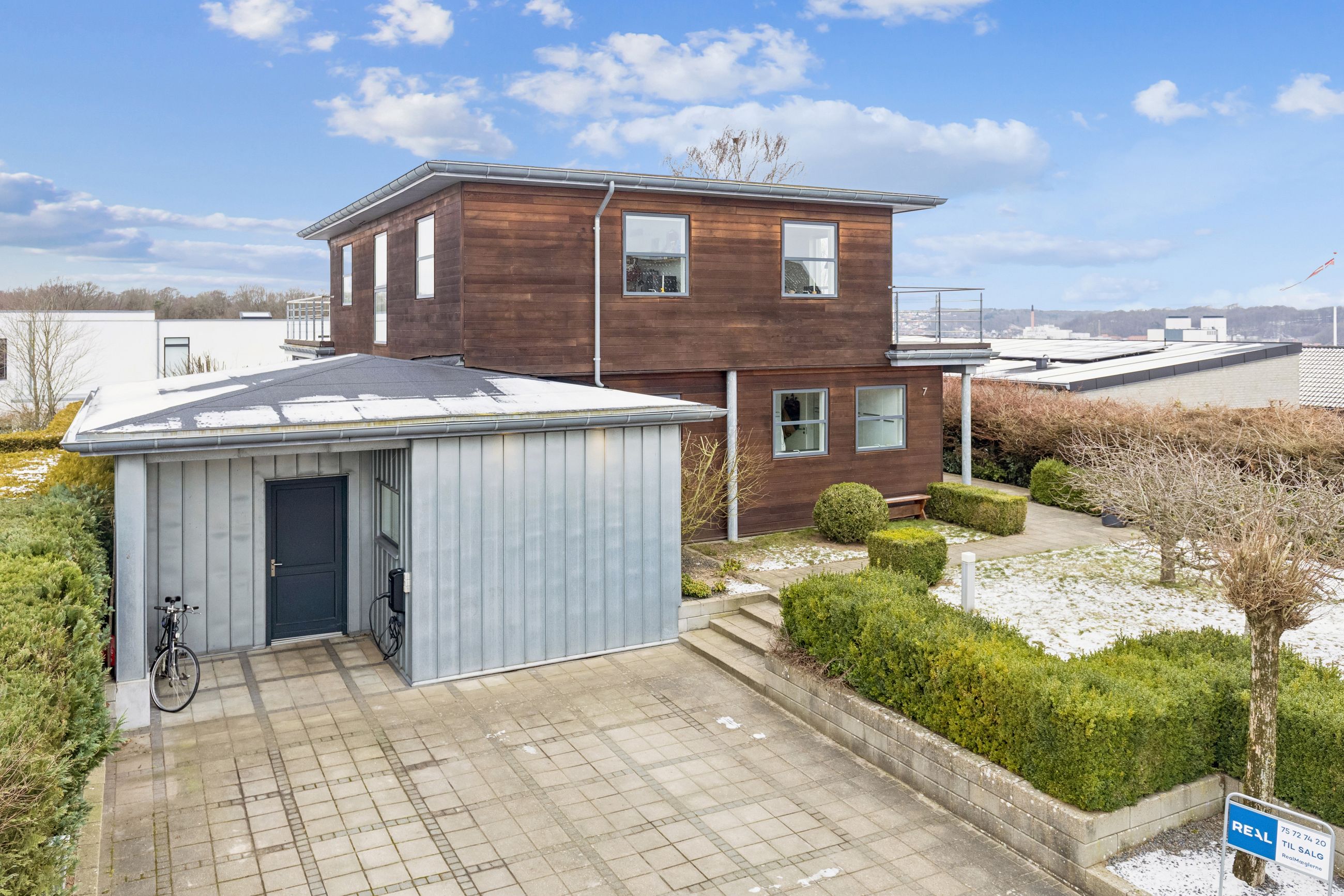 Hjemmet åbner sig naturligt op mod det store køkkenalrum, som indbyder til både hverdagsliv og fester. Køkken-alrummet glider elegant over i stuen, hvorfra der er udsigt til midtbyen og Urhøj. Fra både køkken-alrum og stue er der direkte udgang til terrasserne. I det sydvendte gårdhavemiljø er der adgang til det isolerede hobbyrum og til værkstedet.