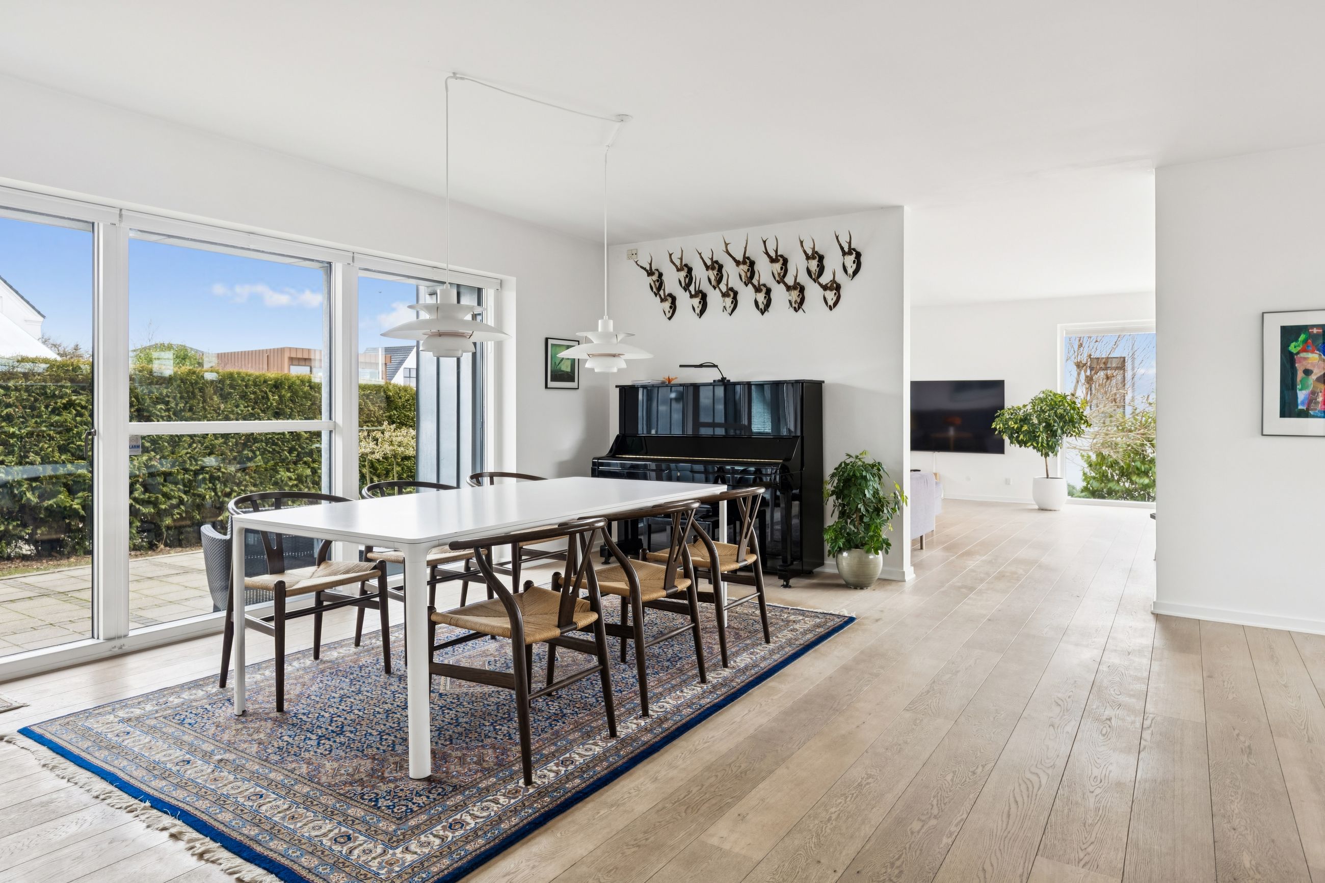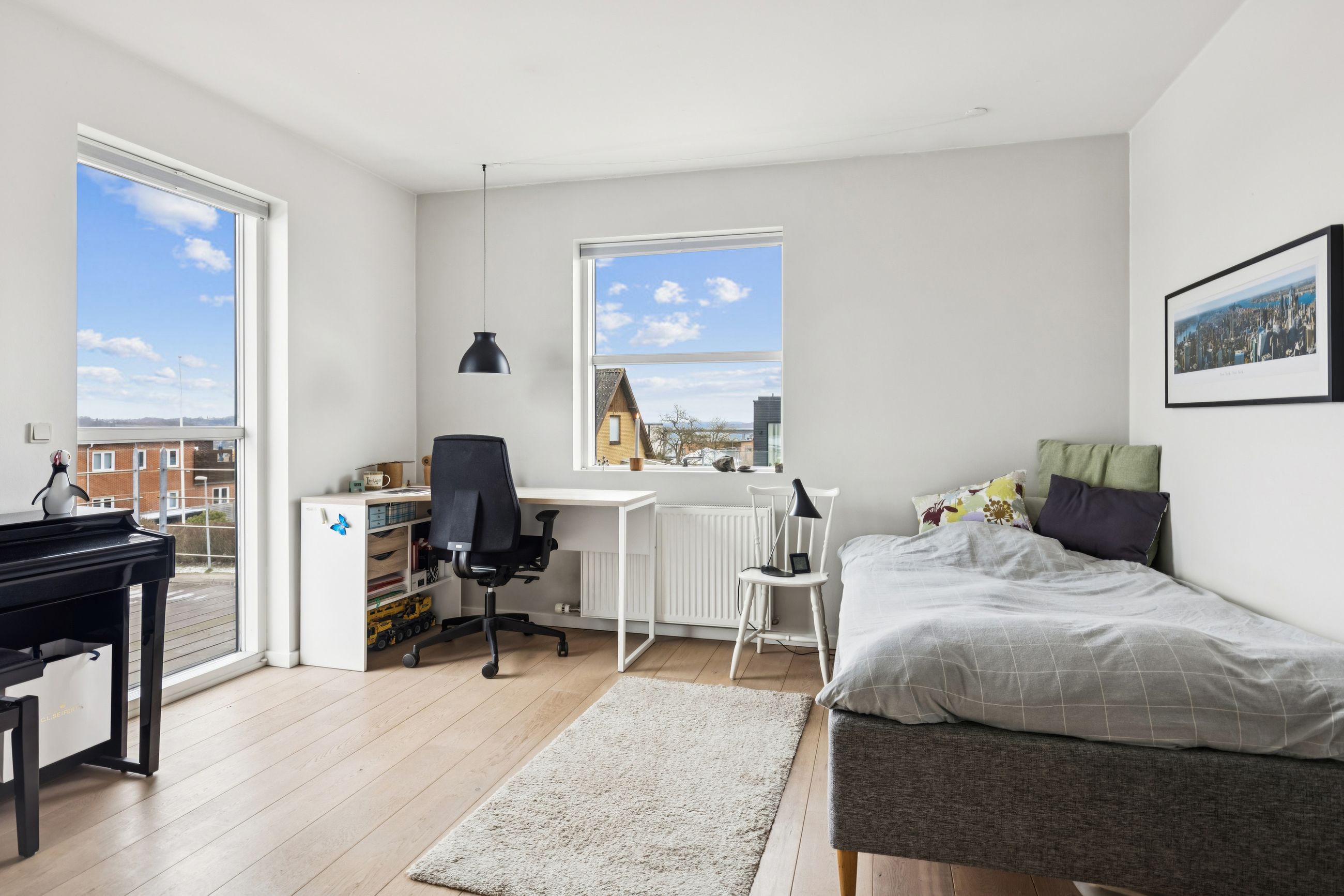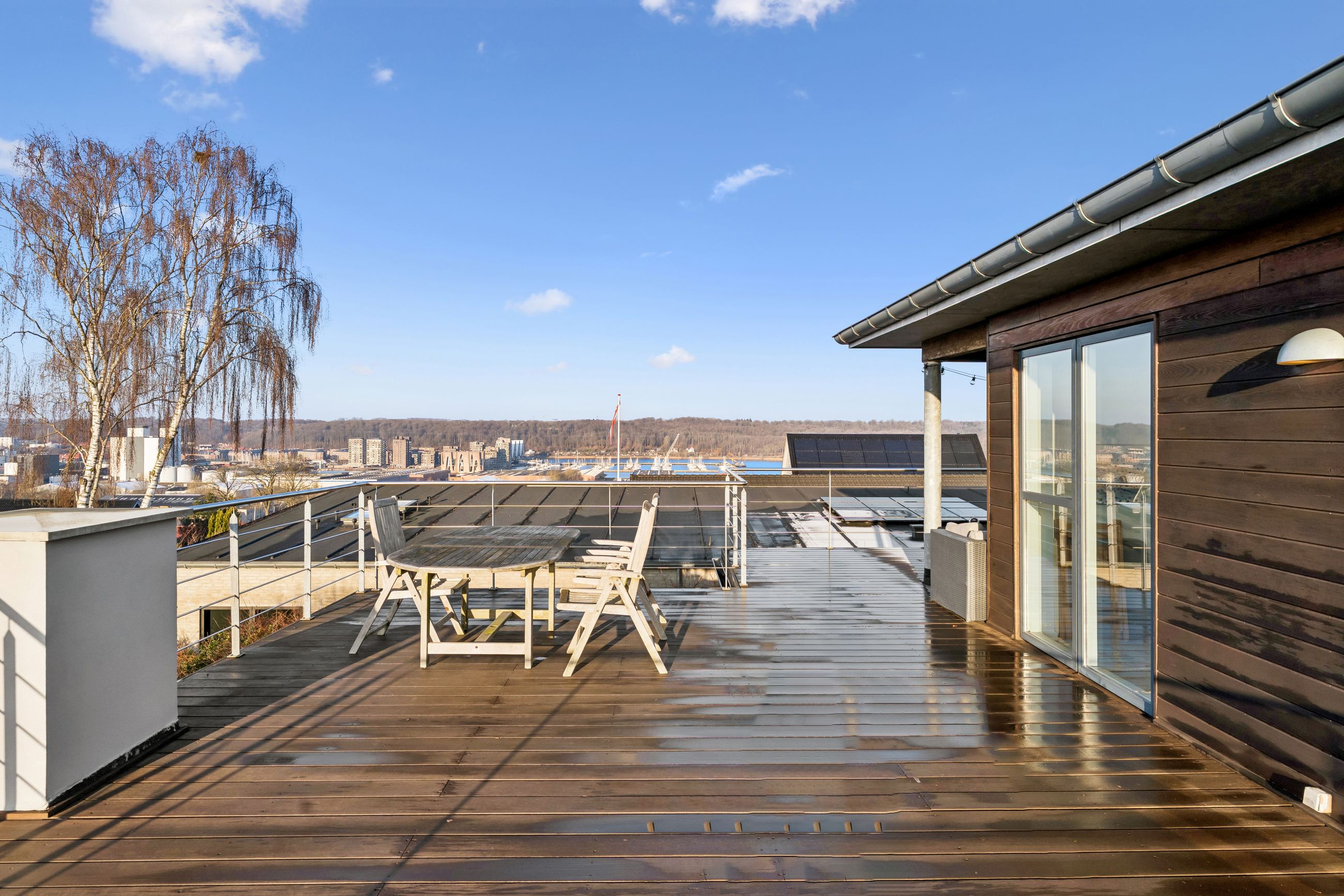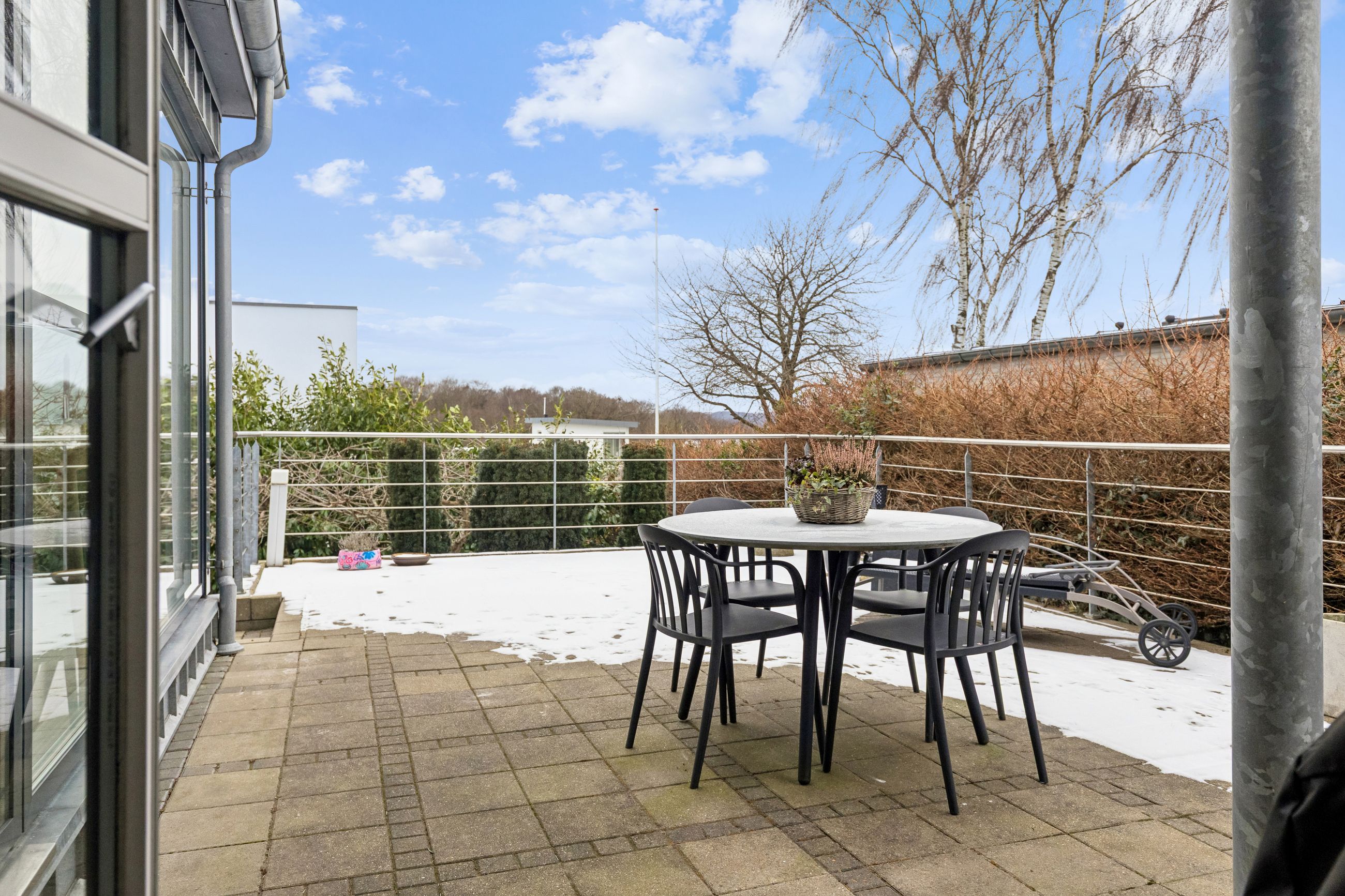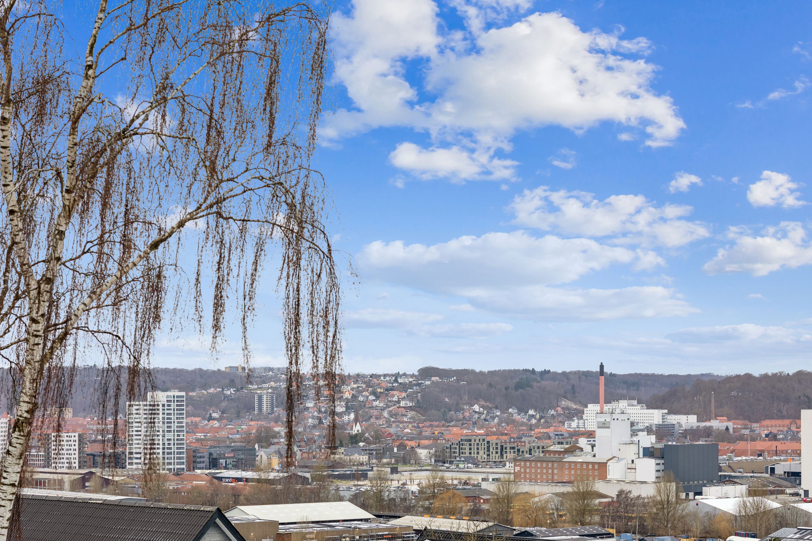 Hjemmet åbner sig naturligt op mod det store køkkenalrum, som indbyder til både hverdagsliv og fester. Køkken-alrummet glider elegant over i stuen, hvorfra der er udsigt til midtbyen og Urhøj. Fra både køkken-alrum og stue er der direkte udgang til terrasserne. I det sydvendte gårdhavemiljø er der adgang til det isolerede hobbyrum og til værkstedet.