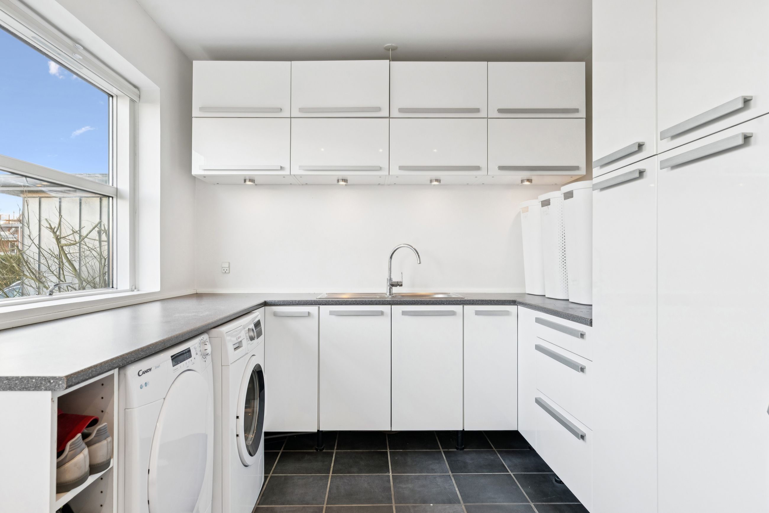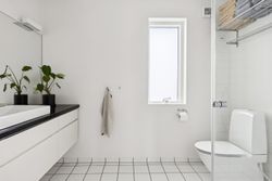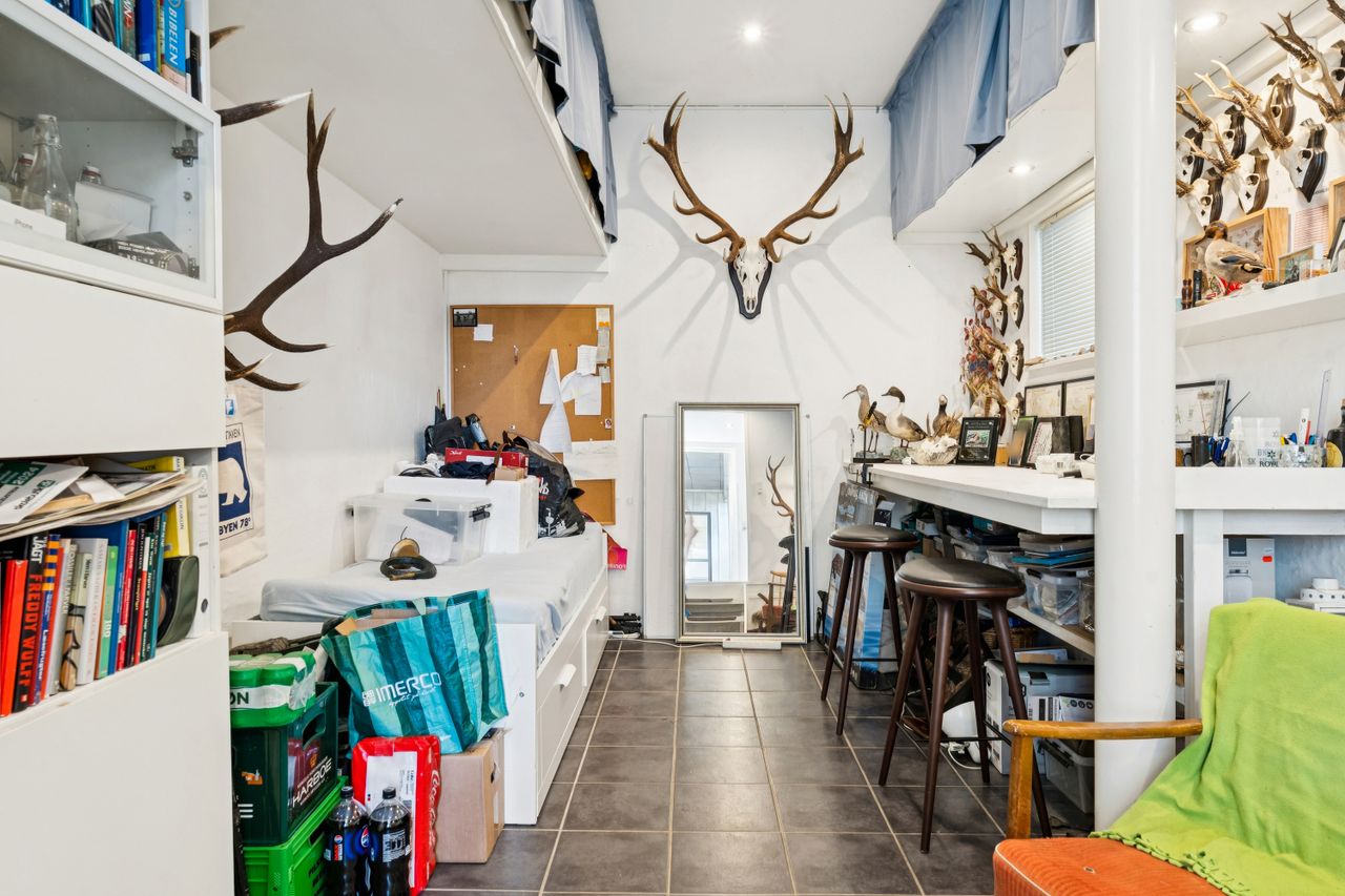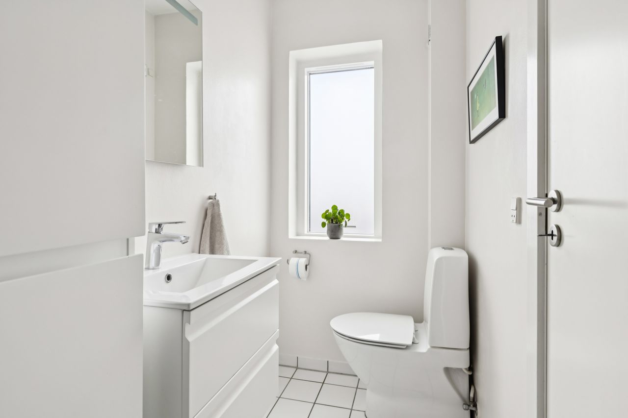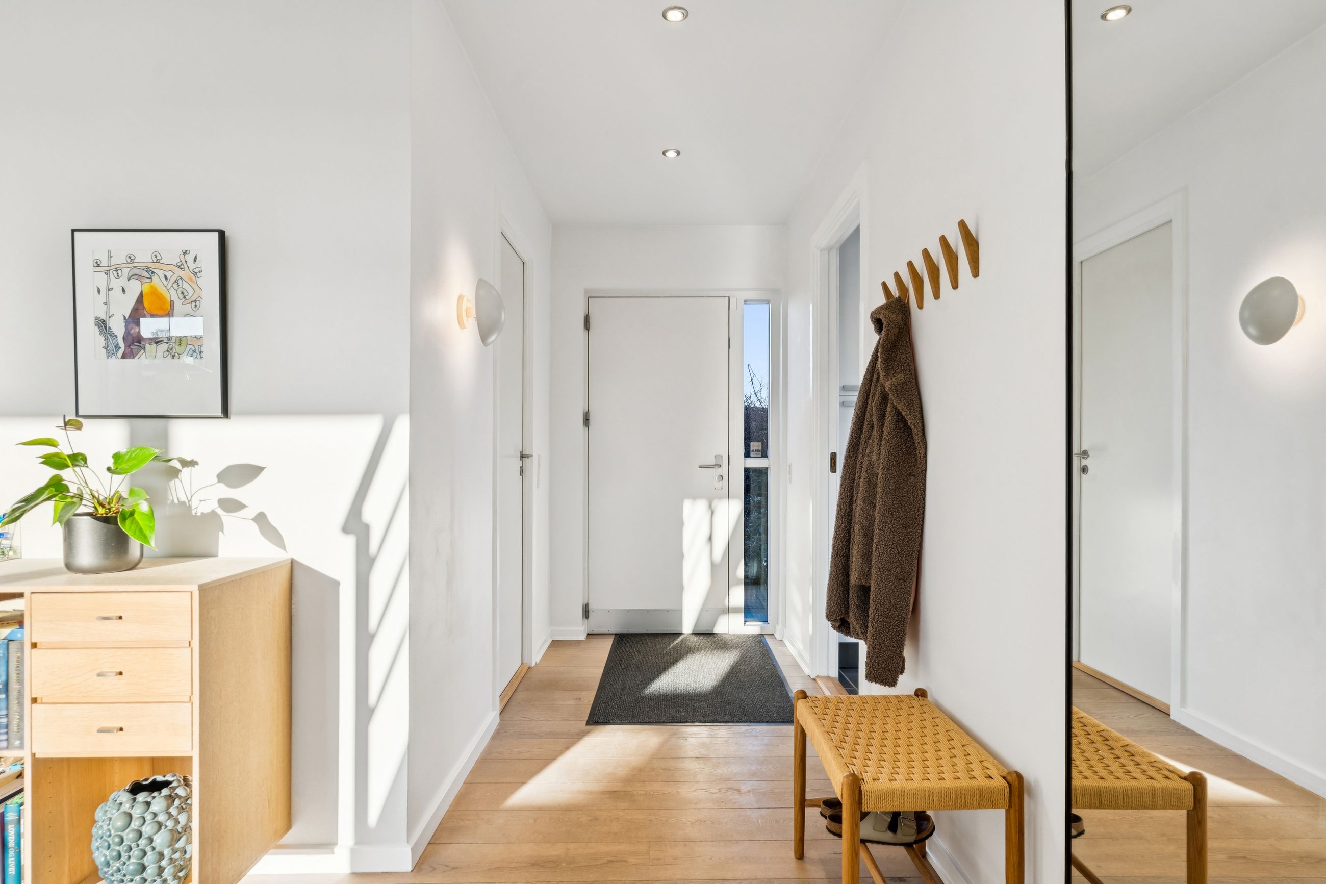 Man bydes velkommen i entréen. Herfra er der adgang til stort bryggers med masser af skabsplads, badeværelse og et værelse.