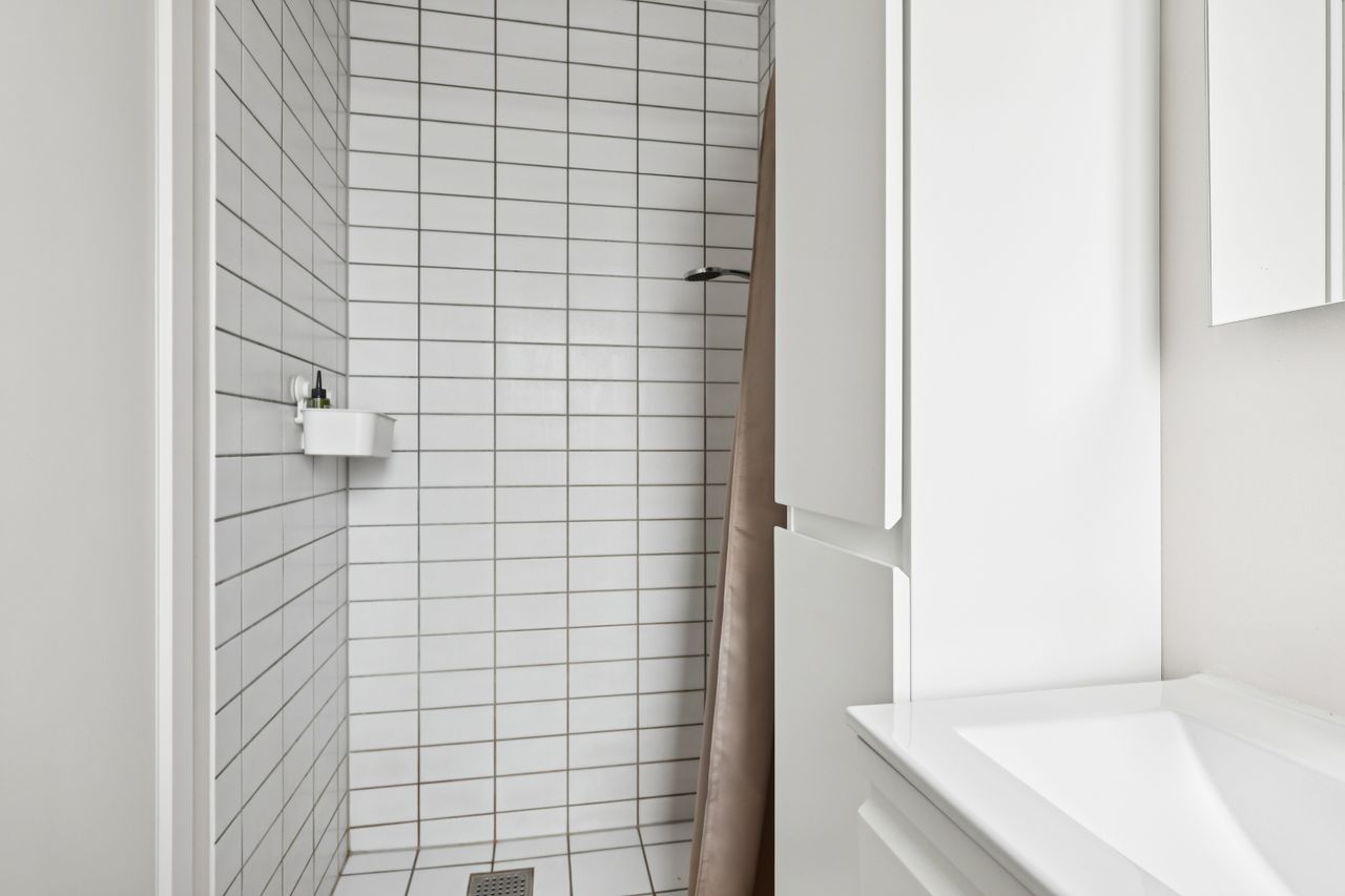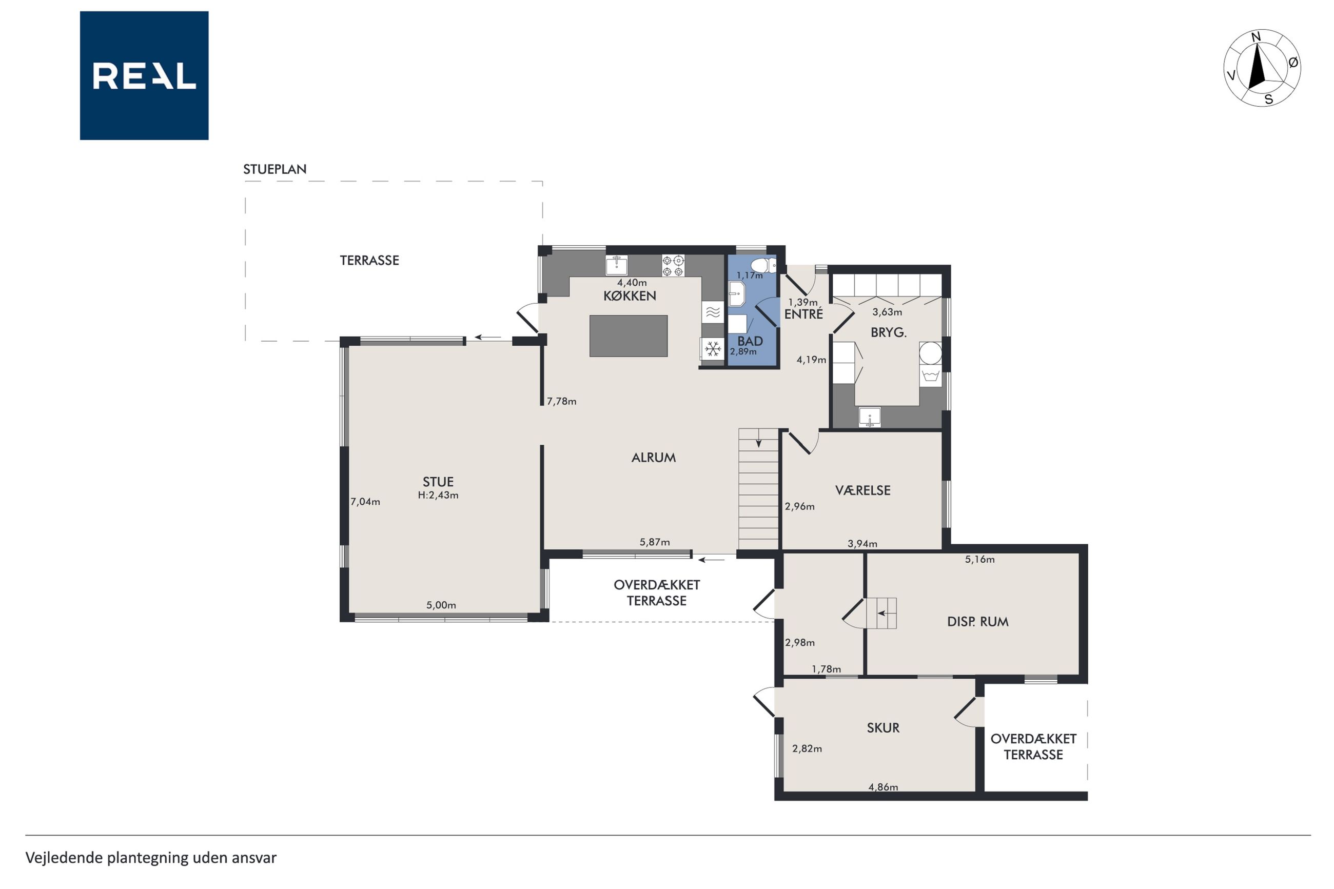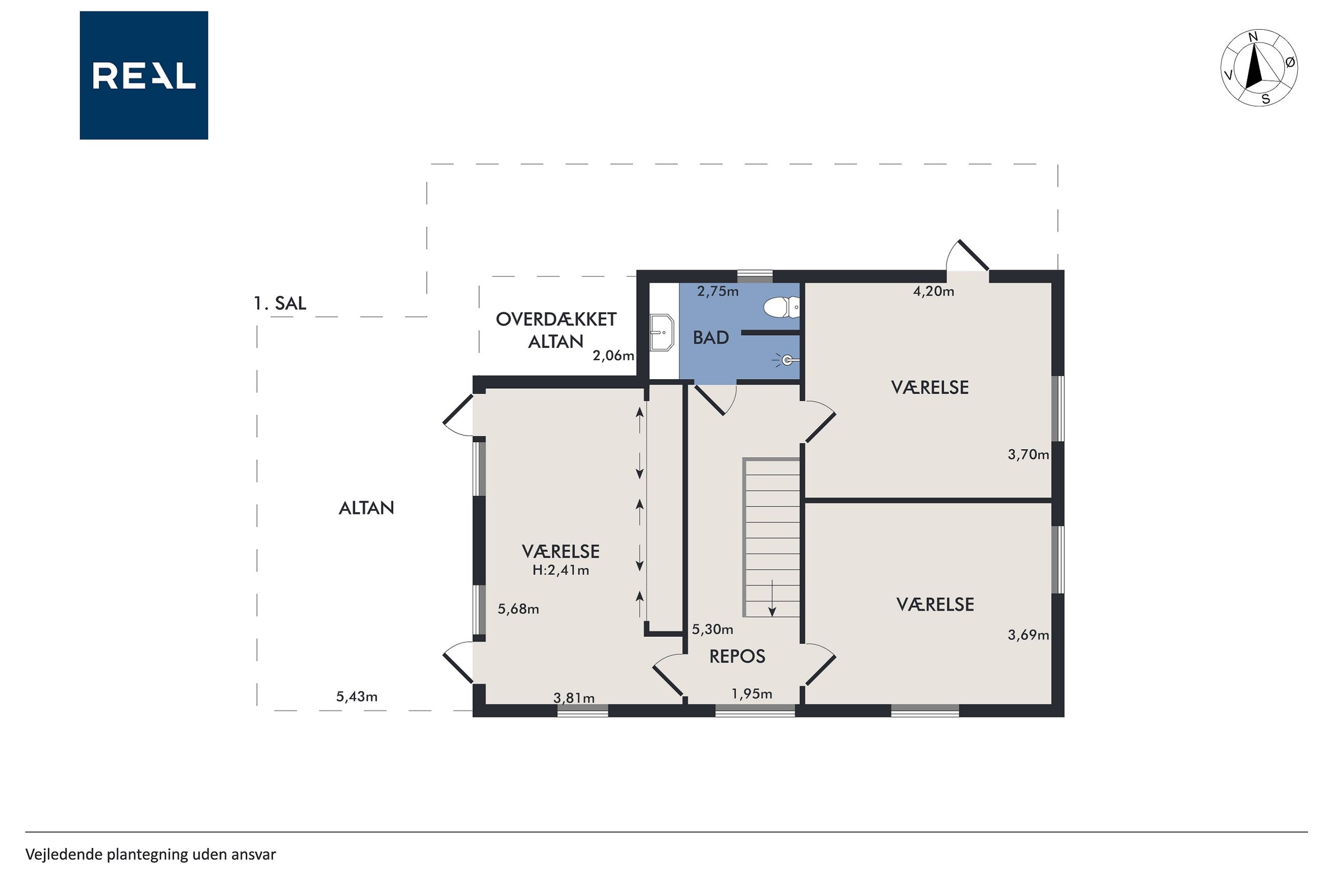 Man bydes velkommen i entréen. Herfra er der adgang til stort bryggers med masser af skabsplads, badeværelse og et værelse.