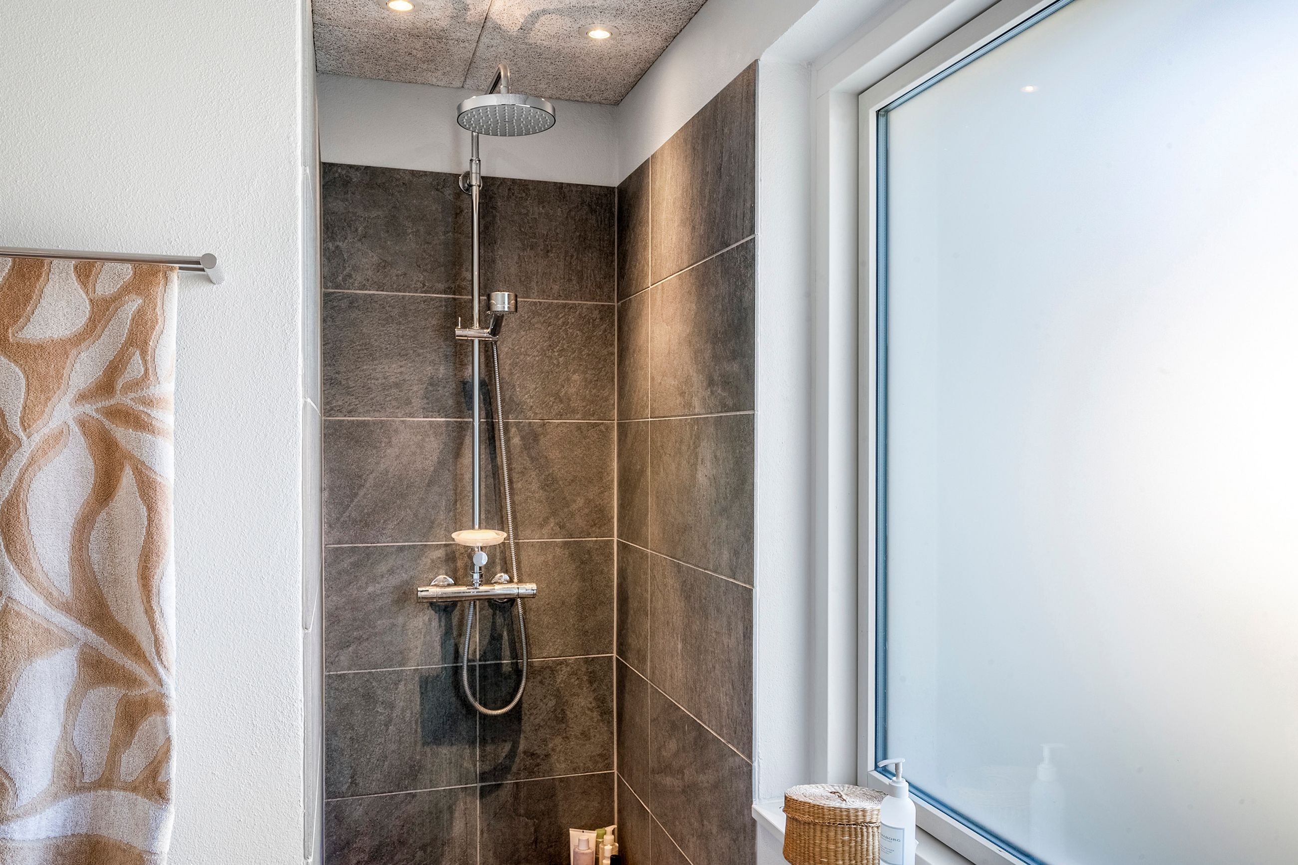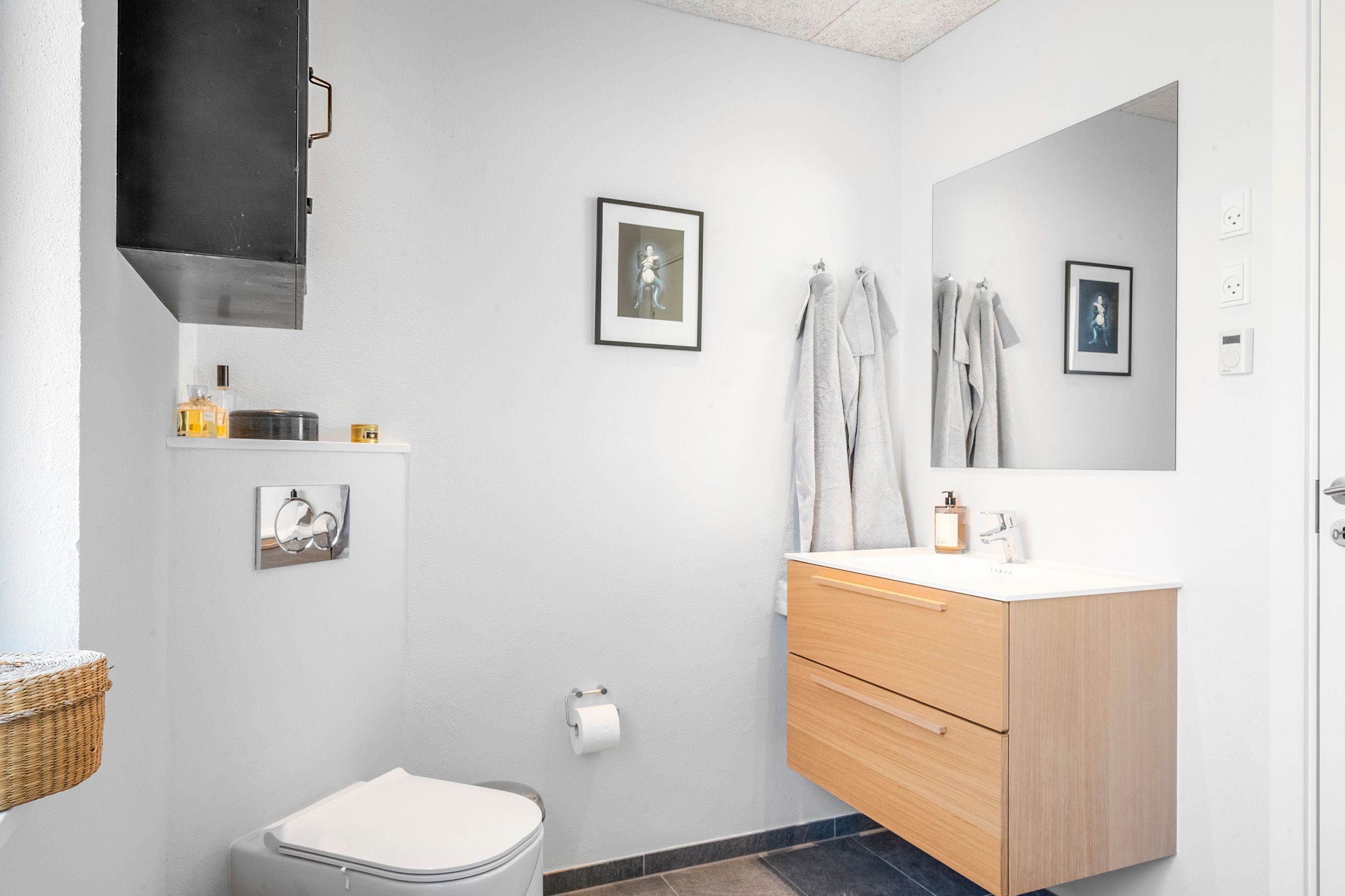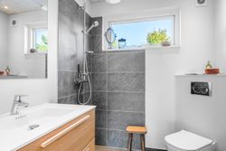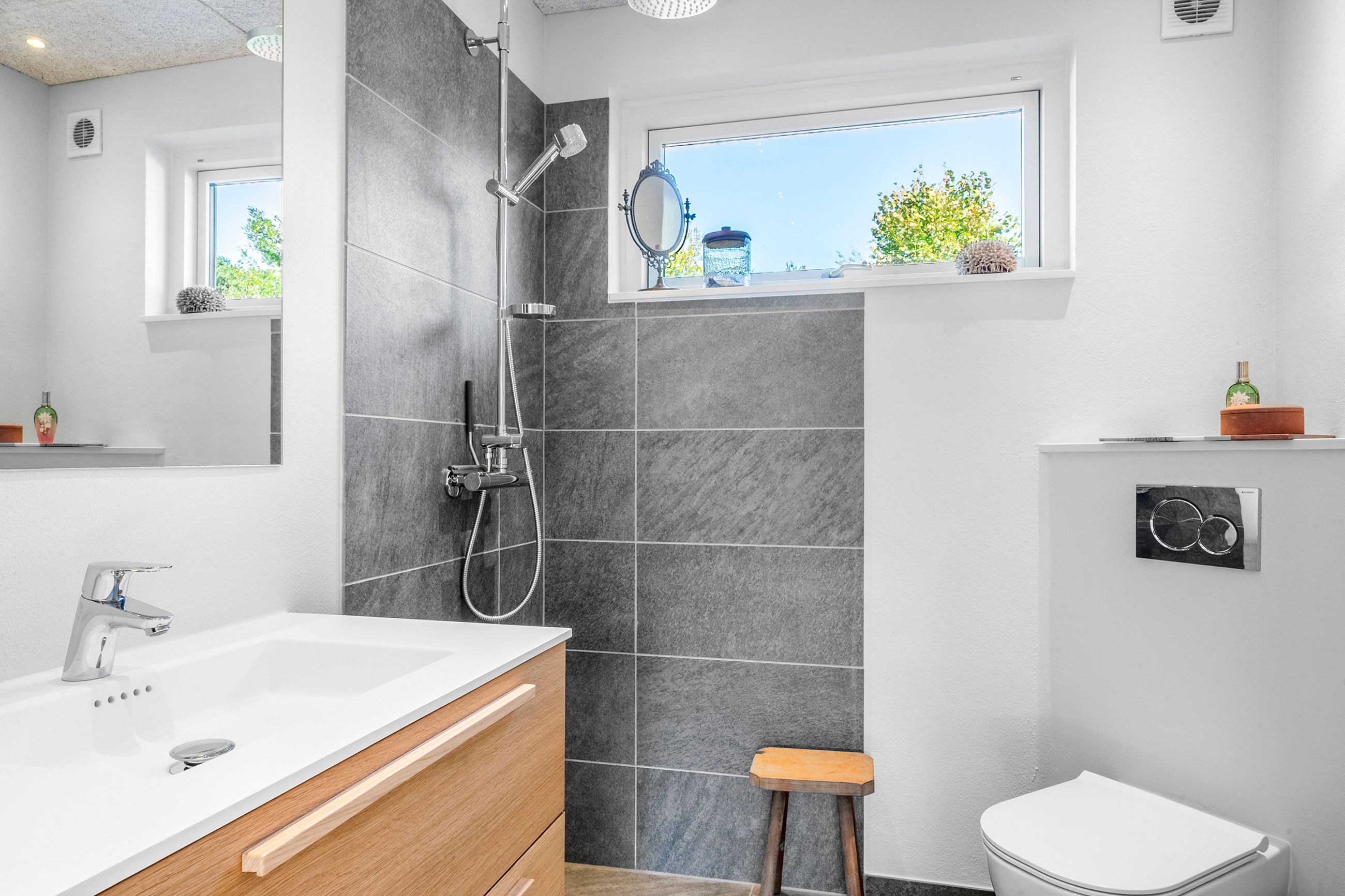 Med to badeværelser er der sørget for en praktisk hverdag uden trængsel om morgenen, og begge badeværelser er tidløst indrettet med nye møbler i eg og ny sanitet.