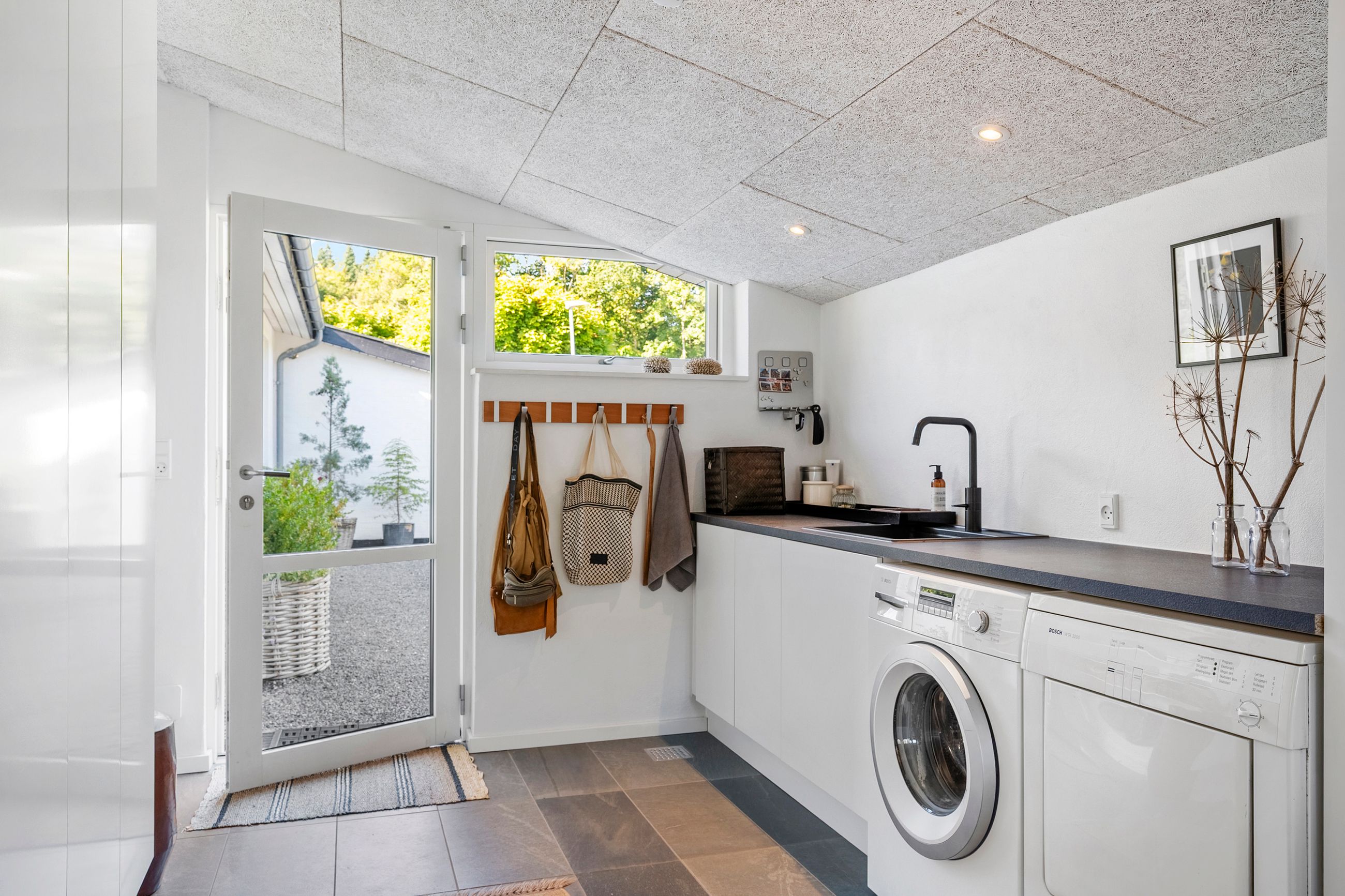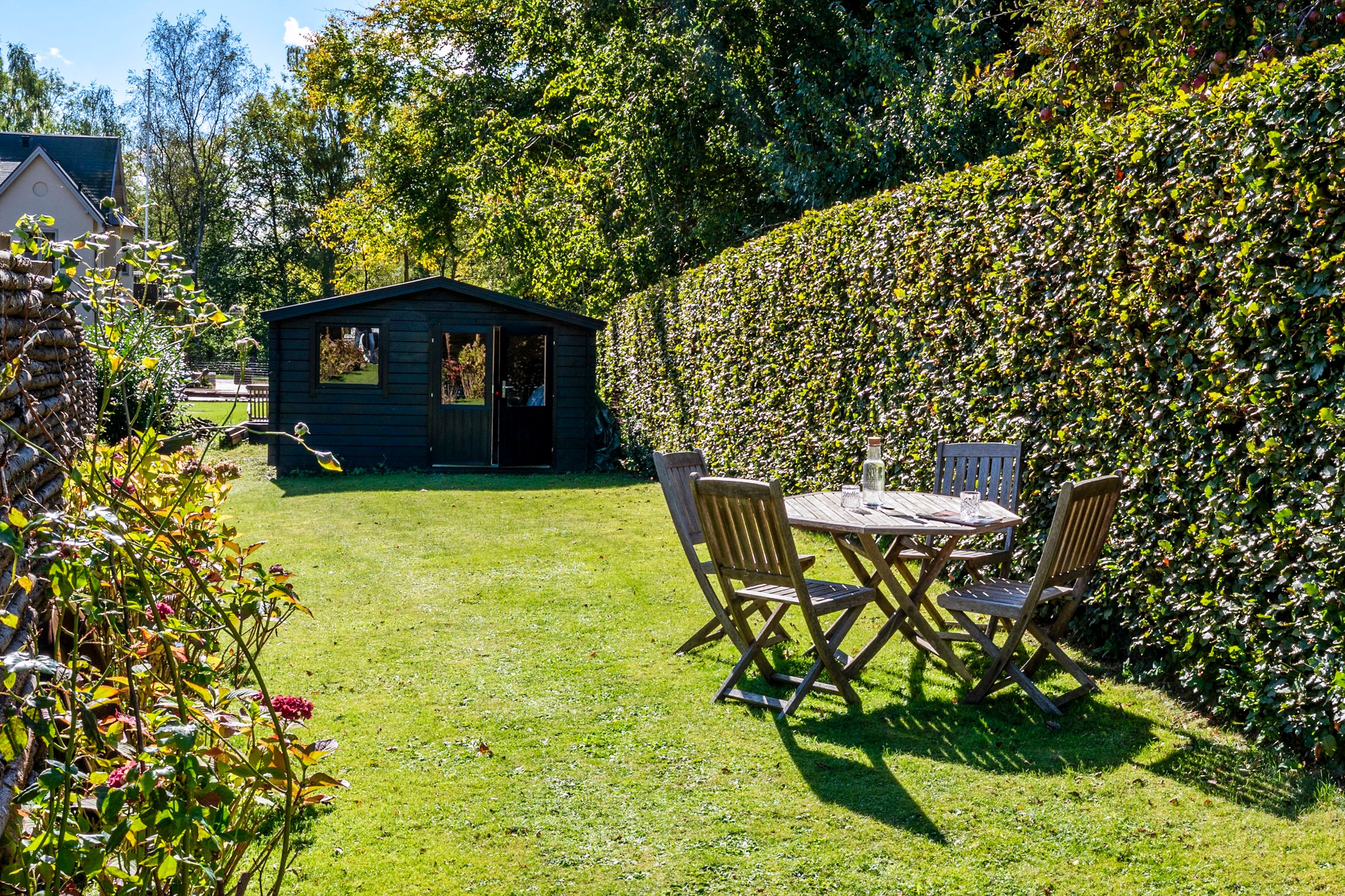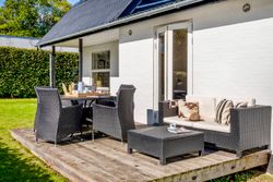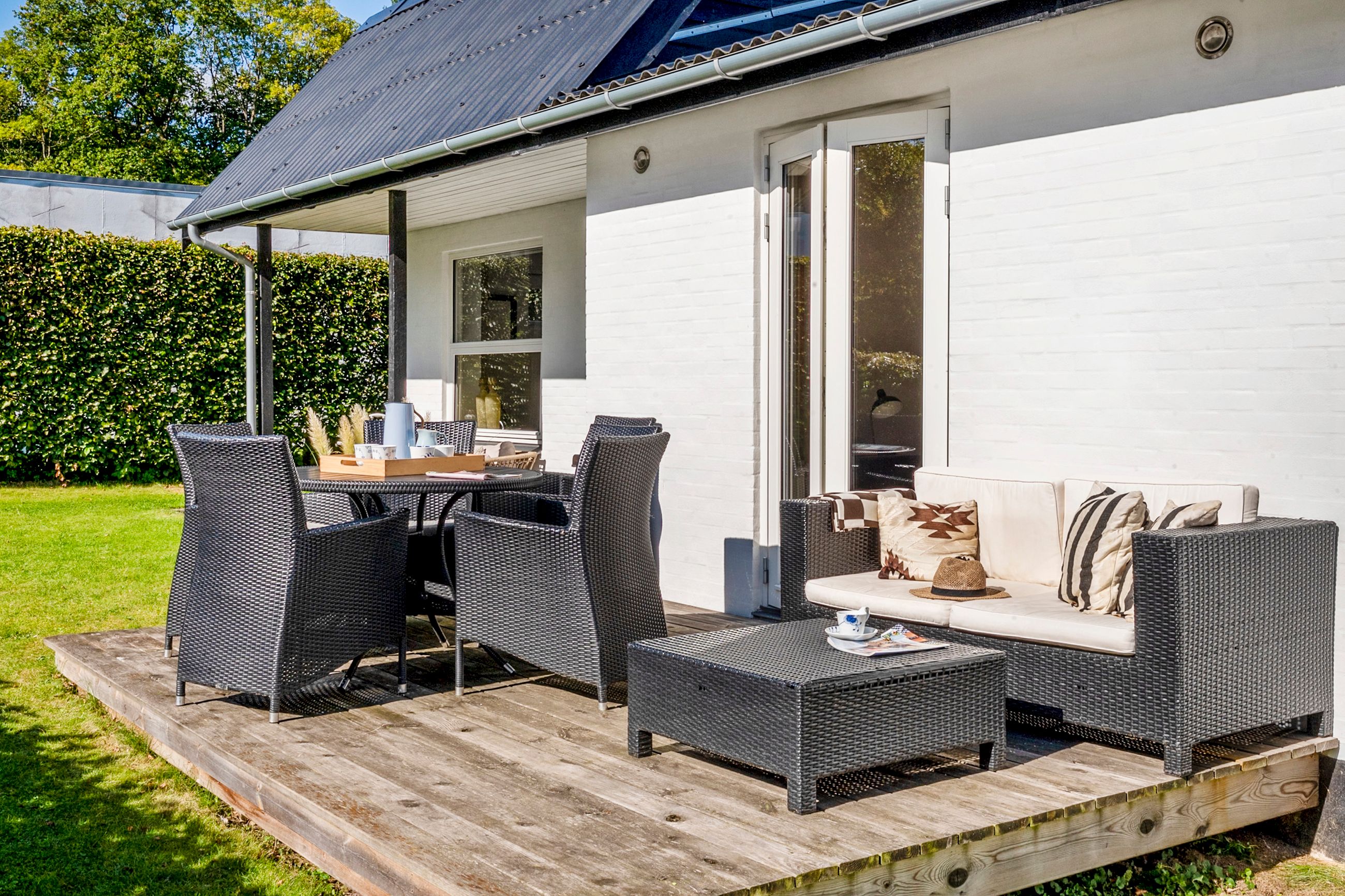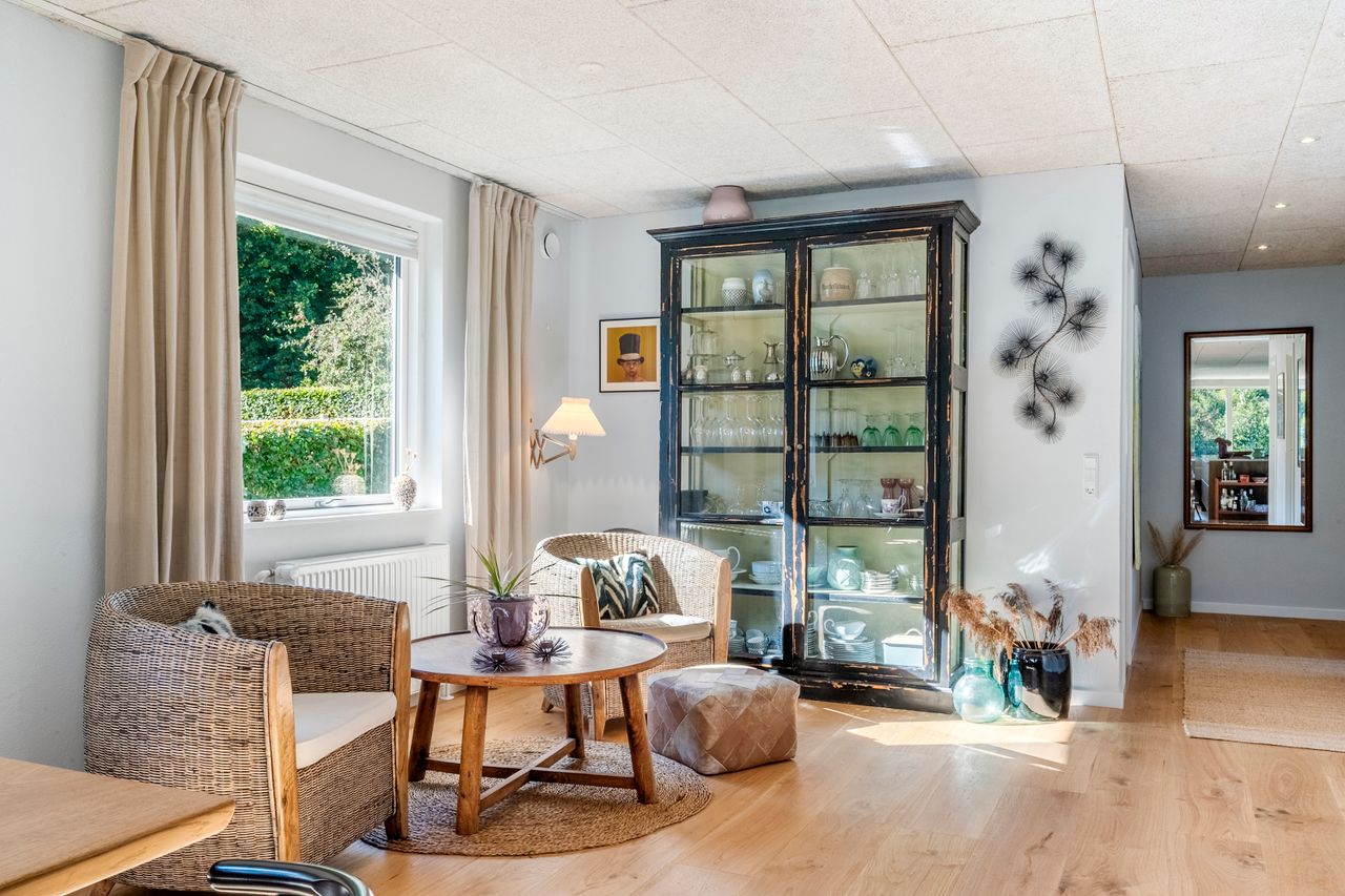 Udenfor venter en dejlig have, som er overskuelig at vedligeholde, men samtidig fuld af muligheder for at skabe små oaser og uderum. Flere terrasser omkring huset gør det nemt at finde både læ og sol i løbet af dagen.