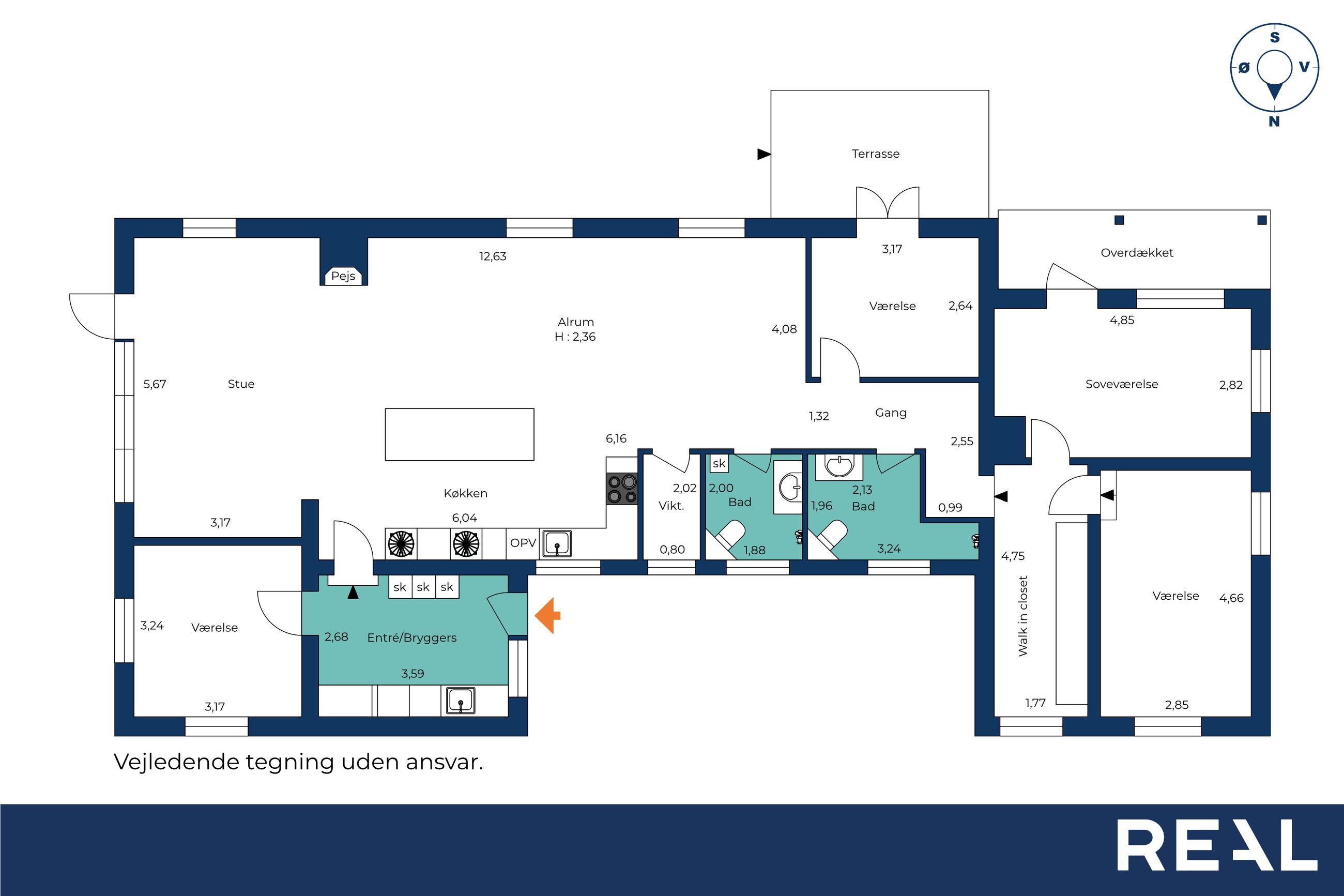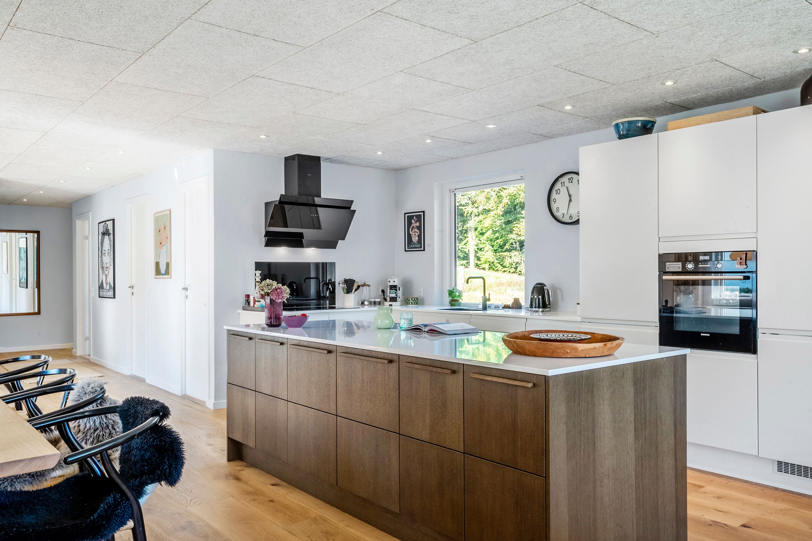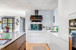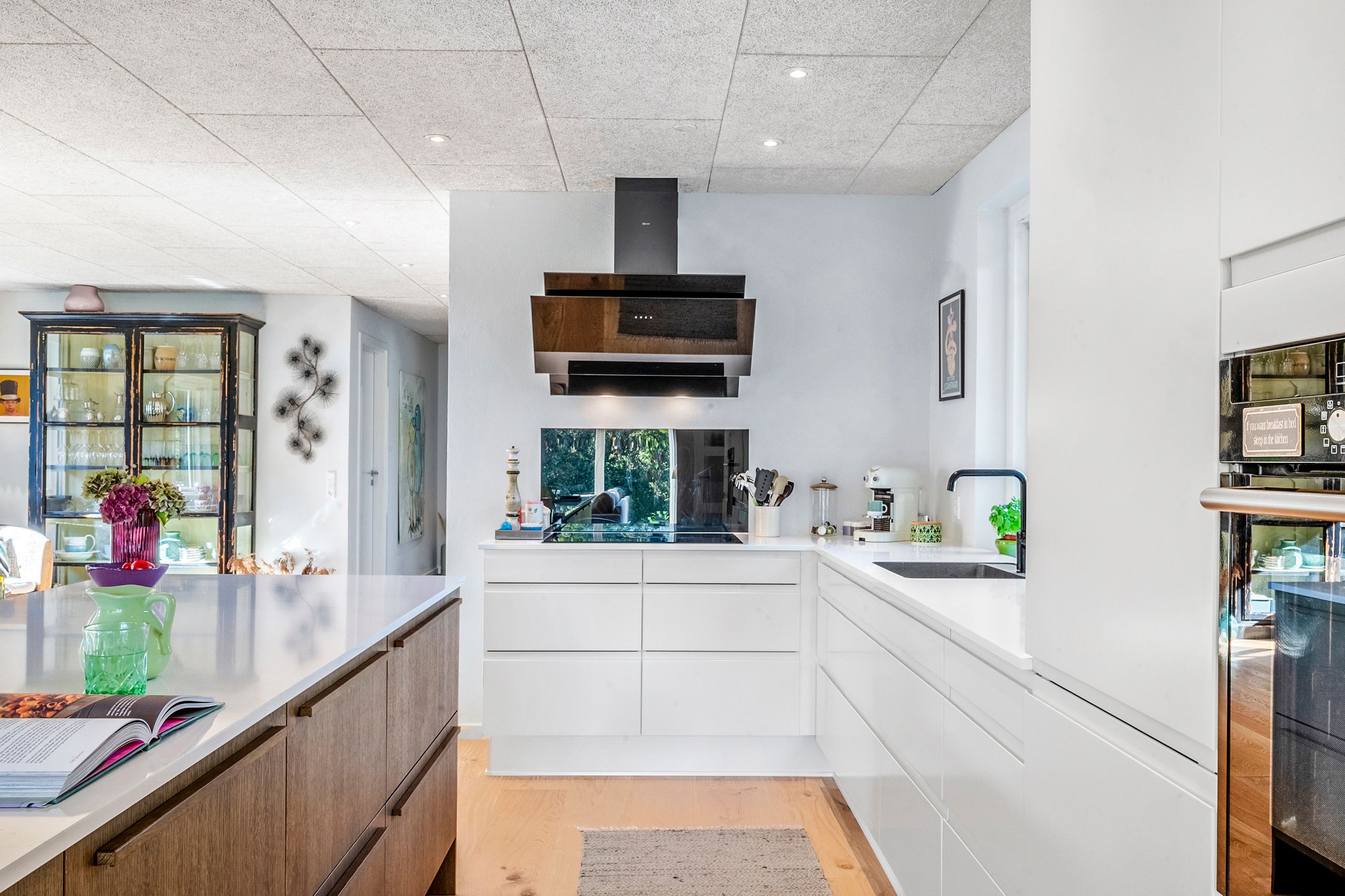 Boligens hjerte er uden tvivl det store, åbne køkken-alrum med en indbydende og varm atmosfære. Køkkenet er praktisk indrettet med gode arbejdsforhold og et funktionelt viktualierum lige i nærheden. Alrummet har rigelig plads til både spiseafdeling og hyggelige samlingspunkter. Fra alrummet er der åben forbindelse til stuen – kun markeret af en ny rumdeler med indbygget pejseindsats.