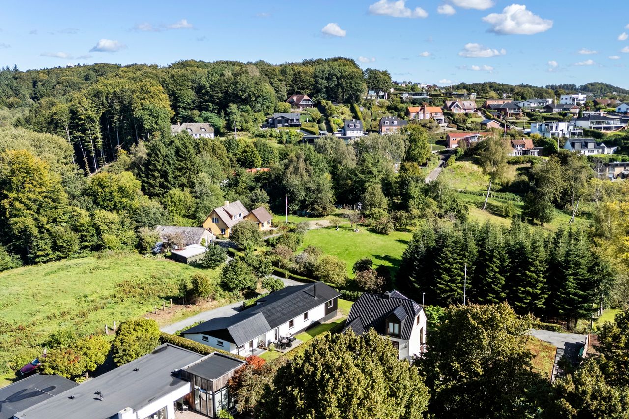 Beliggenheden på Lehmannsvej giver dig det bedste fra to verdener. Du bor i et roligt og trygt område tæt på naturen, hvor stier, skov og grønne områder ligger lige indenfor rækkevidde. En kort spadseretur fører dig til Vejle Fjord og det lille fiskerleje ved Bybæk eller badestranden ved Albuen. Vejle centrum kan nemt nås på få minutter med både bil og cykel – enten langs fjorden via Strandvejen eller gennem Dyrehaven.
