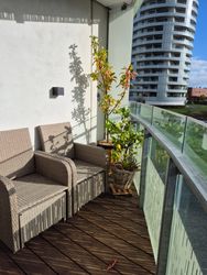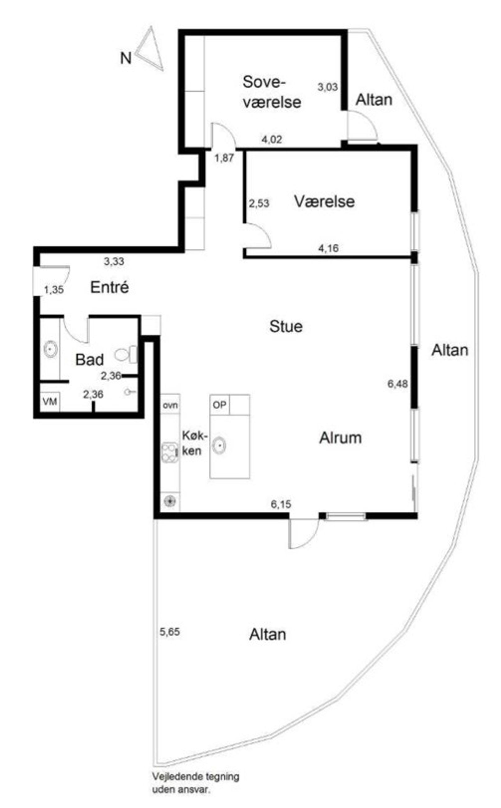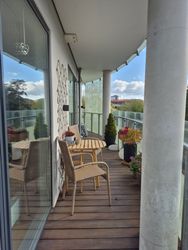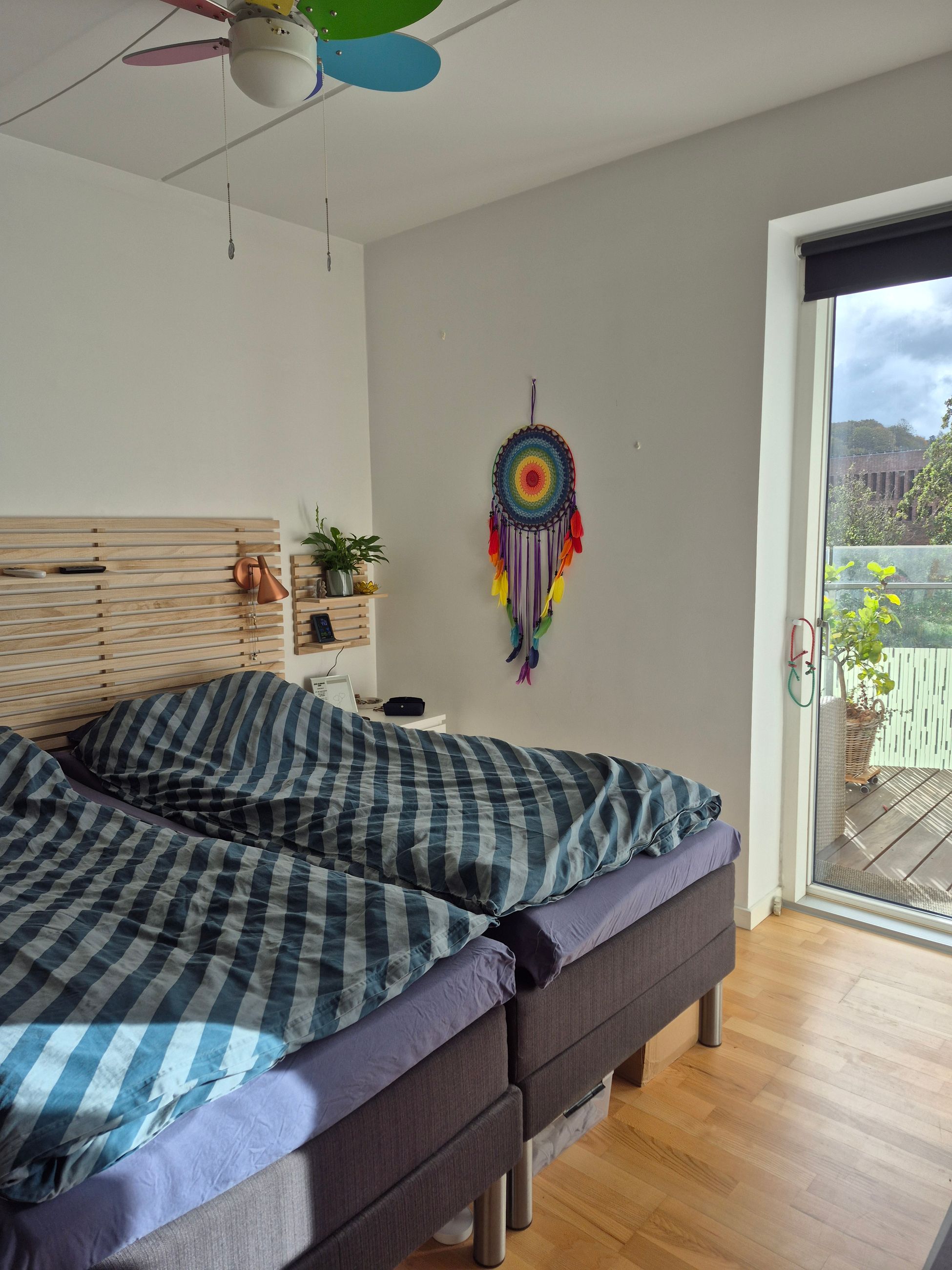 Yderligere er der fra stuen adgang til den store overdækkede altan. Herfra kan man nyde både solen, og udsigten mod byen og åen. Lejligheden har et rummeligt og lyst soveværelse, med egen udgang til altanen samt et gæsteværelse.