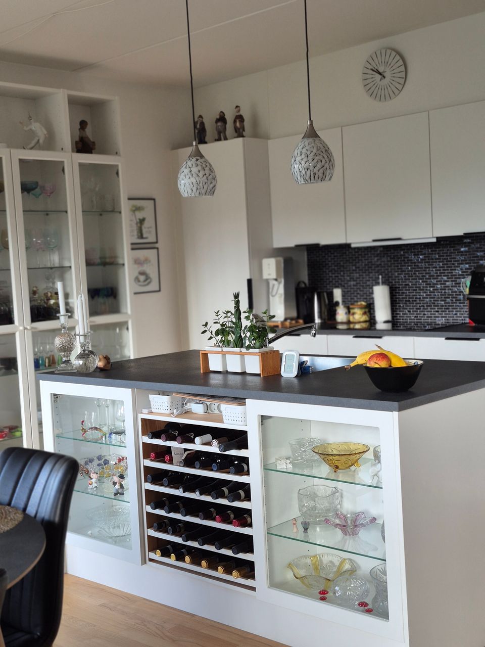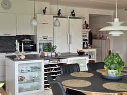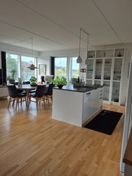 Køkkenet har en nydelig køkken-ø med god bord- og skabsplads. Køkken-ø'ens placering giver en dejlig udsigt, så denne kan nydes mens maden tilbederes. I stuen er der plads til et godt spisebord, der giver mulighed for at inviterer gæsterne på besøg. Herudover er der plads til et sofa/tv-arrangement.