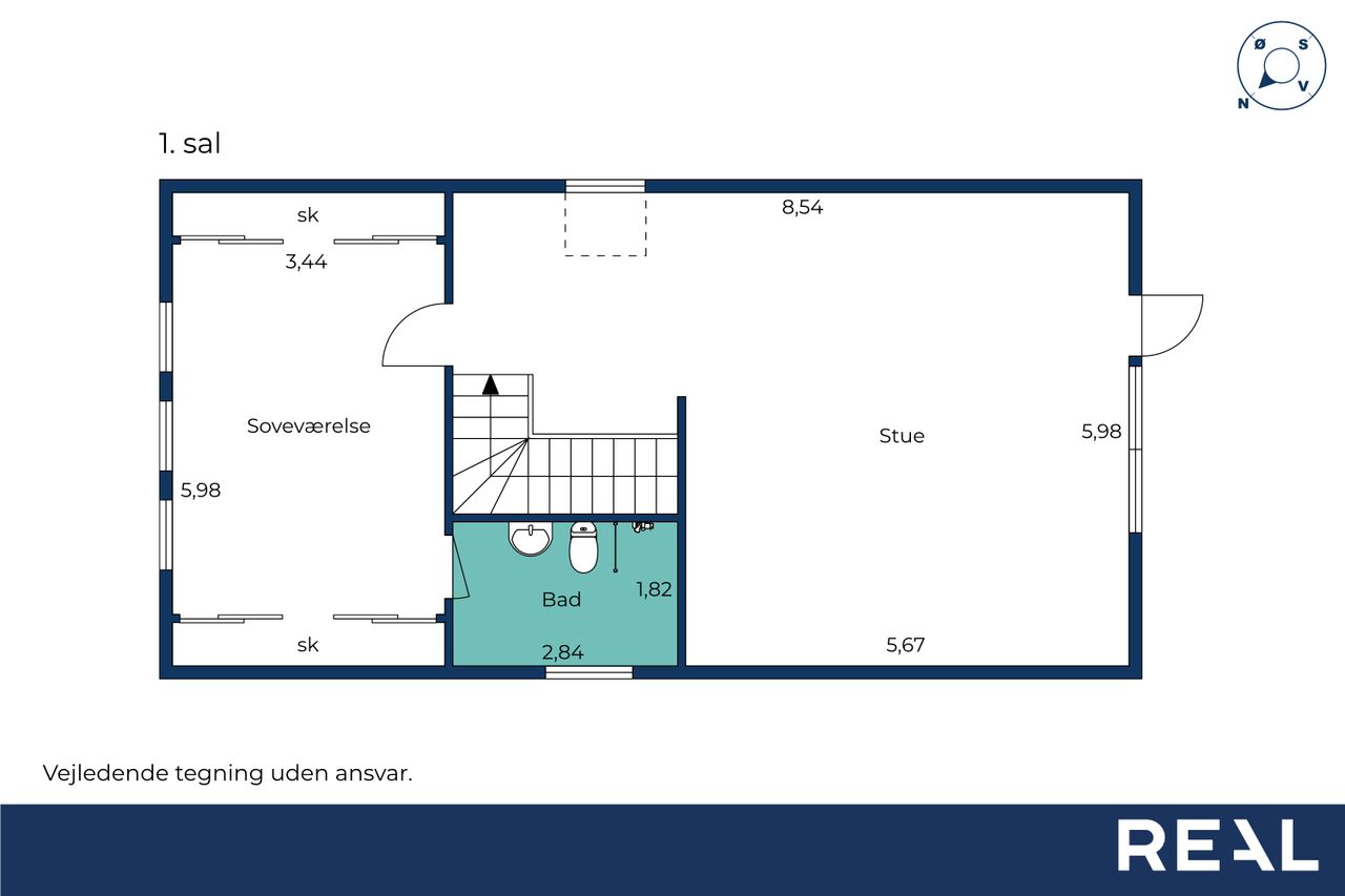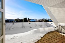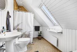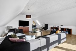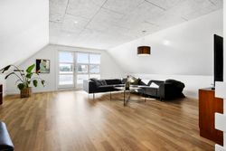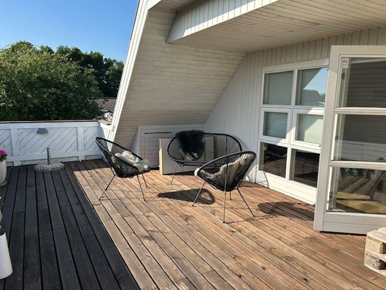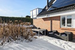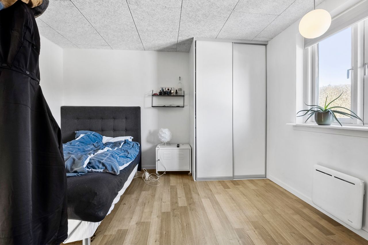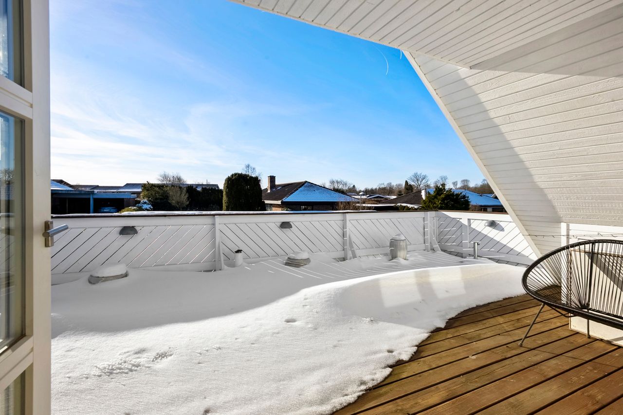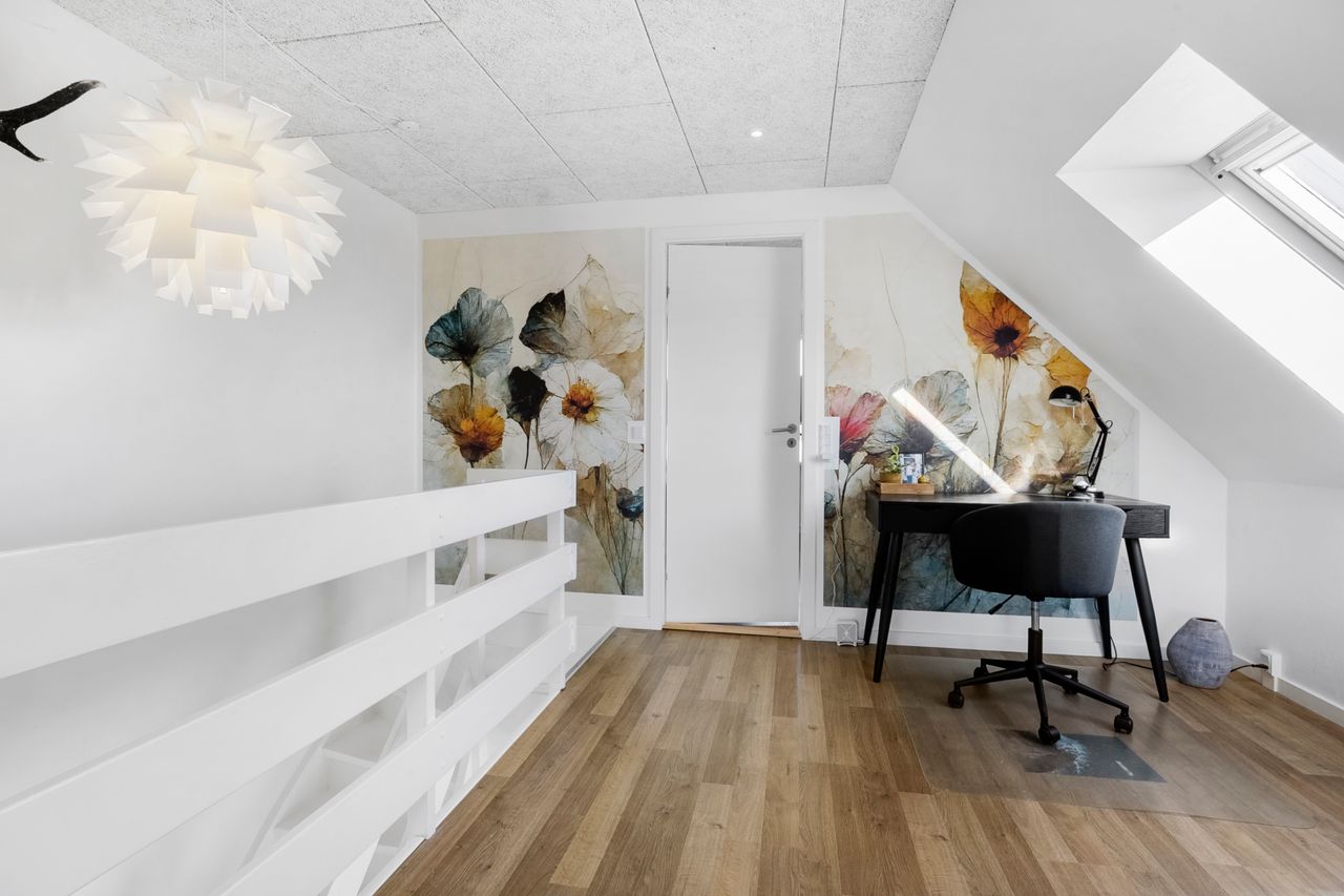 På førstesalen ligger et stort soveværelse med god skabsplads og eget badeværelse – perfekt som forældreafdeling. Derudover rummer etagen en hyggelig opholdsstue, hvor man kan trække sig tilbage med en bog eller en god film. Fra stuen er der udgang til en stor sydvest vendt altan, som forlænger opholdsrummet udendørs og giver rig mulighed for at nyde solen eller udsigten til haven.