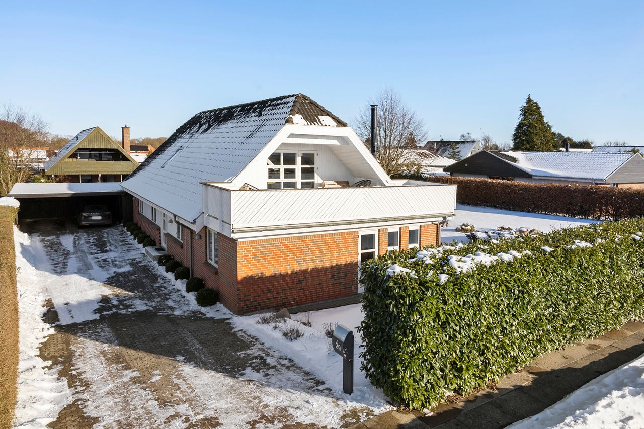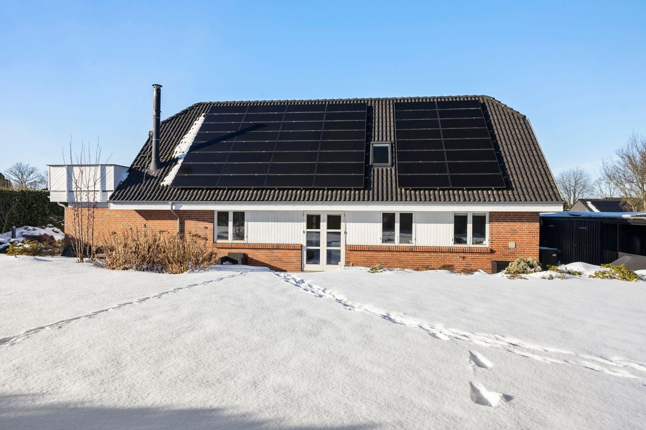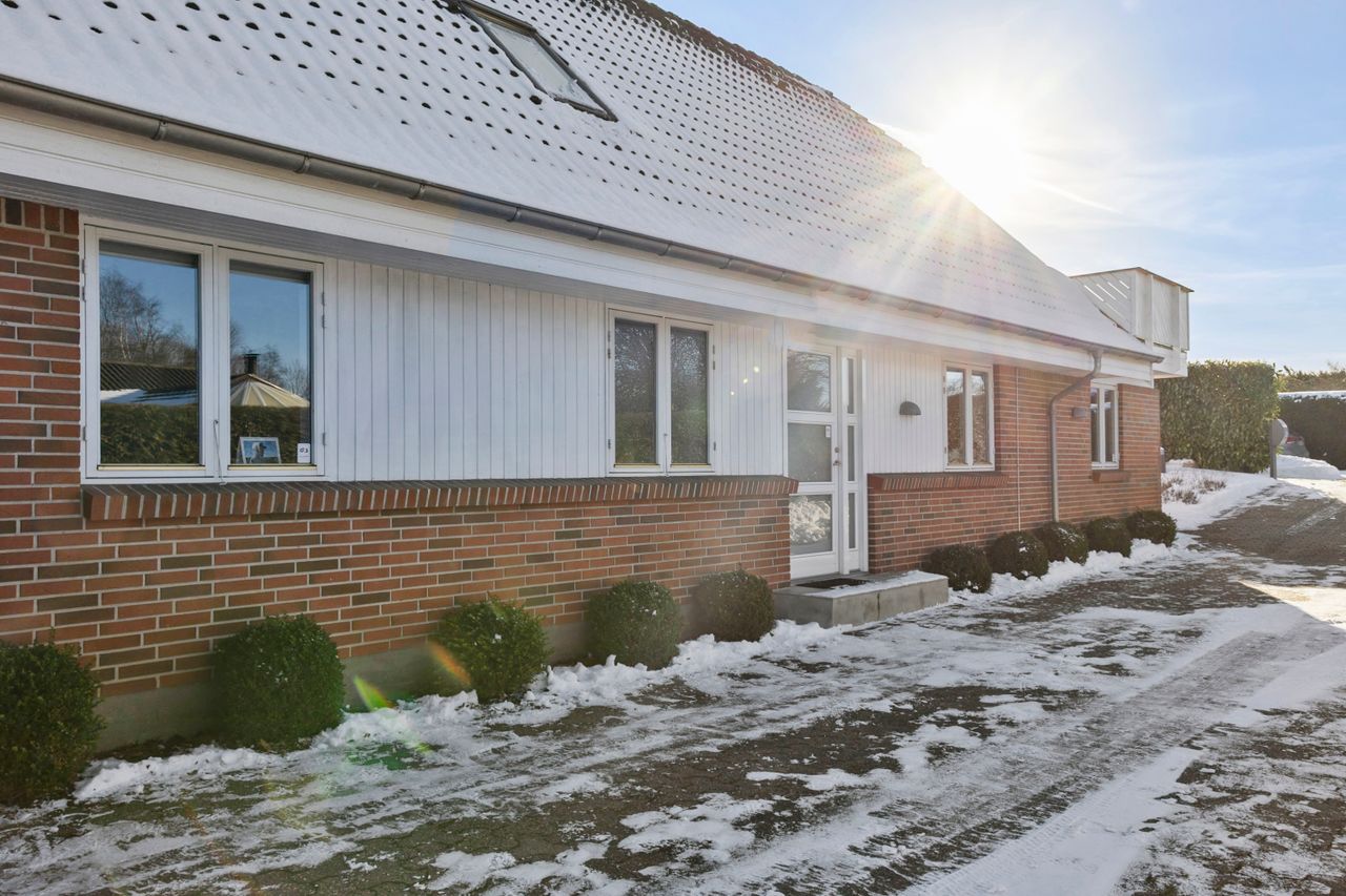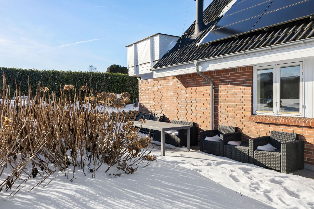 Udenfor venter en dejlig stor have, hvor der både er plads til leg, afslapning og haveprojekter. Her kan børnene tumle, mens de voksne slapper af på terrassen, og der er rig mulighed for at skabe små hyggekroge eller en køkkenhave. Et skur giver praktisk opbevaring til haveredskaber og cykler. Foran huset finder du en stor indkørsel med plads til flere biler, hvilket gør hverdagen ekstra bekvem.