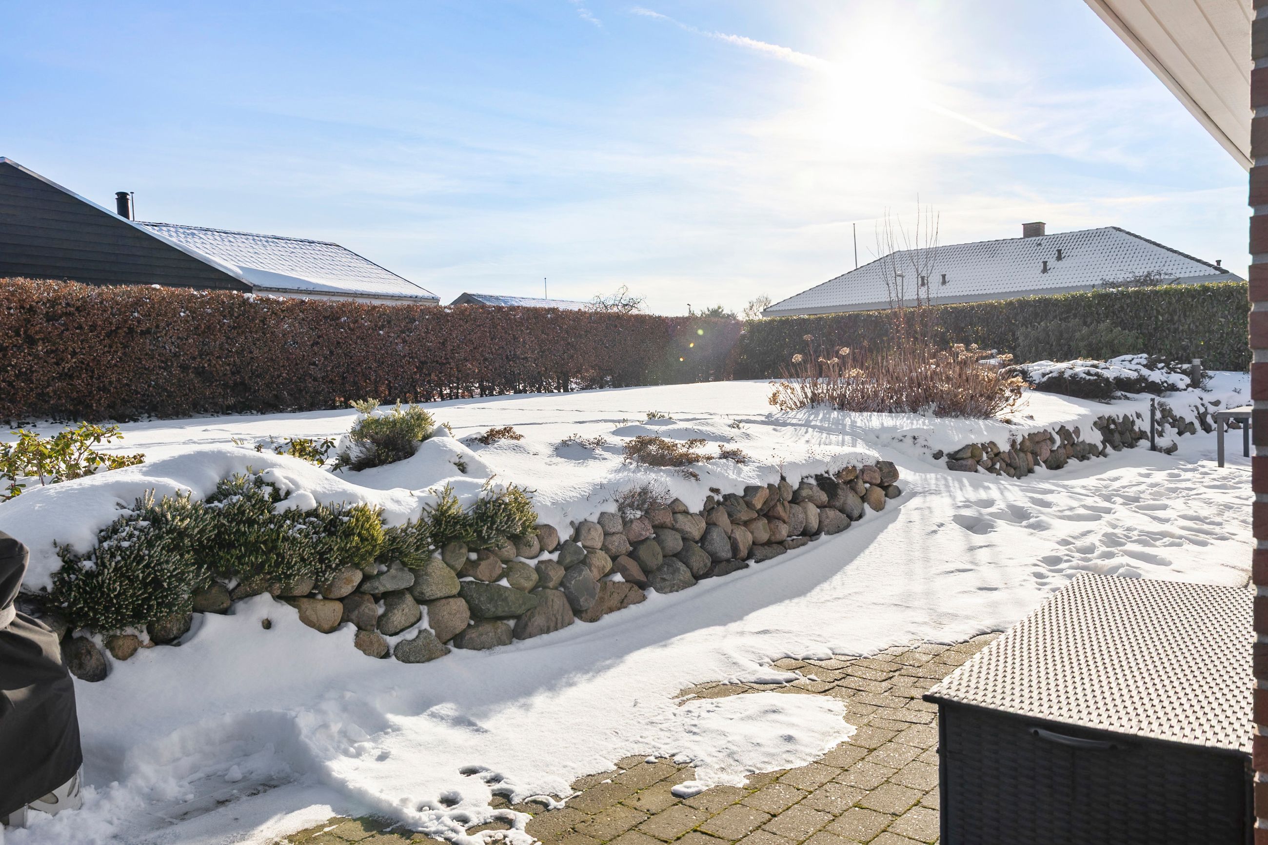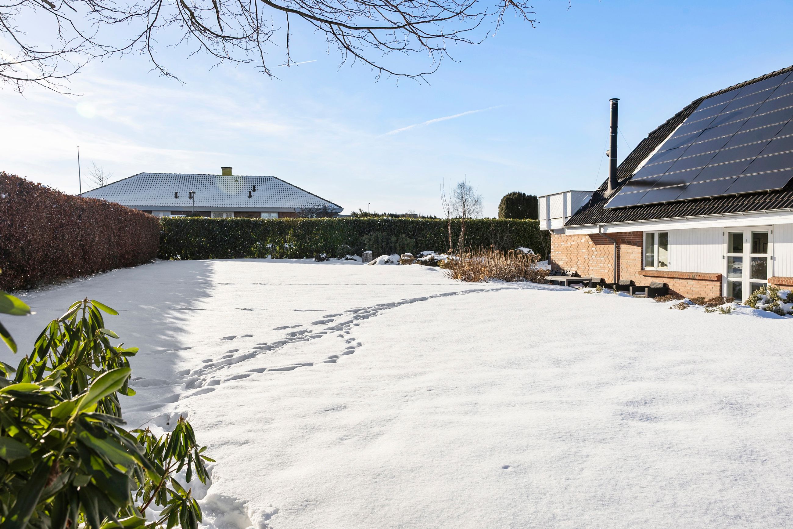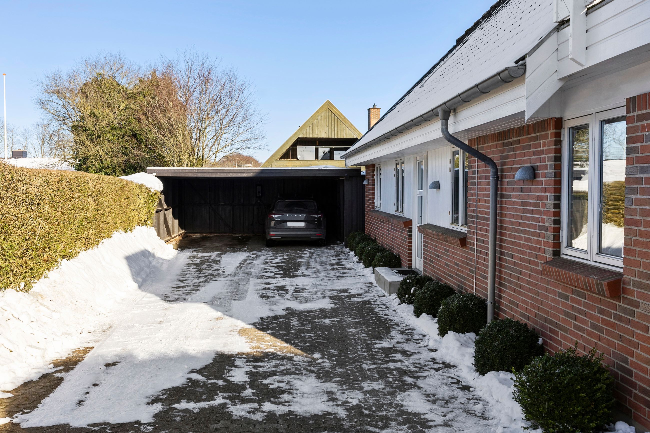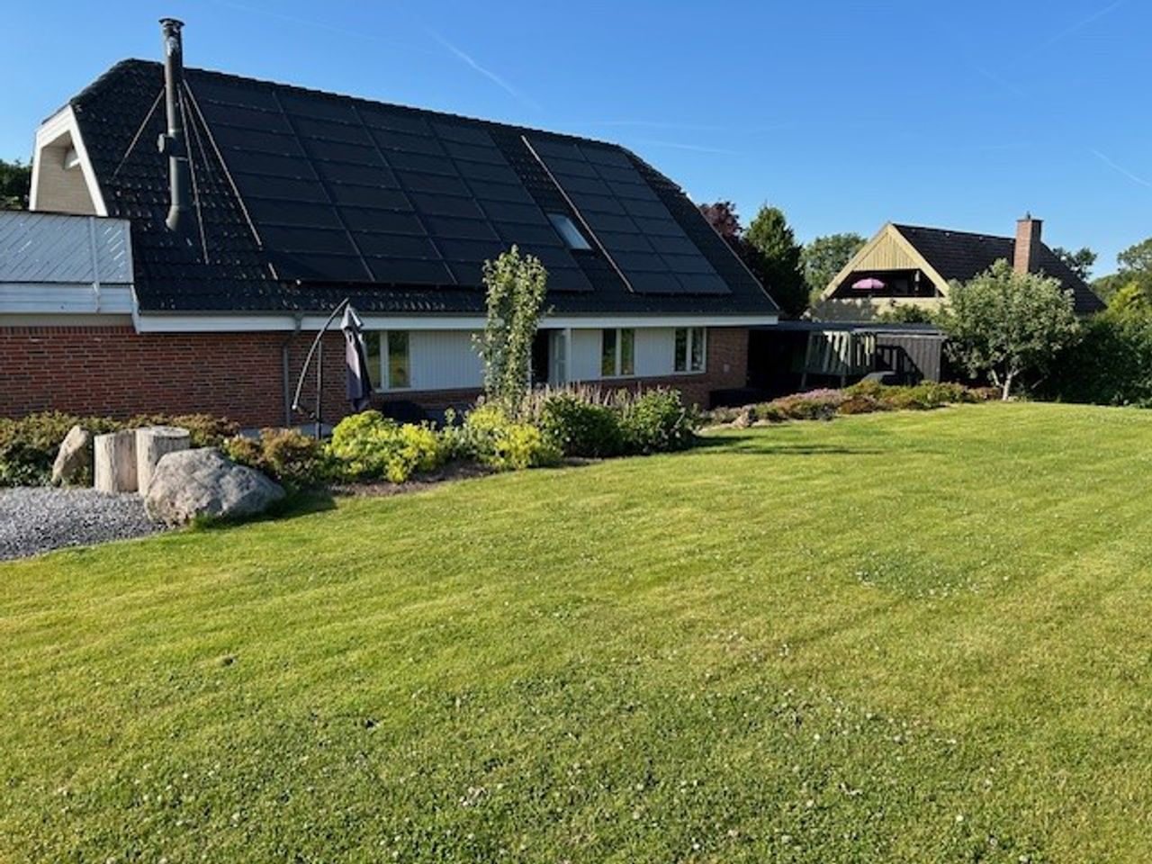 Udenfor venter en dejlig stor have, hvor der både er plads til leg, afslapning og haveprojekter. Her kan børnene tumle, mens de voksne slapper af på terrassen, og der er rig mulighed for at skabe små hyggekroge eller en køkkenhave. Et skur giver praktisk opbevaring til haveredskaber og cykler. Foran huset finder du en stor indkørsel med plads til flere biler, hvilket gør hverdagen ekstra bekvem.