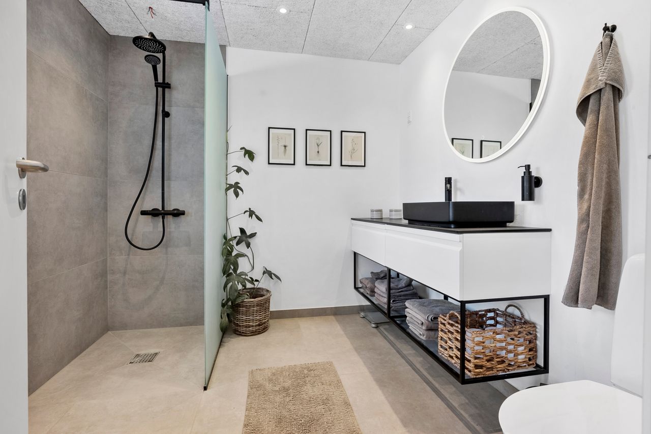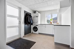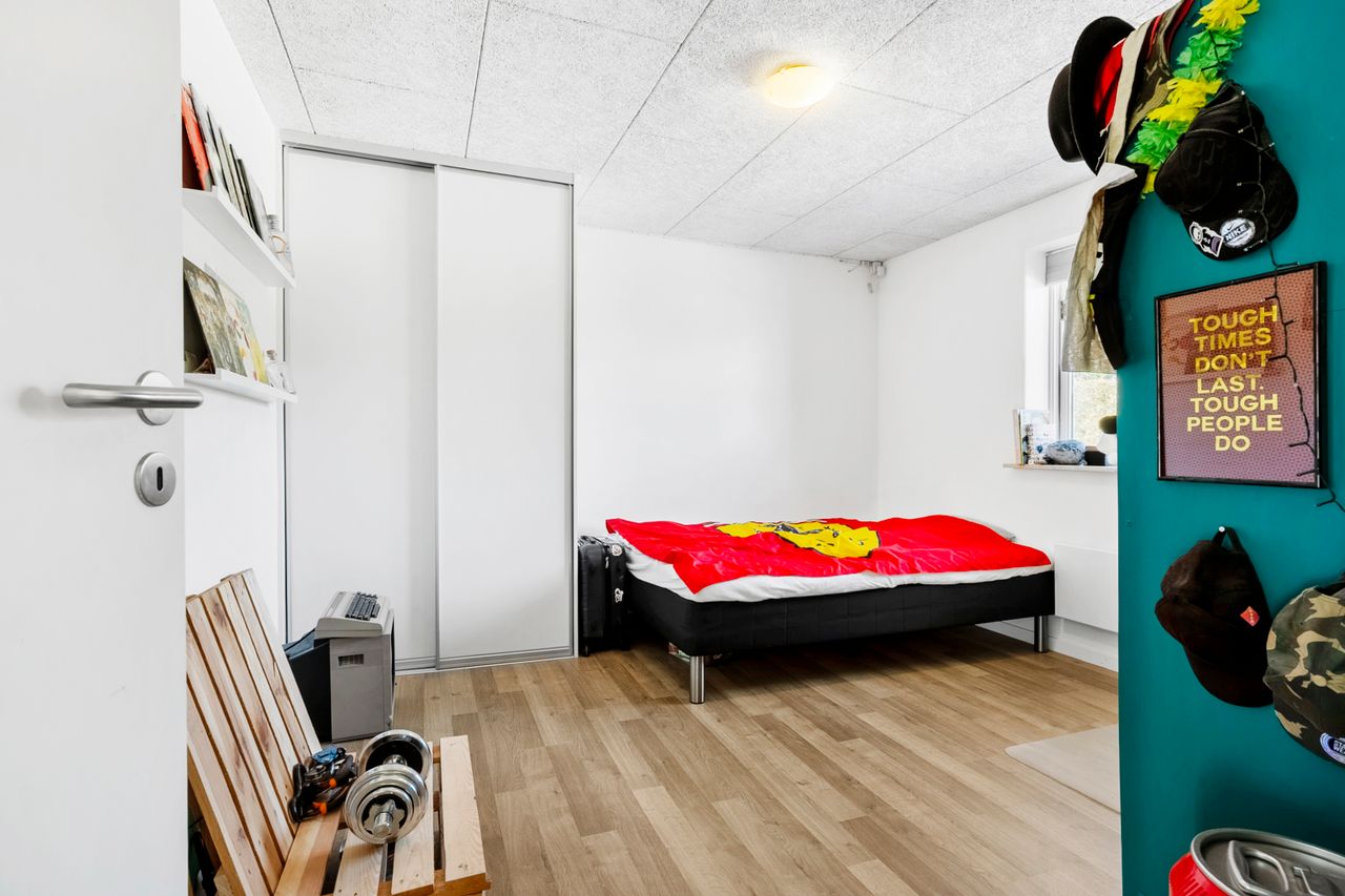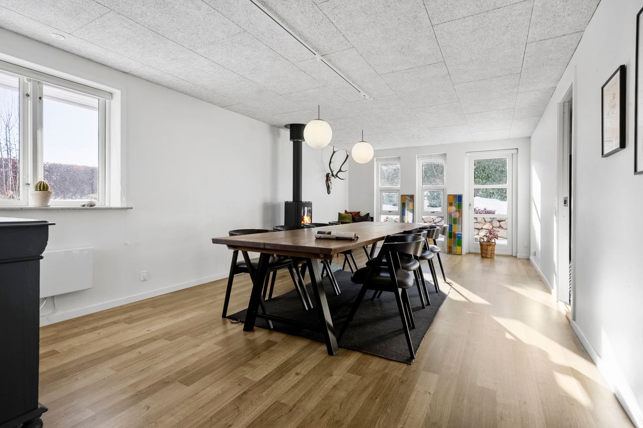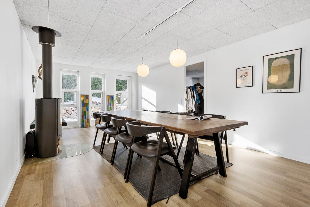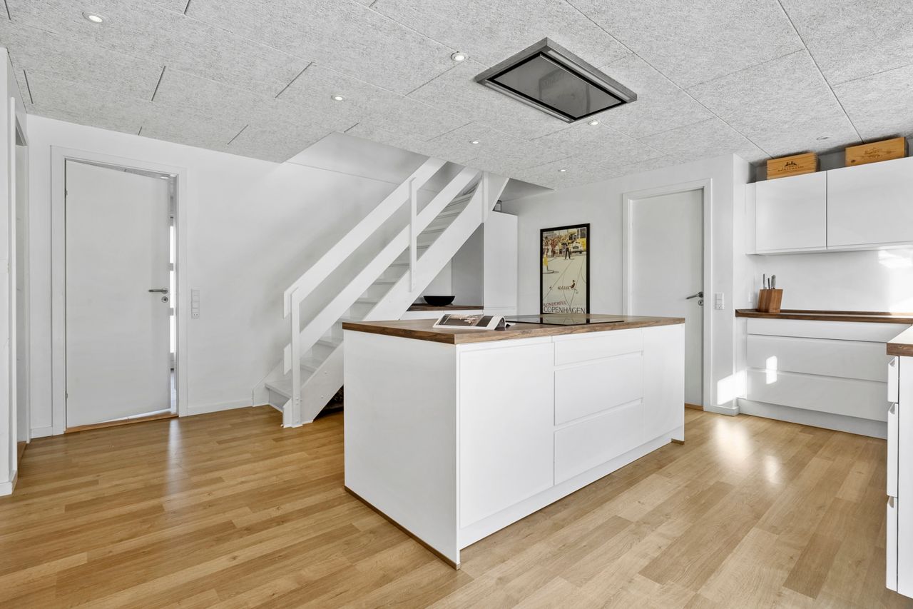 Allerede når du træder ind i det rummelige bryggers, mærker du, at her er god plads til opbevaring og til at holde styr på familiens dagligdag. I forlængelse af bryggerset ligger et værelse, der i dag fungerer som hjemmekontor, men det kan lige så nemt indrettes som gæsteværelse eller børneværelse. Videre kommer du til det åbne og lyse køkken, der indbyder til fælles madlavning. Herfra er der direkte udgang til terrassen, så udelivet let bliver en naturlig del af hverdagen. Køkkenet hænger sammen med spisestuen, som fungerer som husets samlingspunkt, hvor man kan mødes til måltider og hyggeligt samvær. I stueplan findes desuden endnu to værelser samt et badeværelse, hvilket giver fleksible muligheder for både børn og gæster.