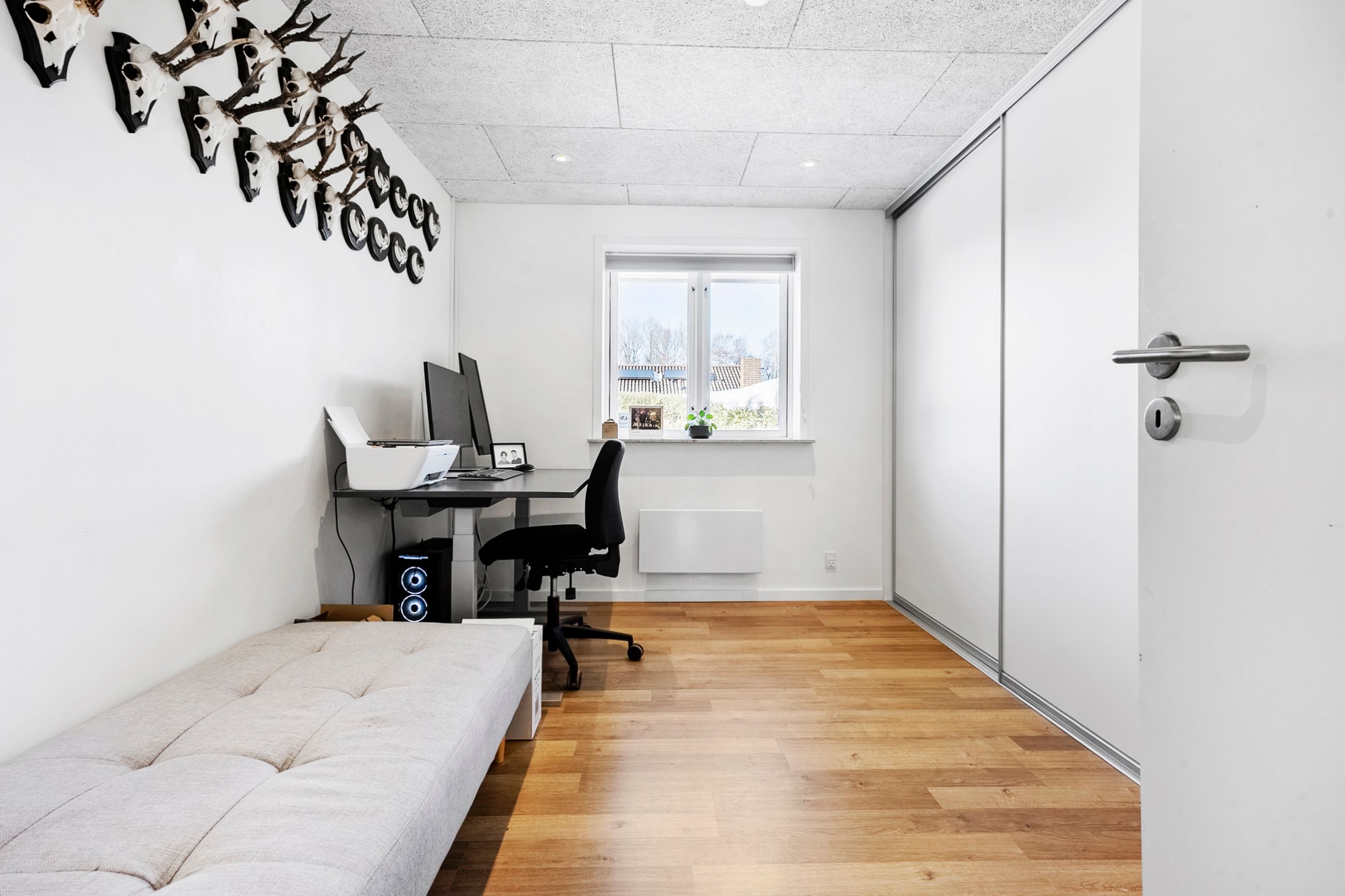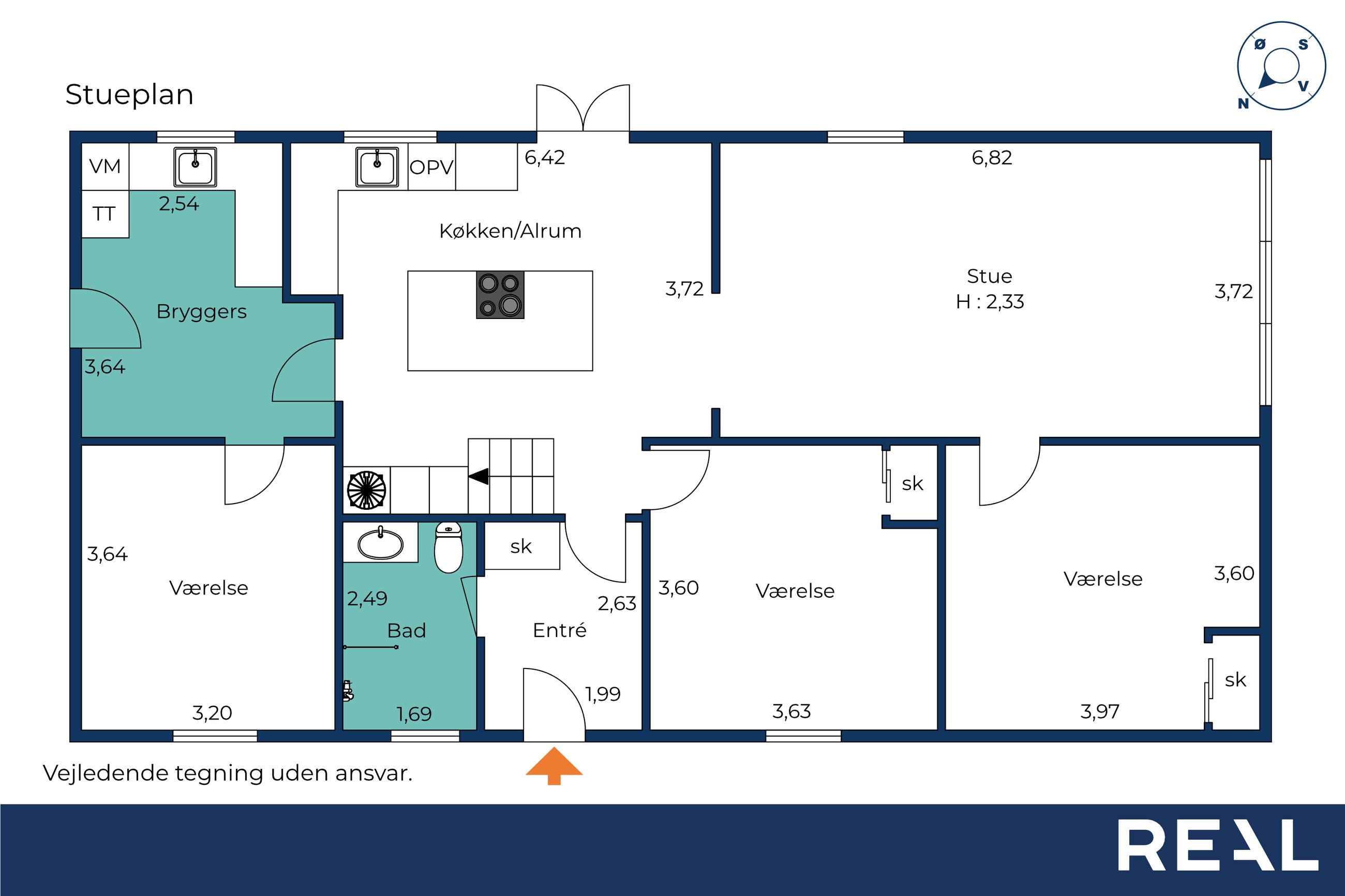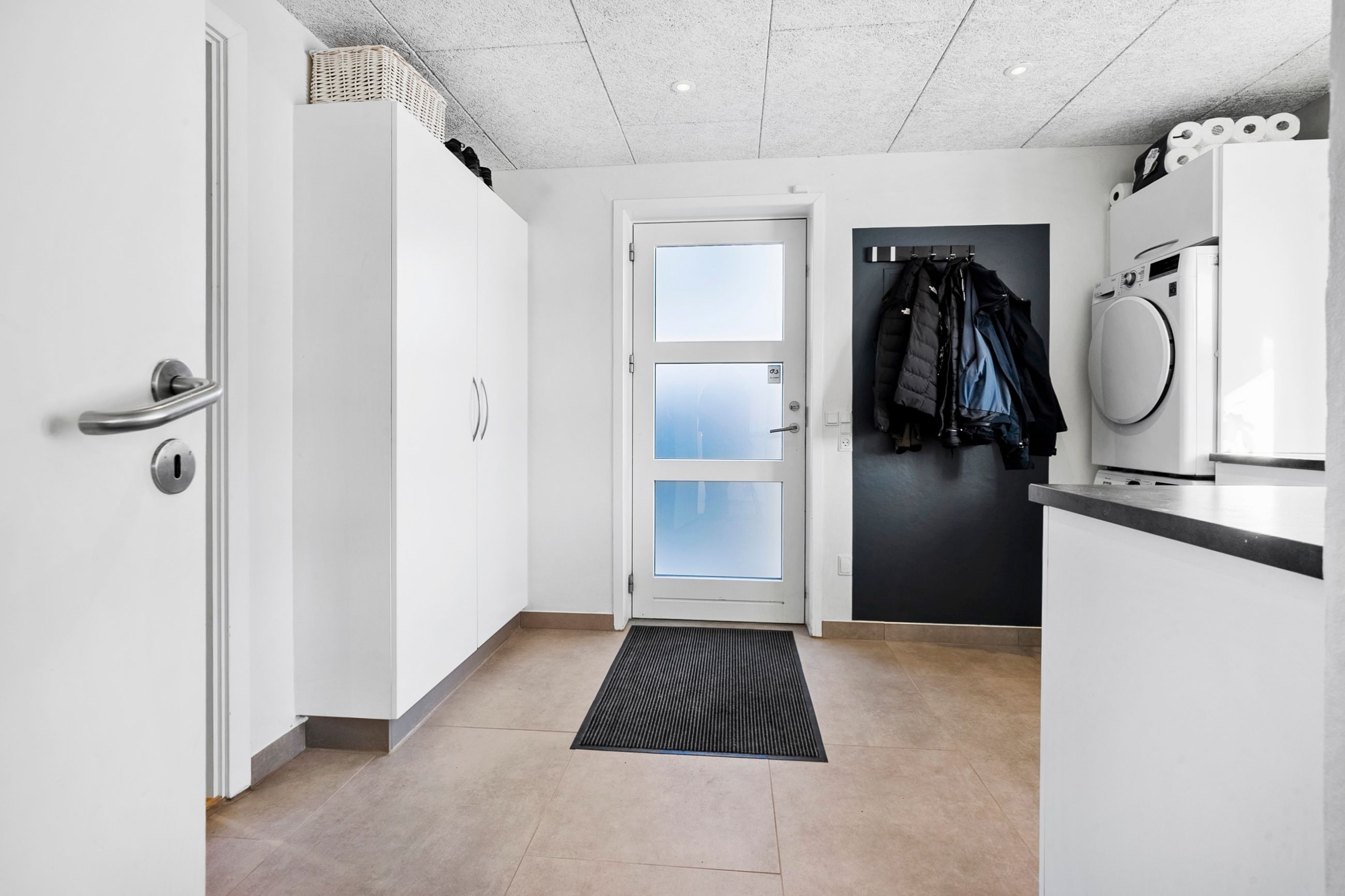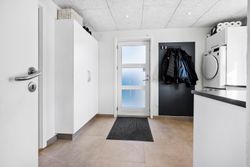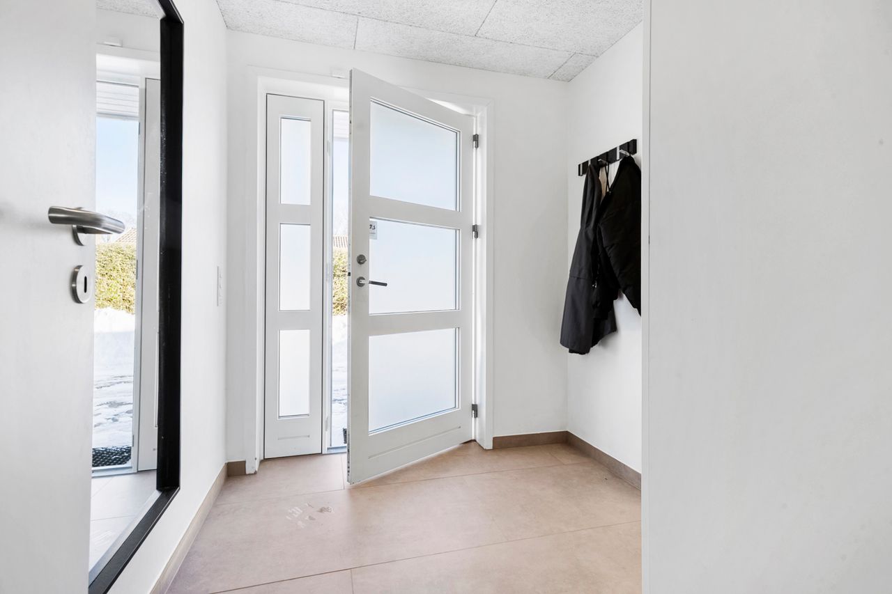 Allerede når du træder ind i det rummelige bryggers, mærker du, at her er god plads til opbevaring og til at holde styr på familiens dagligdag. I forlængelse af bryggerset ligger et værelse, der i dag fungerer som hjemmekontor, men det kan lige så nemt indrettes som gæsteværelse eller børneværelse. Videre kommer du til det åbne og lyse køkken, der indbyder til fælles madlavning. Herfra er der direkte udgang til terrassen, så udelivet let bliver en naturlig del af hverdagen. Køkkenet hænger sammen med spisestuen, som fungerer som husets samlingspunkt, hvor man kan mødes til måltider og hyggeligt samvær. I stueplan findes desuden endnu to værelser samt et badeværelse, hvilket giver fleksible muligheder for både børn og gæster.