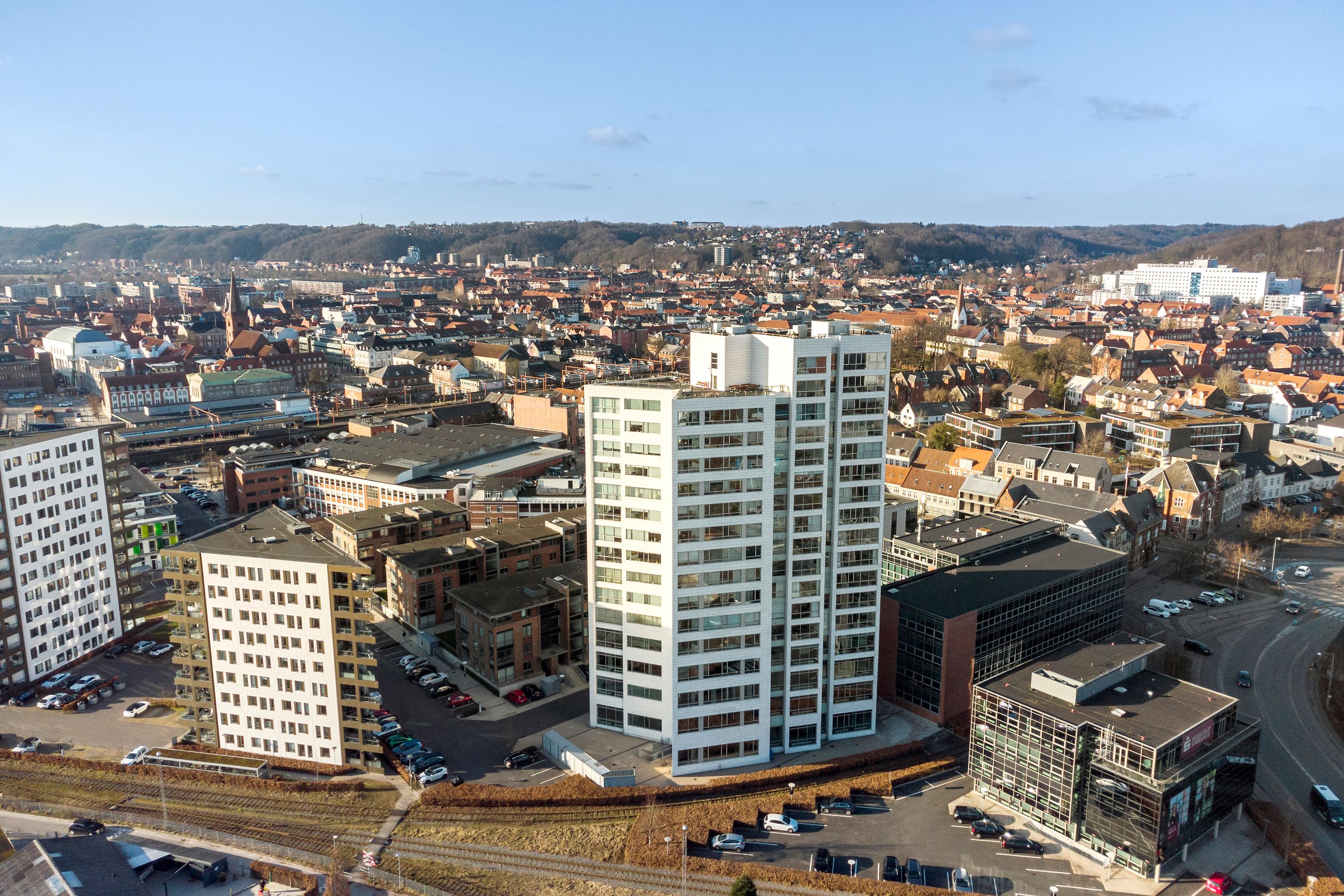 Med sin placering i en bygning, der rejser sig 56 meter over Vejle, får du her en bolig, hvor udsigten spiller hovedrollen. Fra de høje etager folder byen sig ud for dine øjne, mens fjorden og de bløde bakker i horisonten skaber en naturskøn kulisse.