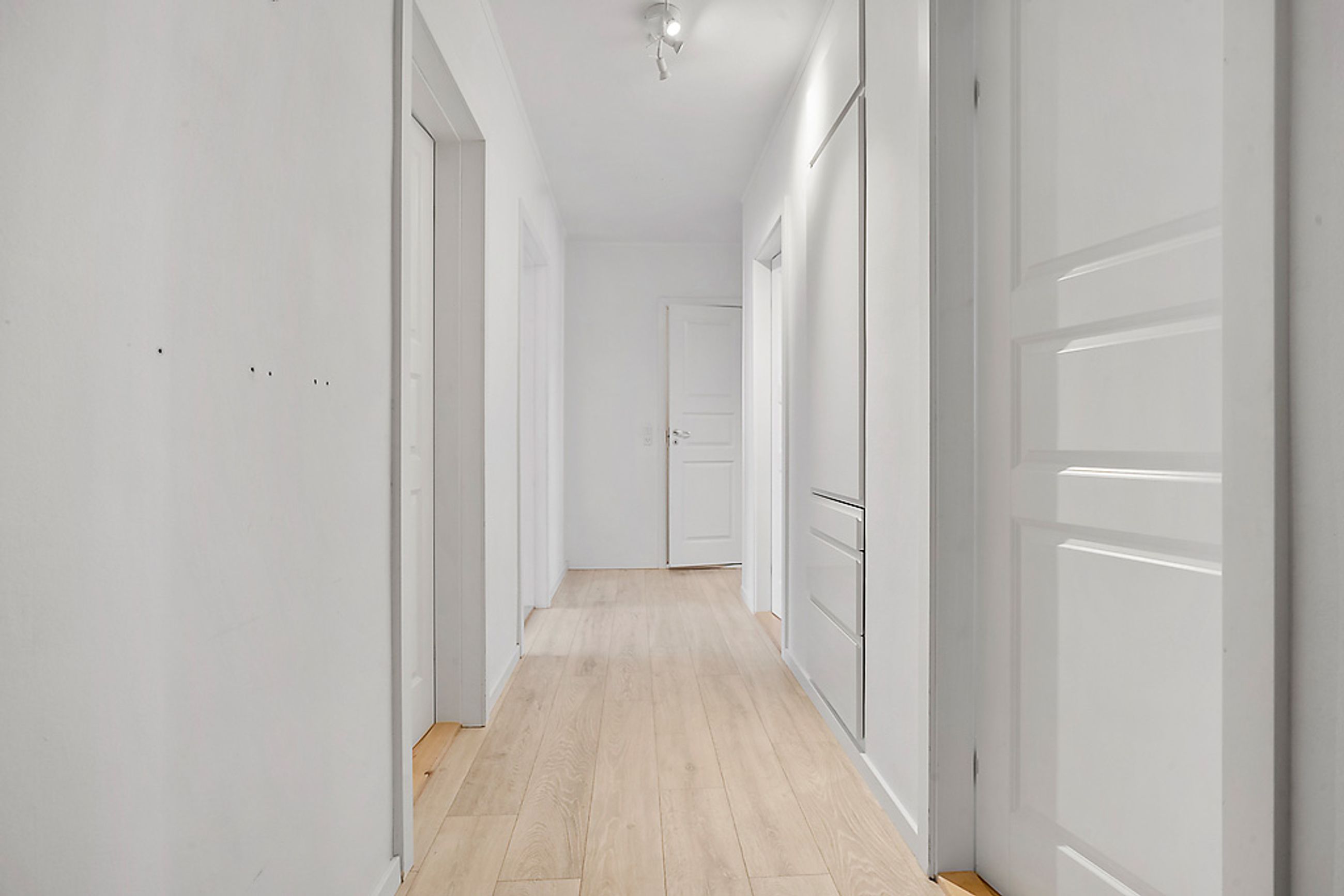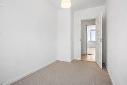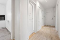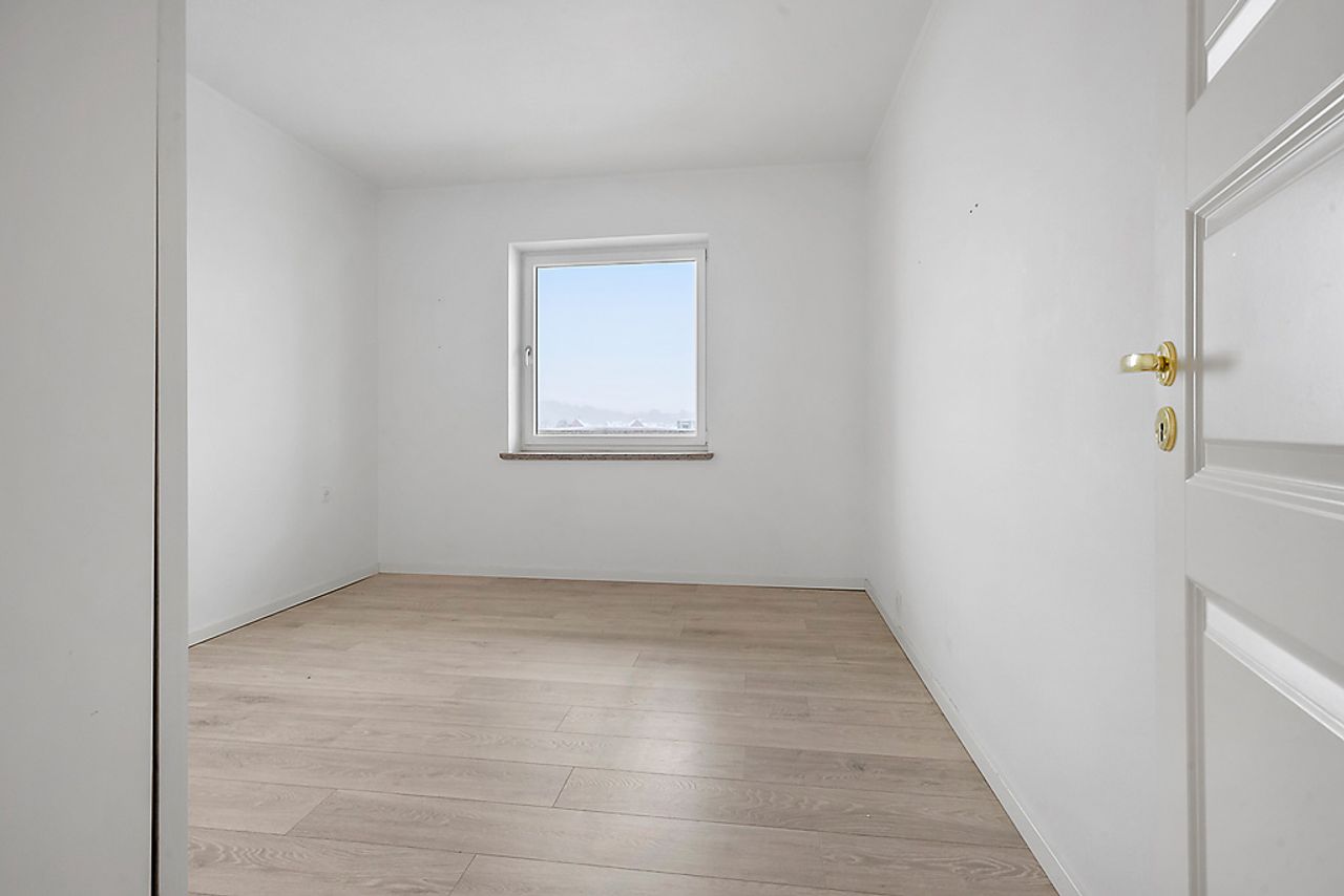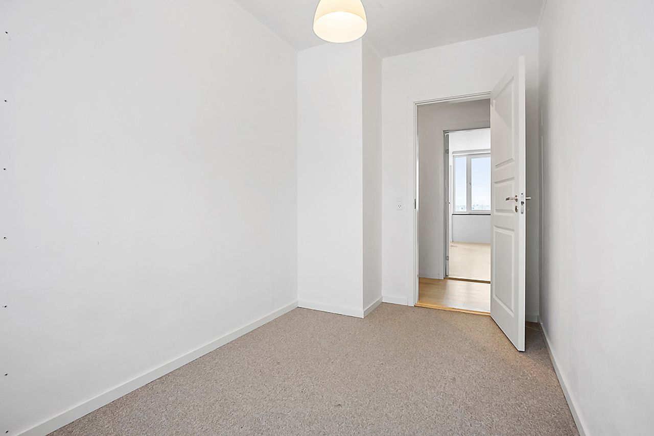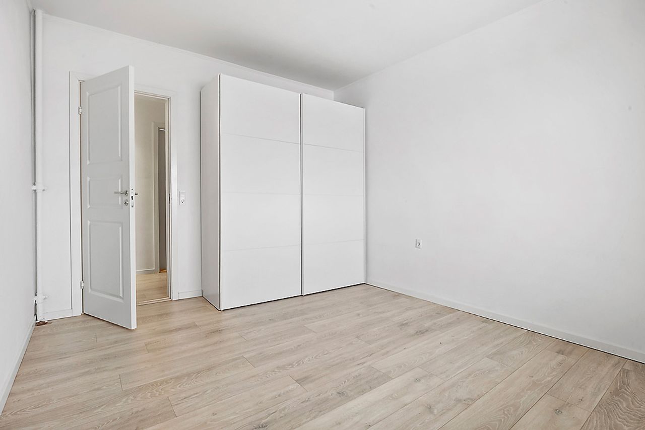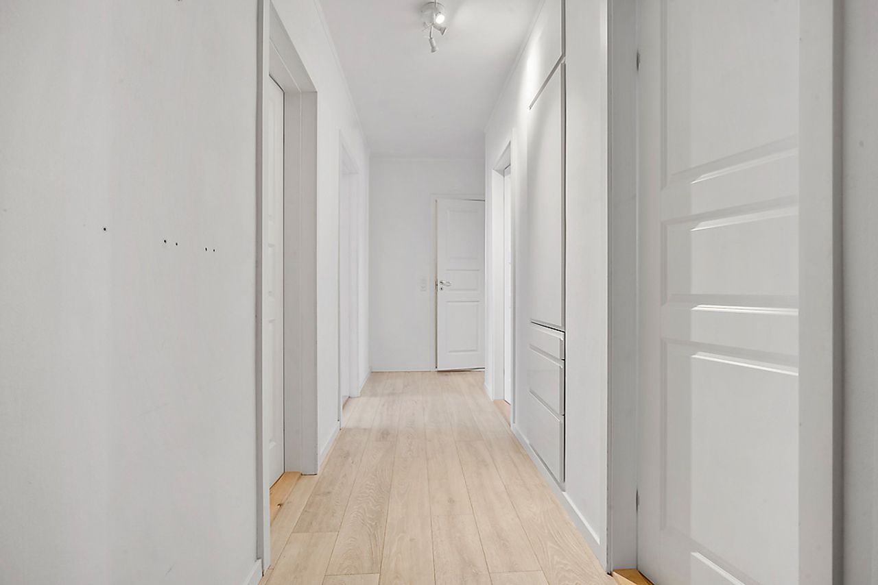 Når man træder ind i lejligheden via den rummelige fordelingsgang/entré med skabsplads til overtøjet, mødes man af flotte gennemgående gulve i entréen såvel som i stuen og værelserne. De store vinduer lader masser af lys strømme ind i alle rum, hvilket sammen med de hvide vægge giver et lyst og luftigt indtryk.
