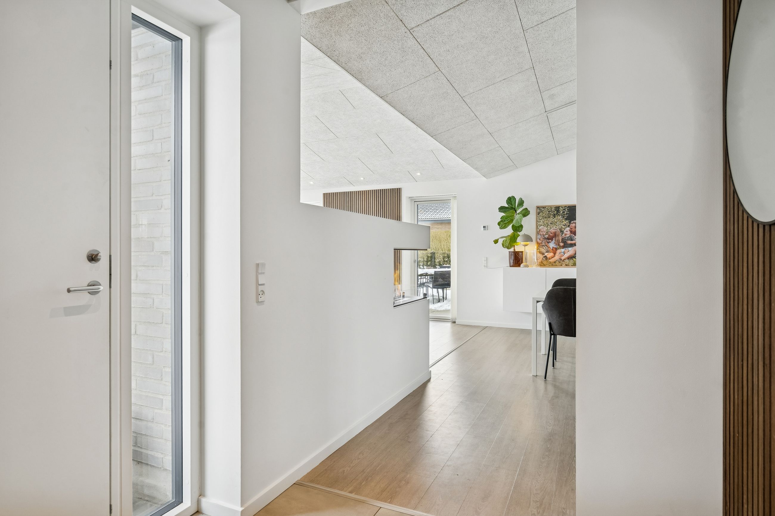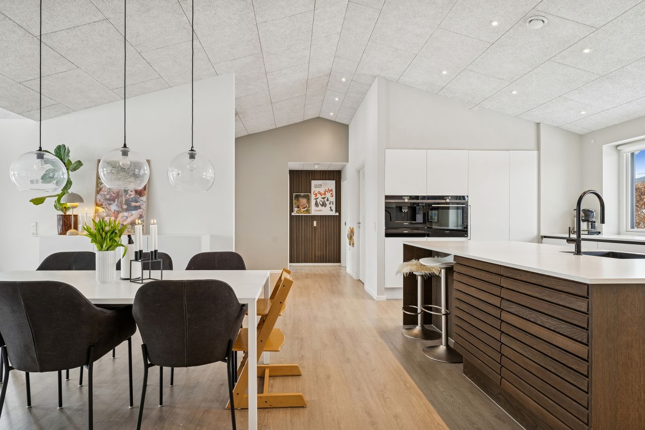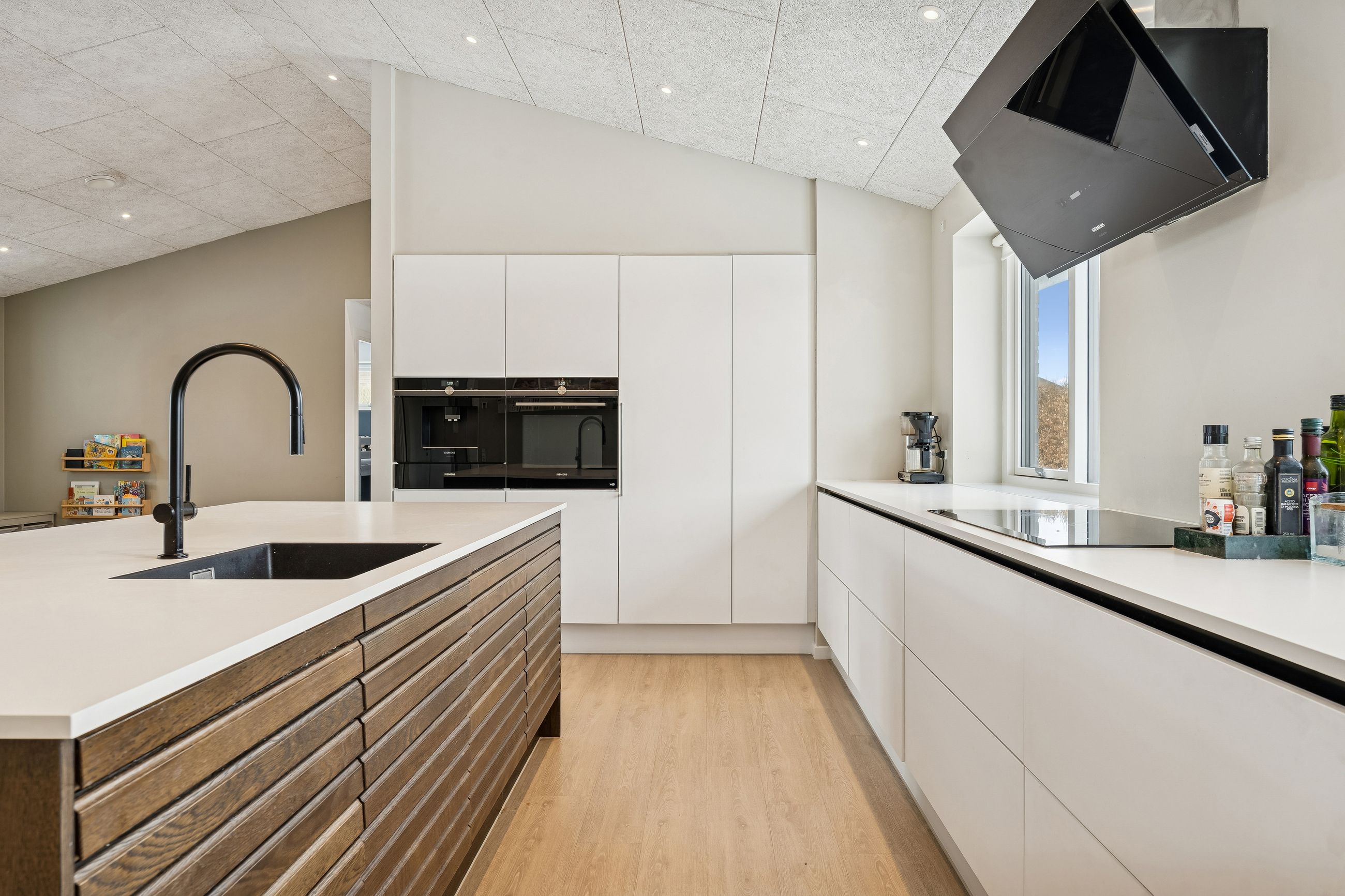 Fra den rummelige dobbeltgarage er der direkte adgang til husets bryggers, hvor der er god plads til både vaskemaskine og tørretumbler samt opbevaring af overtøj og hverdagens praktiske ting. Herfra fortsætter I ind i entréen, som byder velkommen og giver adgang til boligens naturlige samlingspunkt – det store og lyse køkken/alrum. Køkken/alrummet ligger i åben forbindelse med stuen og skaber et dejligt opholdsområde med plads til både hverdagens aktiviteter og hyggelige stunder med familie og venner. De store opholdsrum giver en god rumfornemmelse og et behageligt lysindfald.