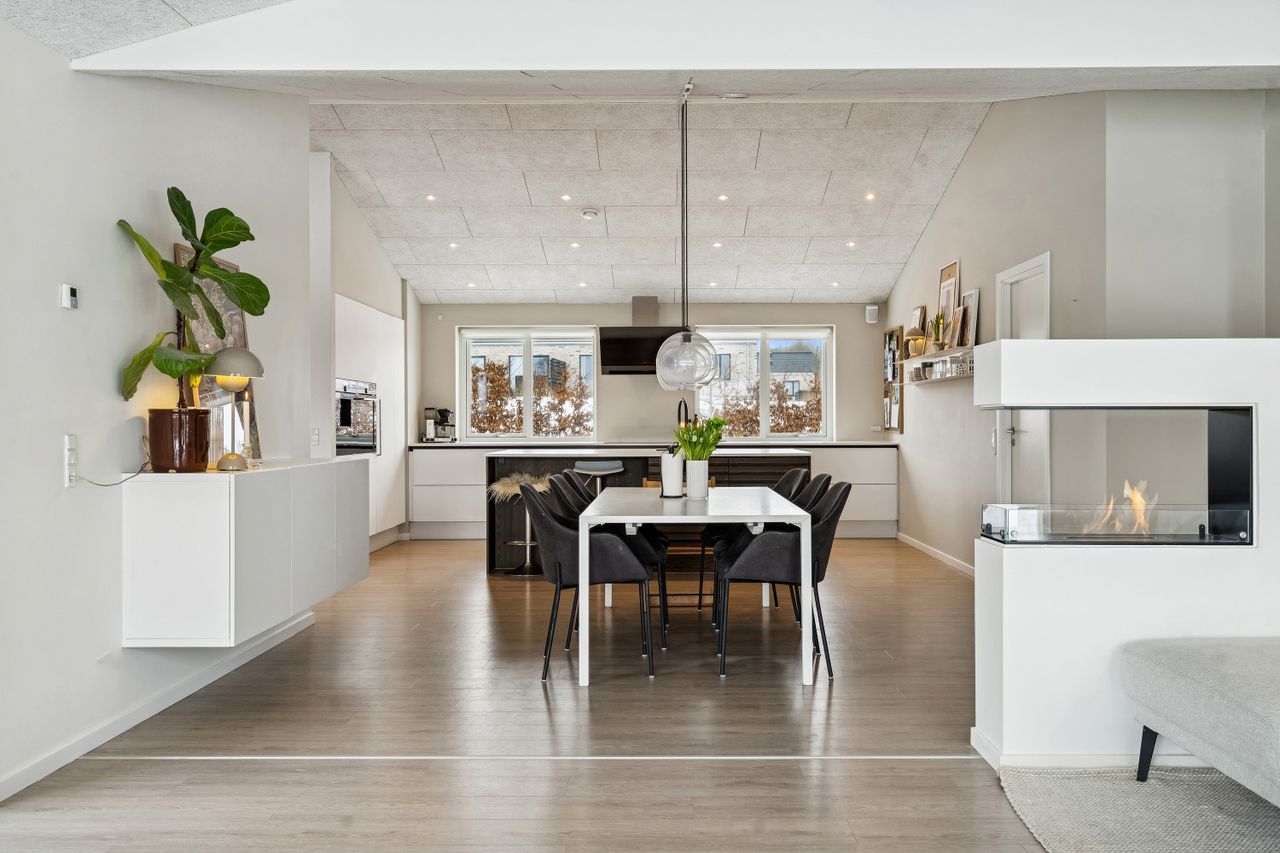 Stuen er hyggeligt indrettet og har en gennemgående biopejs, som elegant forbinder stue og køkken/alrum og skaber en varm og indbydende atmosfære i begge rum. Her er god plads til både spiseafdeling og sofahjørne, hvor familien kan samles.