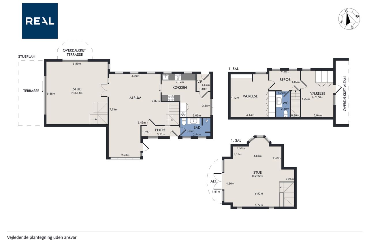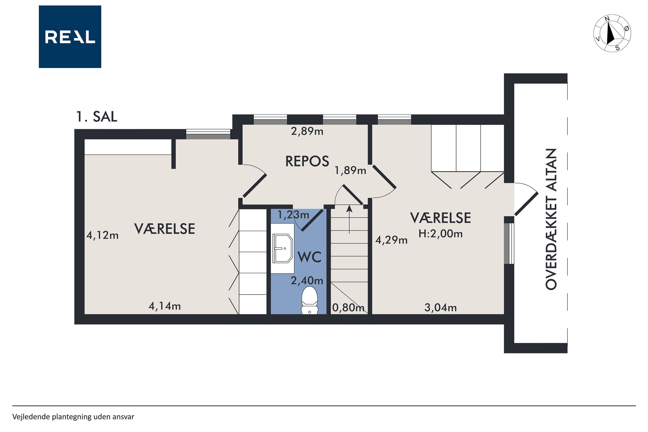 På 1.sal kommer man op til en stor stue med udsigt over området, denne stue kunne også benyttes til forældresoveværelse. På husetes anden 1.sal findes to værelser, den ene med adgang til overdækket altan. Udover de to gode værelser findes også et toilet, hvilket gør denne afdeling oplagt til børneafdeling.