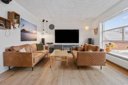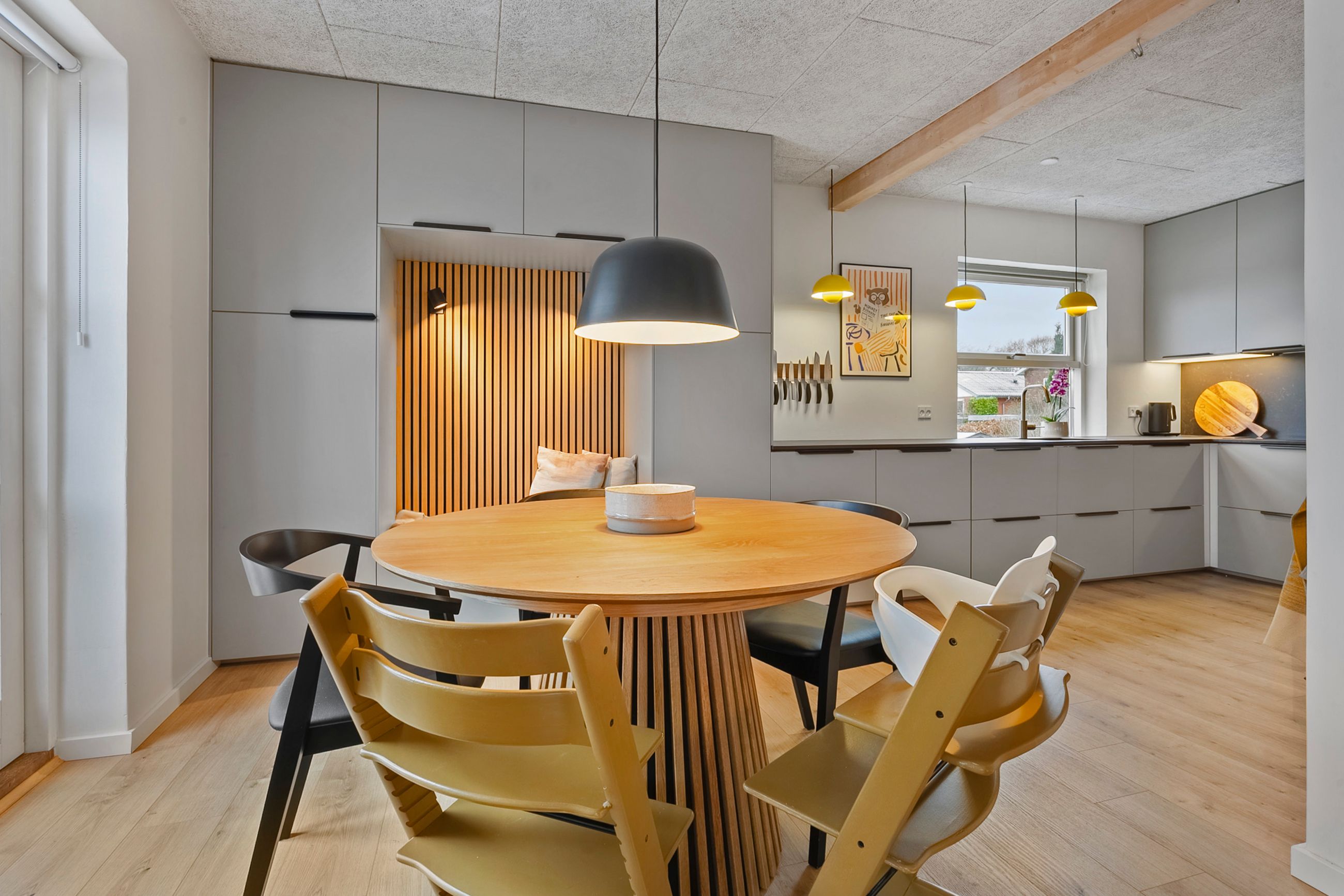 Stuen er hyggelig og indbydende med en varm pejs, der skaber atmosfære og fungerer som et naturligt samlingspunkt på kølige aftener. Rummet er ideelt til både afslapning og sociale stunder, hvor lys, plads og varme går hånd i hånd.