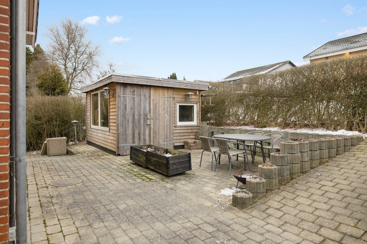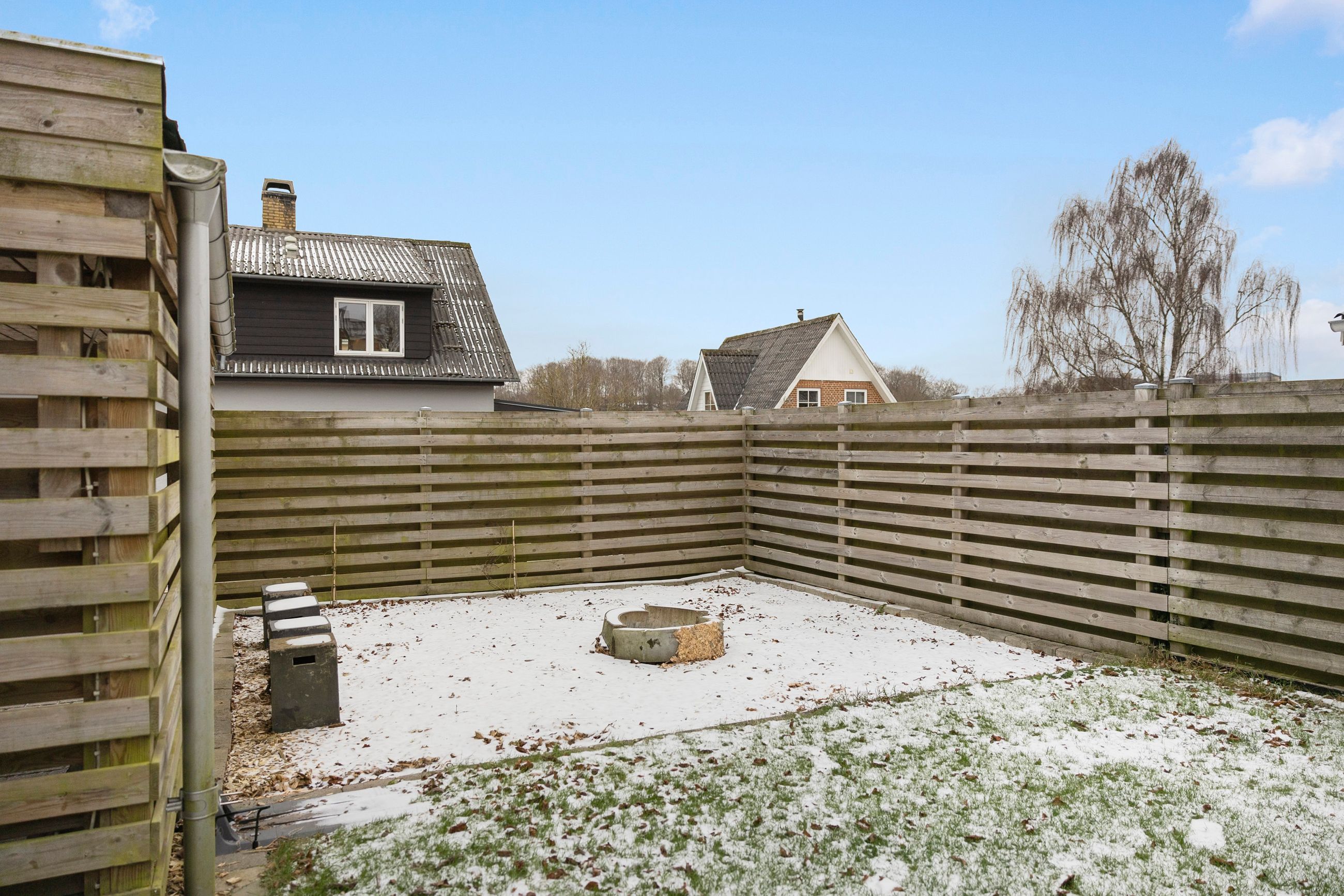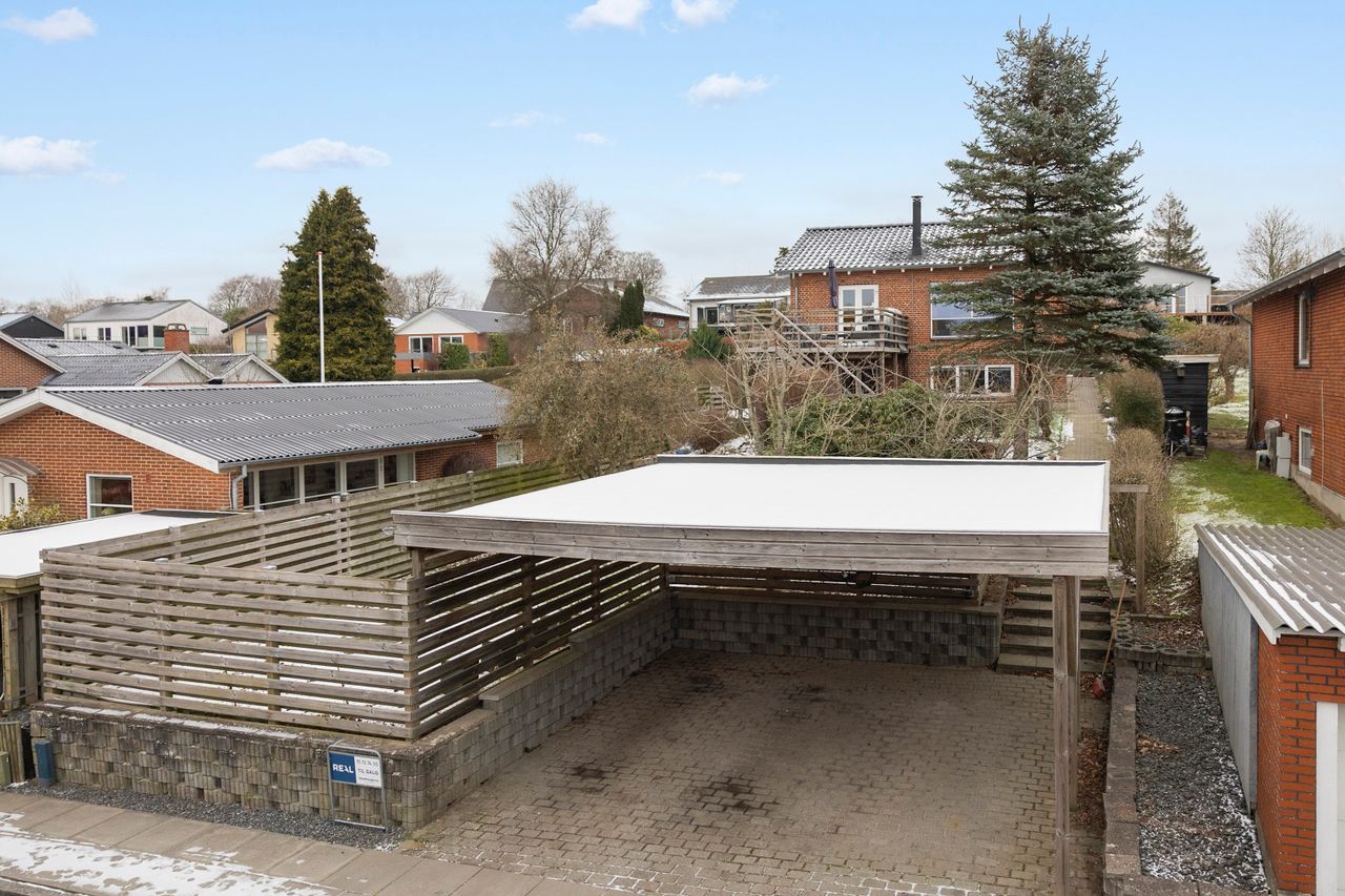 Man træder ind i entréen, som giver adgang til køkkenalrummet og videre til stuen. Køkkenalrummet er husets naturlige samlingspunkt, med god plads til madlavning og hverdagshygge. Fra alrummet er der udgang til den hævede terrasse, og man har samtidig udsigt over haven, hvor der findes et praktisk skur til opbevaring af haveredskaber og udstyr. Til boligen hører også en carport, som gør parkering nem og bekvem.