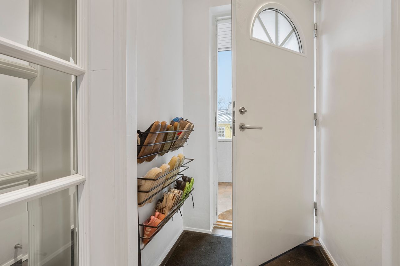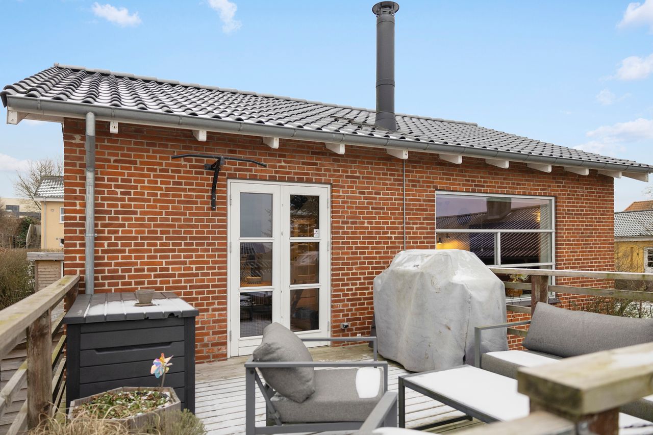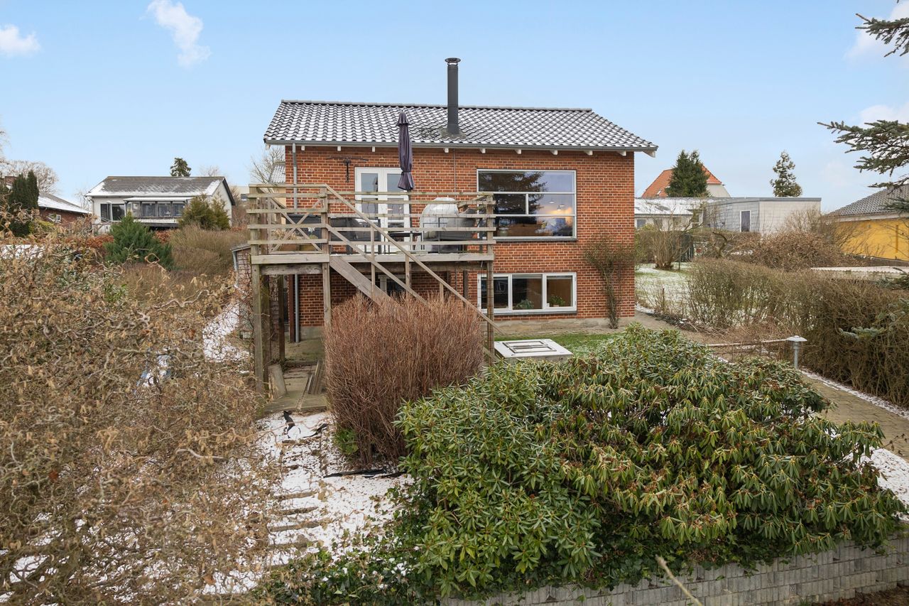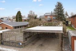 Man træder ind i entréen, som giver adgang til køkkenalrummet og videre til stuen. Køkkenalrummet er husets naturlige samlingspunkt, med god plads til madlavning og hverdagshygge. Fra alrummet er der udgang til den hævede terrasse, og man har samtidig udsigt over haven, hvor der findes et praktisk skur til opbevaring af haveredskaber og udstyr. Til boligen hører også en carport, som gør parkering nem og bekvem.