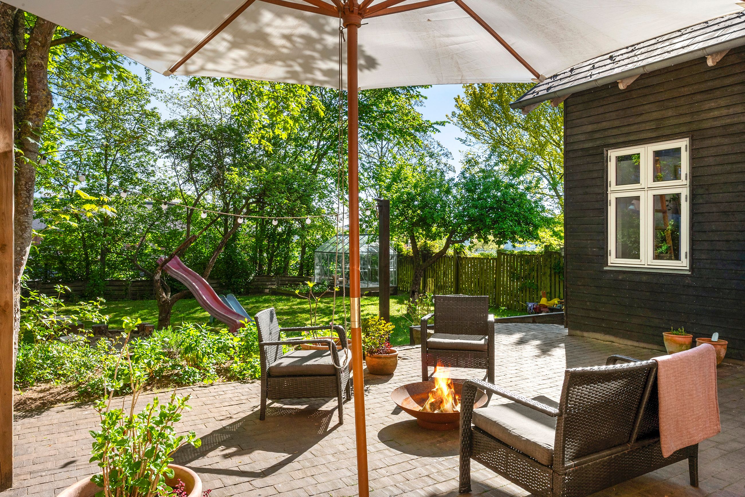 Haven er nem at vedligeholde og byder på masser af muligheder for både leg og afslapning. Med direkte adgang fra stuen er det nemt at holde øje med børnene, mens de leger frit udenfor.