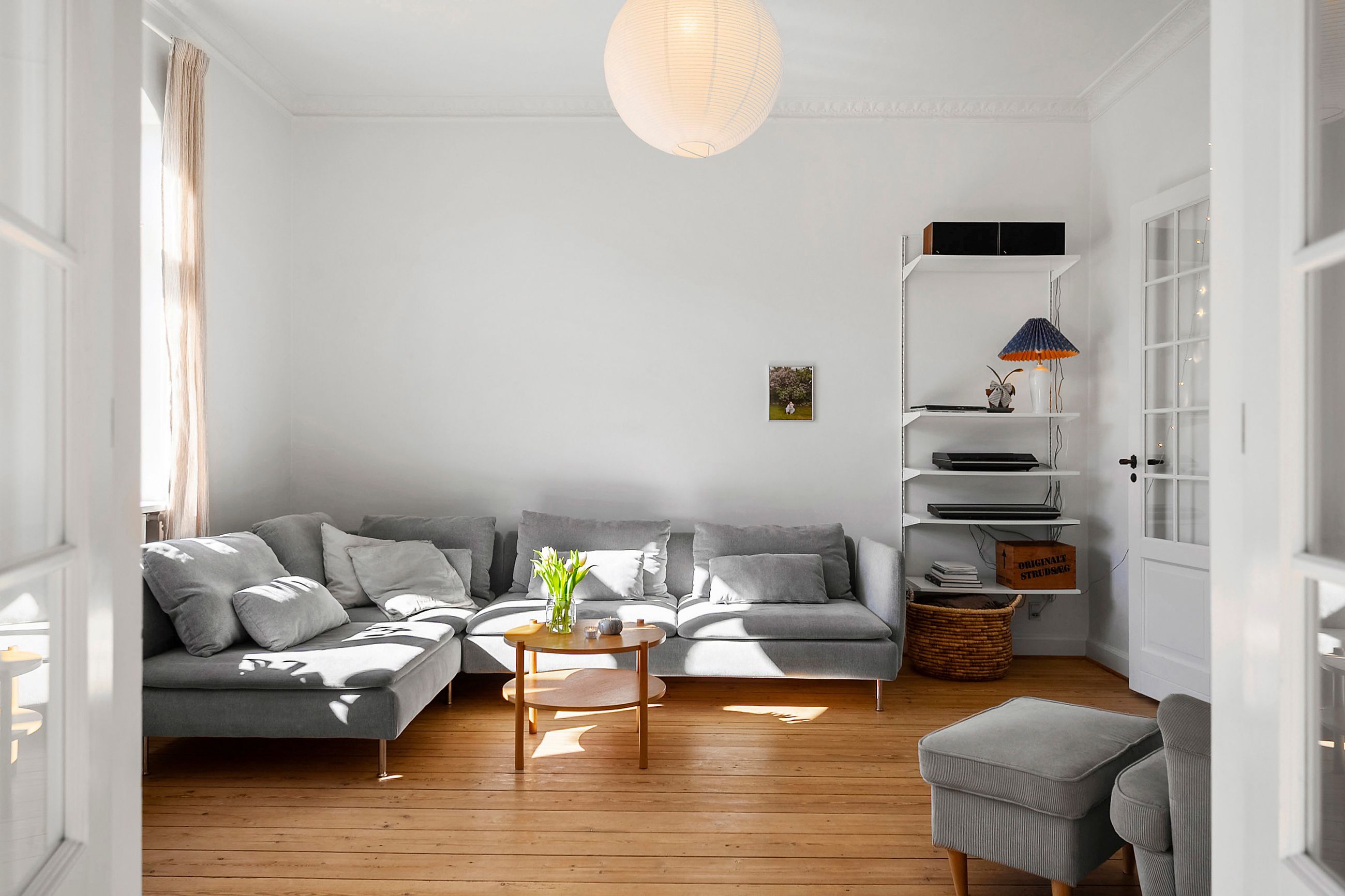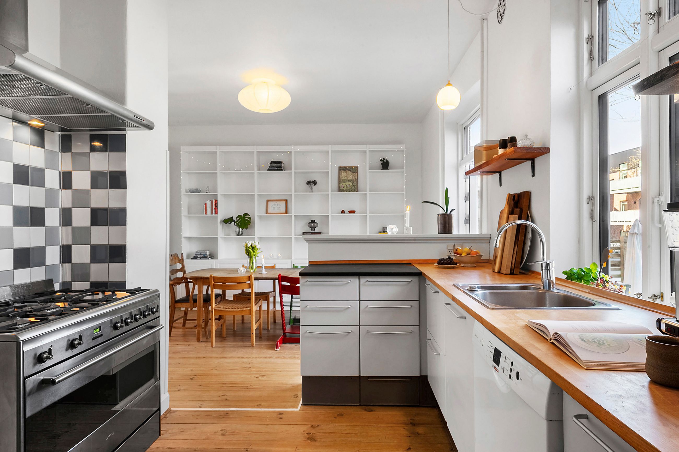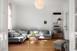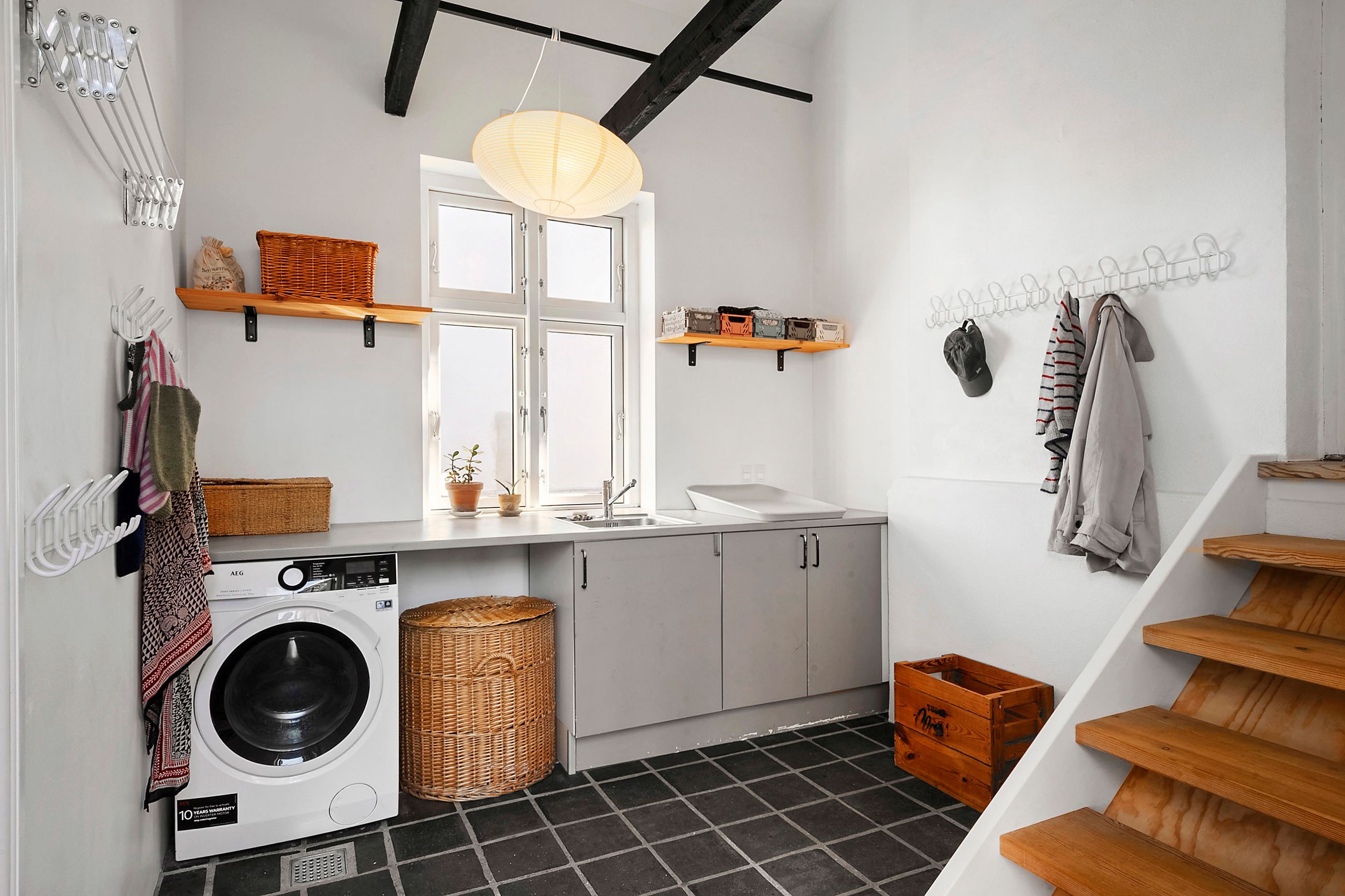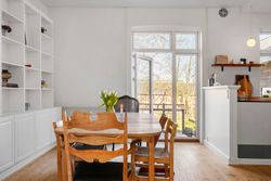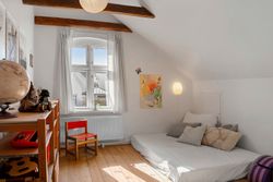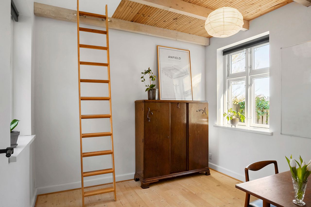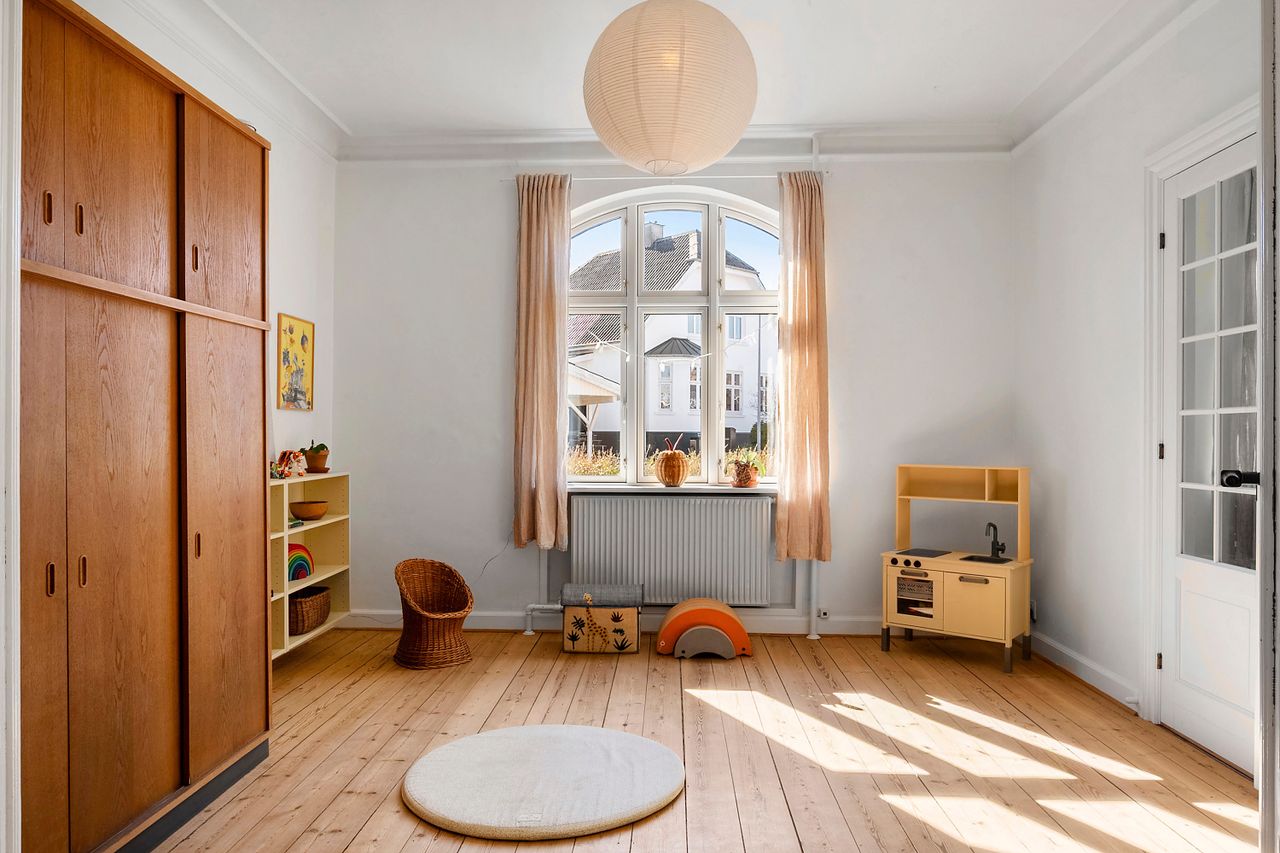 Når vi træder indenfor, mødes vi af et lyst og indbydende vindfang, som leder videre ind i husets stueplan. Her åbner hjemmet sig med store herskabelige stuer i åben forbindelse med en rummelig spisestue og et hyggeligt køkken, der indbyder til samvær. Fra stuen kan man via en terrassedør træde direkte ud i haven, der på fineste vis bliver en forlængelse af hjemmets opholdsrum. Ved siden af stueområdet ligger en funktionel tilbygning, som byder på et praktisk bryggers samt et ekstra værelse med hems, ideelt som hobbyrum eller teenageværelse. Stueplanen fuldendes af et gæstetoilet.