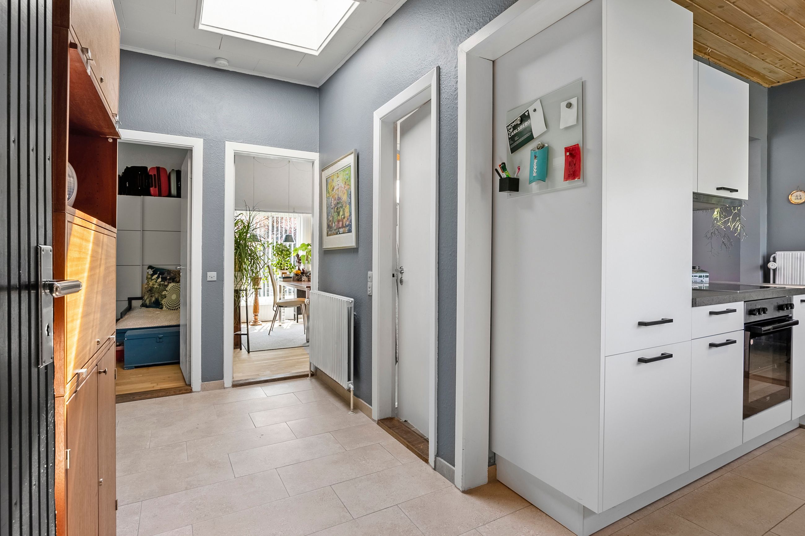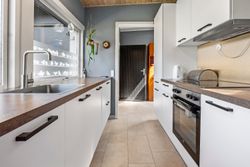 Køkkenet er holdt i en klassisk, hvid stil og giver god plads til både madlavning og opbevaring. Store vinduespartier skaber et lyst og behageligt arbejdsmiljø. Fra køkkenet er der adgang til en stor og indbydende stue/spisestue, hvor hjemmets hjerte for alvor mærkes – perfekt til både hverdagsmåltider og hyggelige aftener. Her er ligeledes store vinduespartier og direkte udgang til haven, hvilket skaber en naturlig forlængelse af boligen ud i det fri.