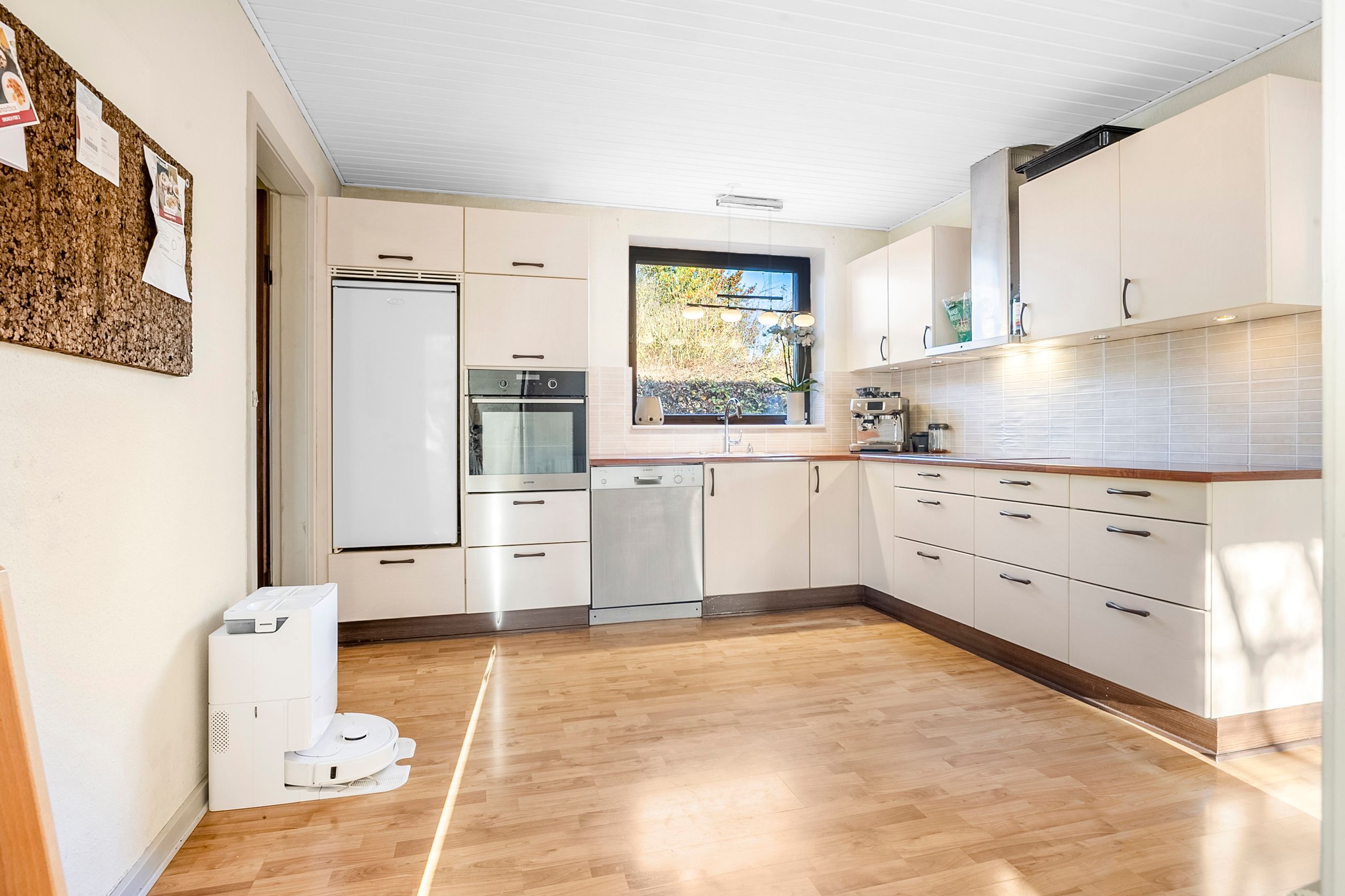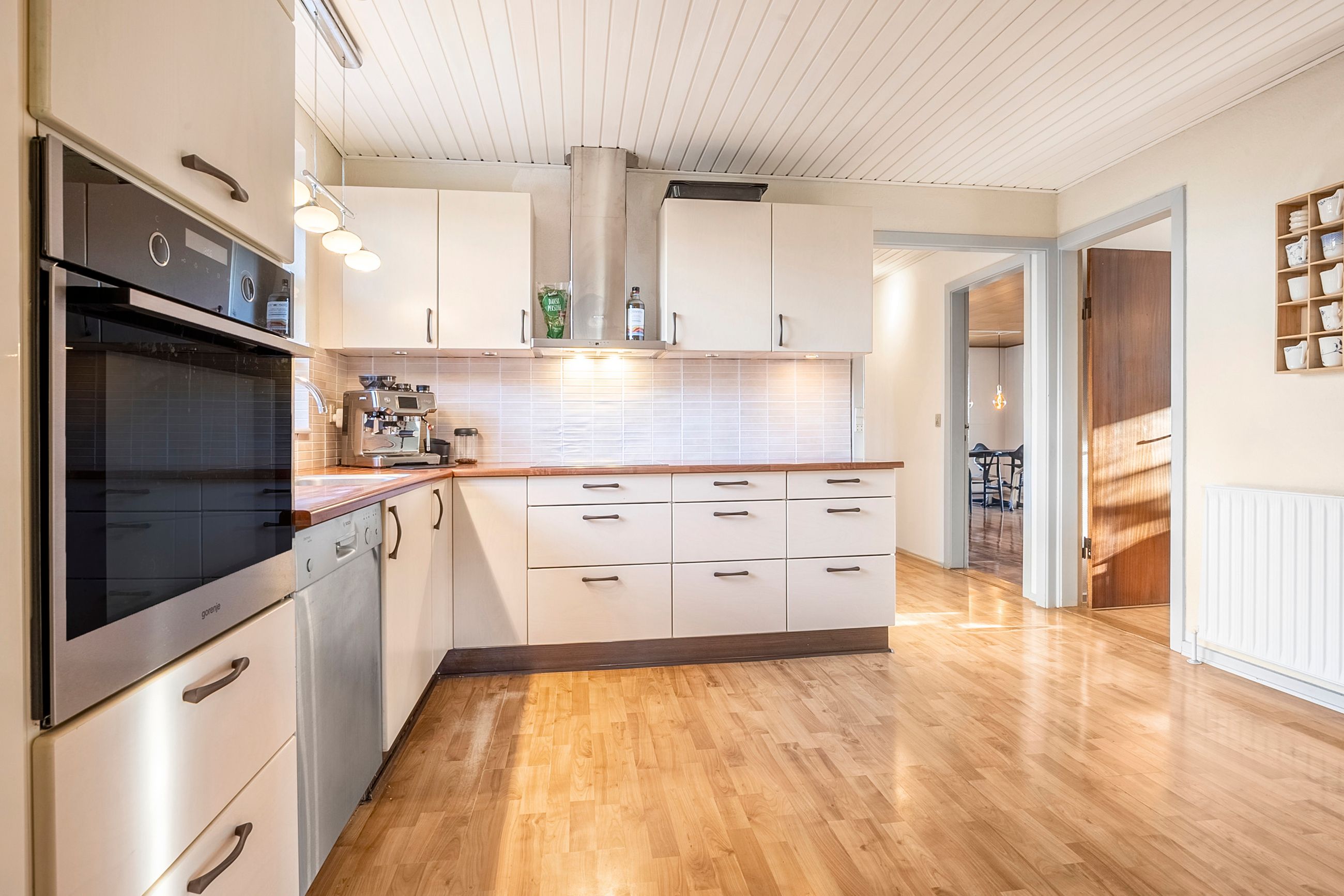 Køkkenet er funktionelt og rummeligt med mulighed for en mindre spiseplads og fungerer som et naturligt samlingspunkt i hverdagen.