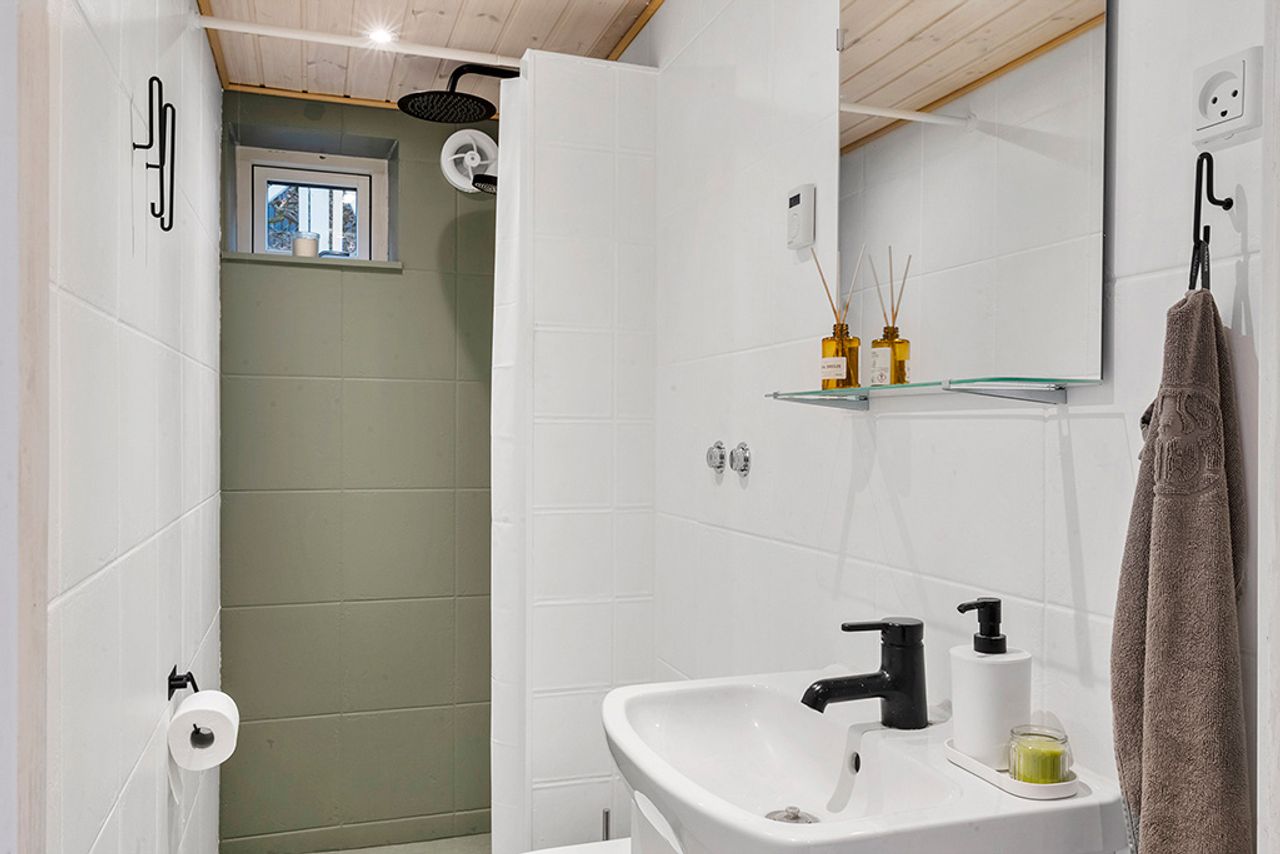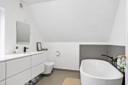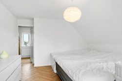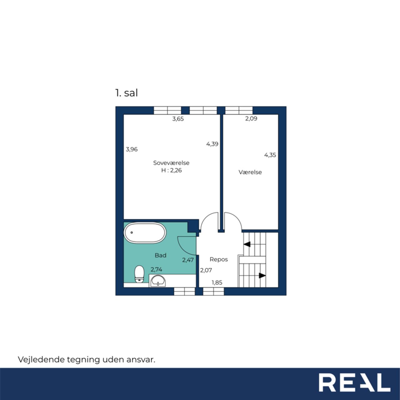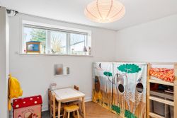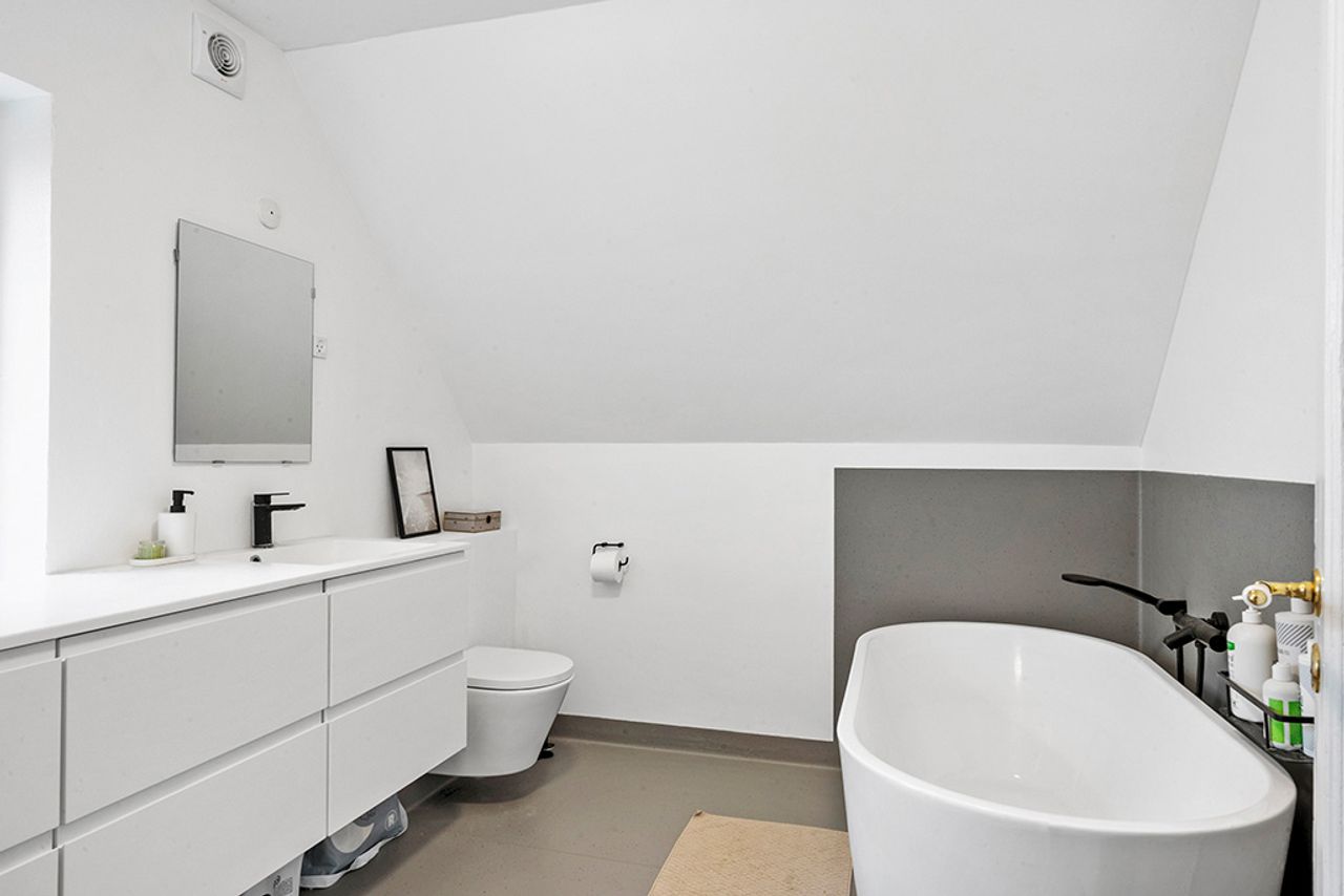På førstesalen finder du et stort forældresoveværelse, endnu et værelse – oplagt som børneværelse eller kontor – samt et stilrent badeværelse.
