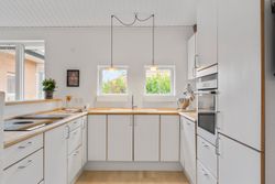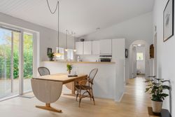 Husets naturlige samlingspunkt er det indbydende køkken og stuemiljø, hvor lyset strømmer ind fra flere sider. Her samles familien til madlavning, lektielæsning og hyggelige middage. Køkkenet er indrettet med tidløse elementer og god arbejdsplads, mens spiseafdelingen let rummer hele familien.