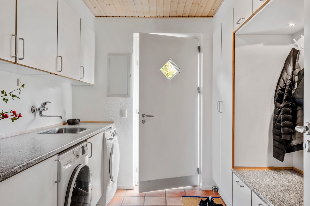 Allerede i entréen fornemmes boligens rummelighed og skønne atmosfære. Fra det praktiske bryggers er der direkte adgang til huset – ideelt til hverdagens travle rytme og med god plads til både vasketøj og overtøj.