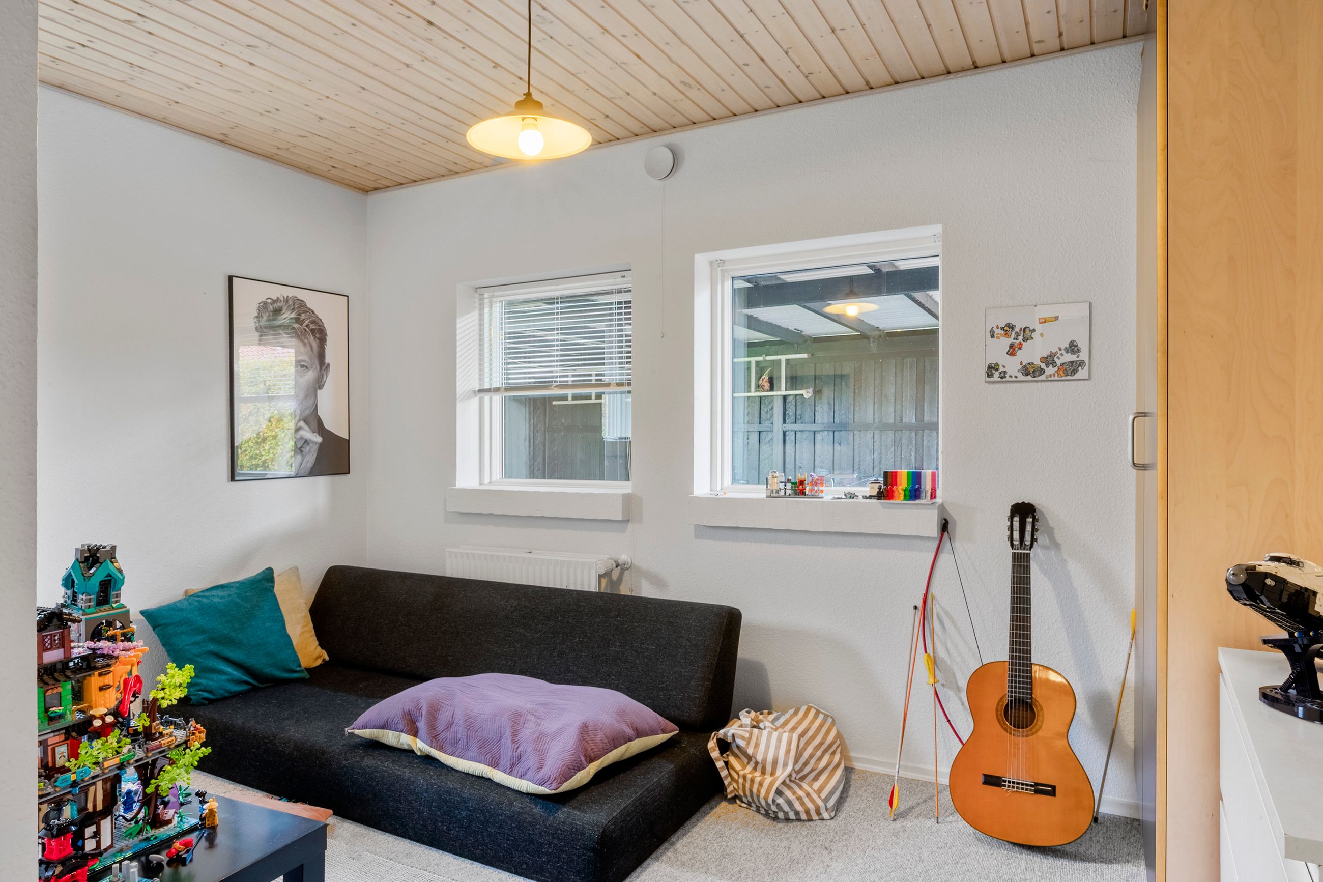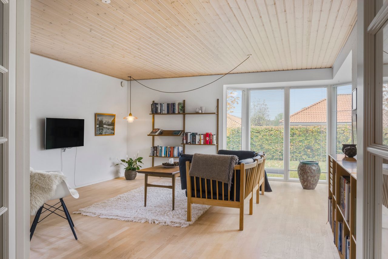 Fra alrummet er der adgang til den hyggelige stue, som med sin karnap og de store vinduespartier skaber en skøn rumfornemmelse og et kig til terrassen og haven. Her er der rig mulighed for både afslapning og samvær – et rum, der indbyder til ro og nærvær.