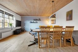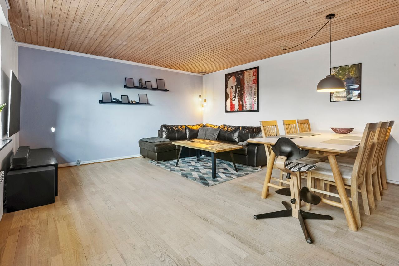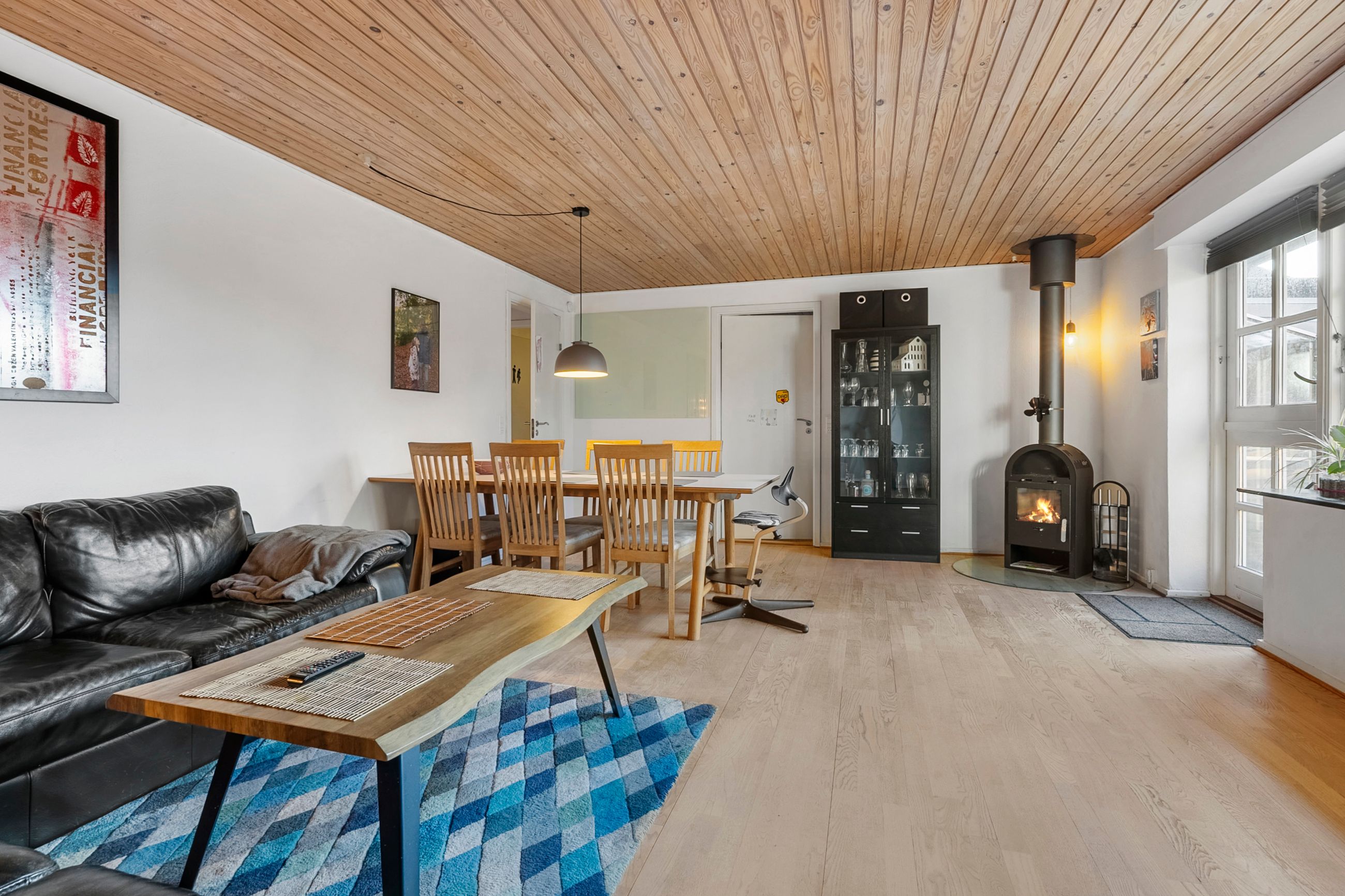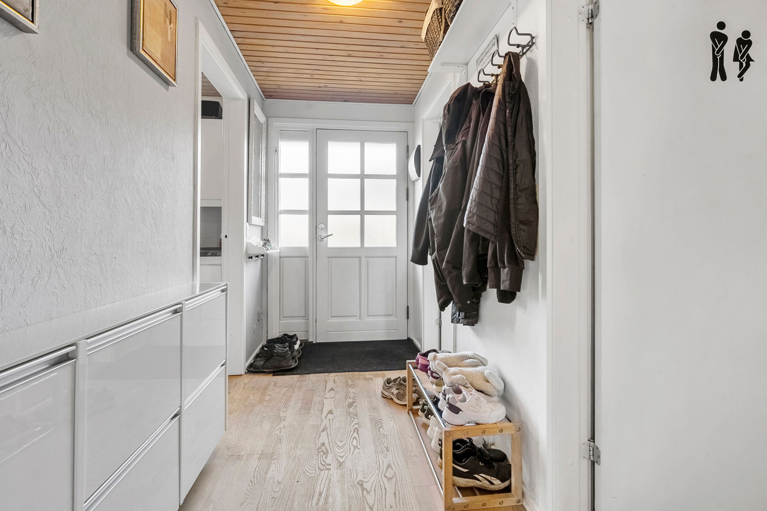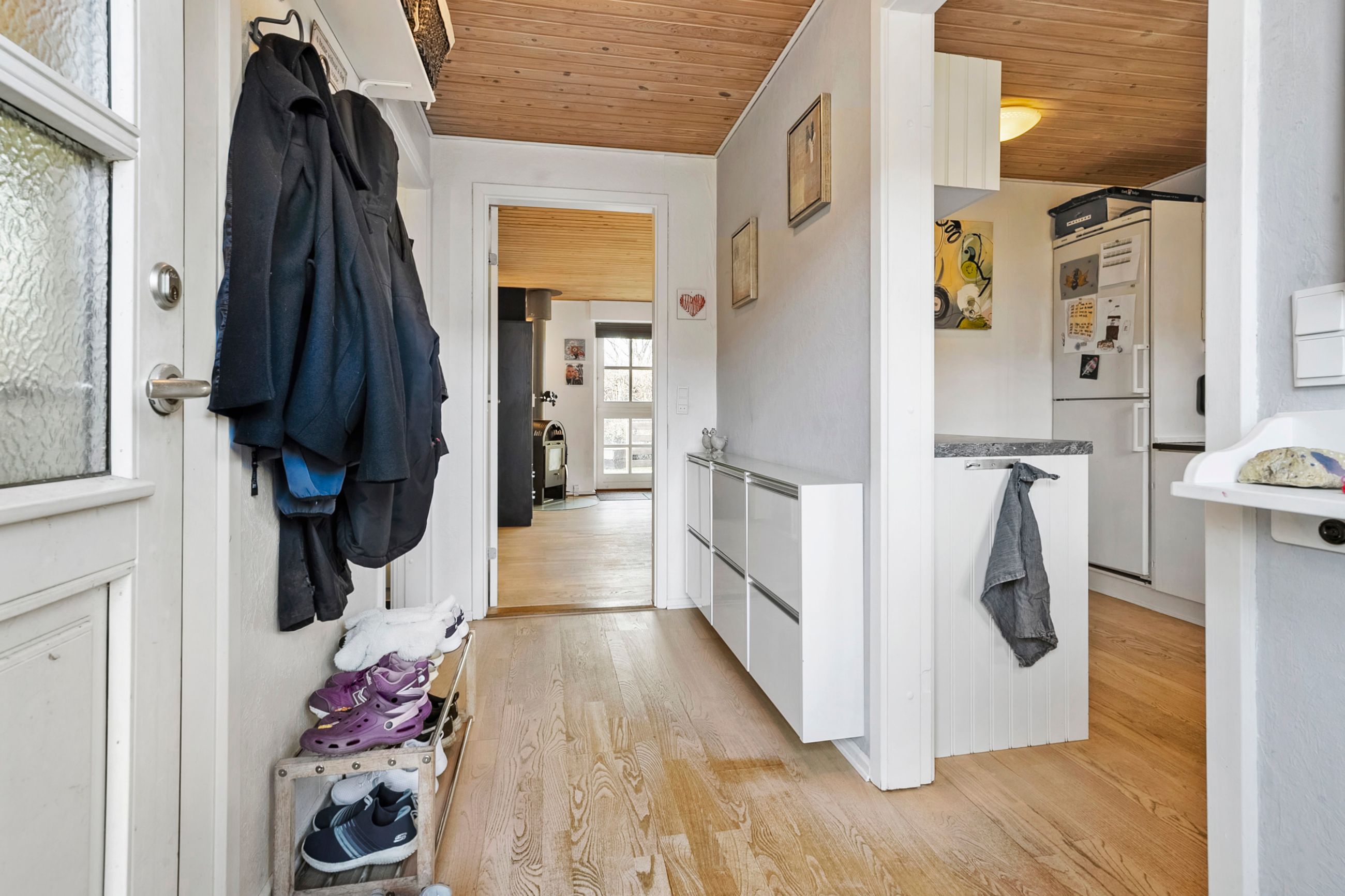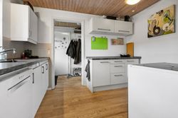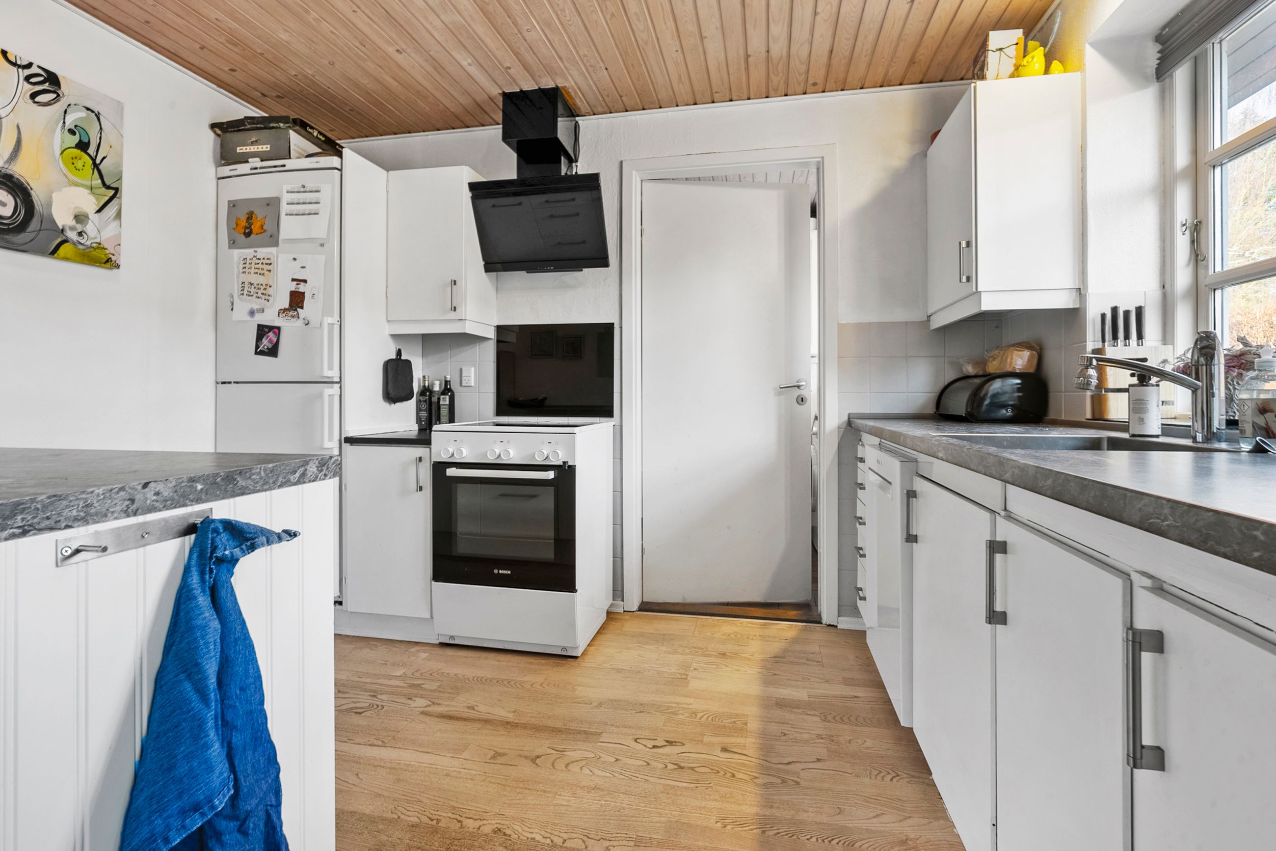 Indenfor mødes du af en lys og rummelig stue, der er ideel til både afslapning og hyggelige middage med plads til spisebordet. Stuen fungerer som hjemmets hjerte, hvor store vinduespartier sørger for et dejligt lysindfald dagen lang. Køkkenet er moderne indrettet med flotte elementer og masser af skabsplads, hvilket gør madlavningen til en fornøjelse.
