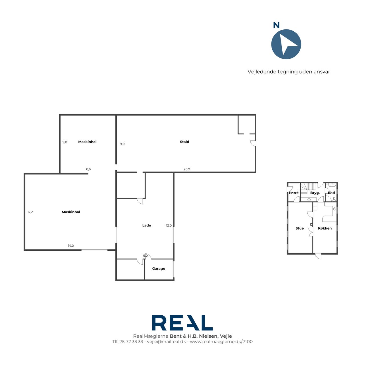 Drømmer I om et landsted i rolige omgivelser, skøn natur og et godt arealtilliggende? Så tag med til Brandbjerg, hvor denne ejendom er beliggende på en 1,15 ha. stor grund med plads til både afslapning, dyrehold eller mindre erhverv. I området omkring ejendommen er der rig mulighed for gåture i skønne omgivelser og på ca. 5 minutter fragter bilen jer til Jelling med skole, daginstitution samt indkøb. Desuden holder bussen lige udenfor døren. Vejle Centrum kan nåes indenfor ca. 15 minutters kørsel. Pendleren kan også glæde sig over, at finde motorvejstil- og frakørslen i kort afstand fra ejendommen. Udover beliggenheden kan du også glæde dig til en ejendom, bestående af et stuehus med en veldisponeret planløsning i 2 plan. I grundplan indeholder huset en entré med adgang til en stor stue med massive trægulve. I forlængelse af stuen ligger husets køkken med god plads til spisebordet. Herudover er der rummelig baggang/bryggers med fin plads til hverdagens gøremål og egen ind- og udgang. Lyst badeværelse med bruseniche. Via trappe fra baggangen er der opgang til en 1. sal, som byder på et repos med indgang til 2 gode værelser og et toilet. Grunden råder over et væld af muligheder med sine udbygninger, som blandt andet inkluderer 1 større kvægstald, en lade med integreret garage og anvendeligt maskinhus. Har du spørgsmål eller ønsker du ejendommen fremvist, så kontakt RealMæglerne Bent & H.B. Nielsen på tlf. 7572 3333 eller på mail vejle@mailreal.dk