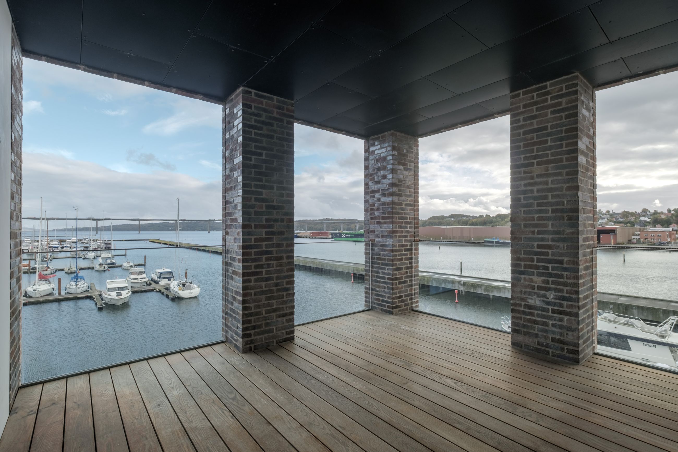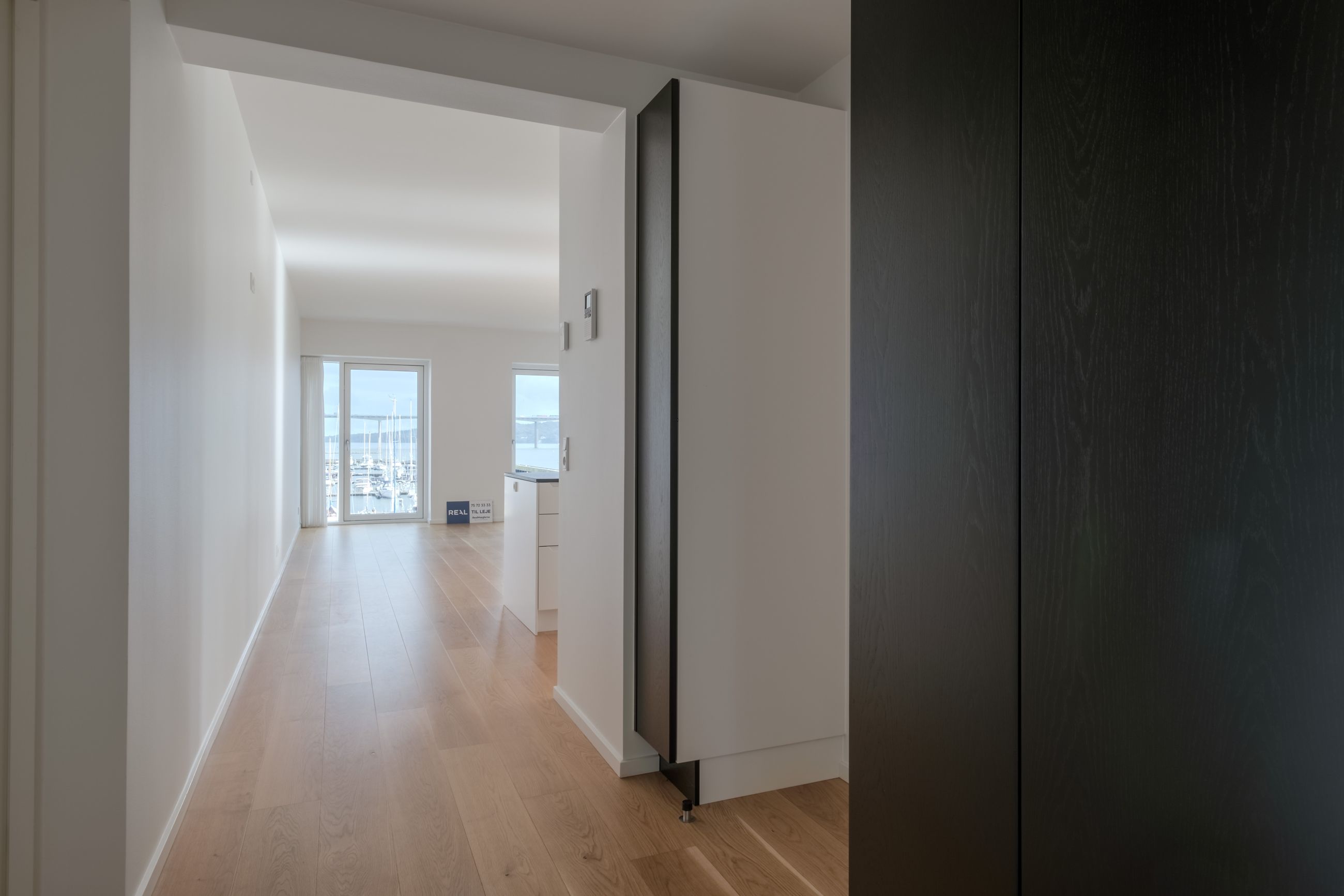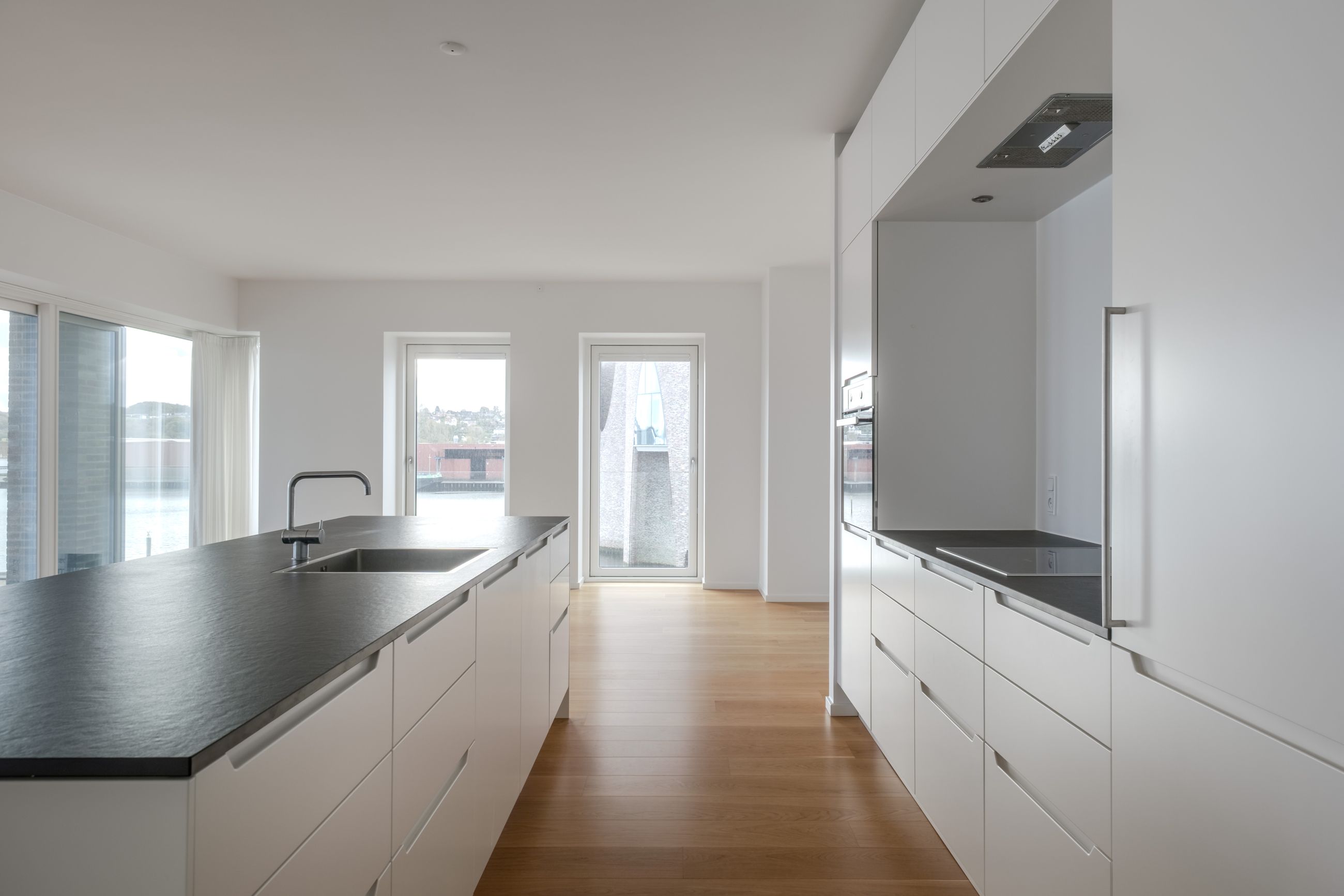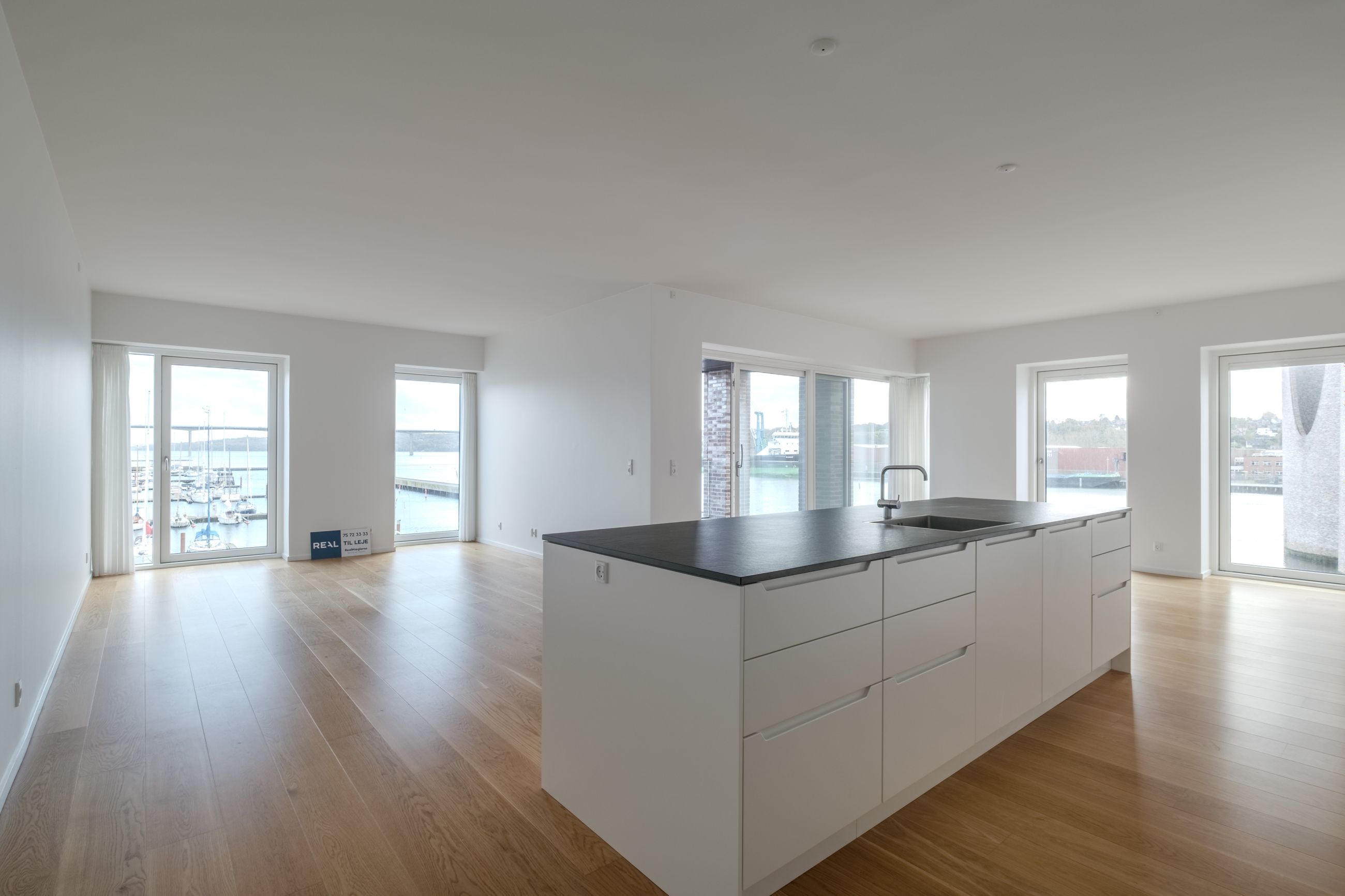 Lejligheden rummer hele 165 m2 fordelt på to værelser, to badeværelser, et praktisk depotrum og et stort, åbent køkken-alrum og stue med udgang til en sydvendt terrasse mod fjorden. Placeringen på 1. sal giver en perfekt balance – højt nok til at være ugenert, men stadig tæt på havnens liv og stemning.