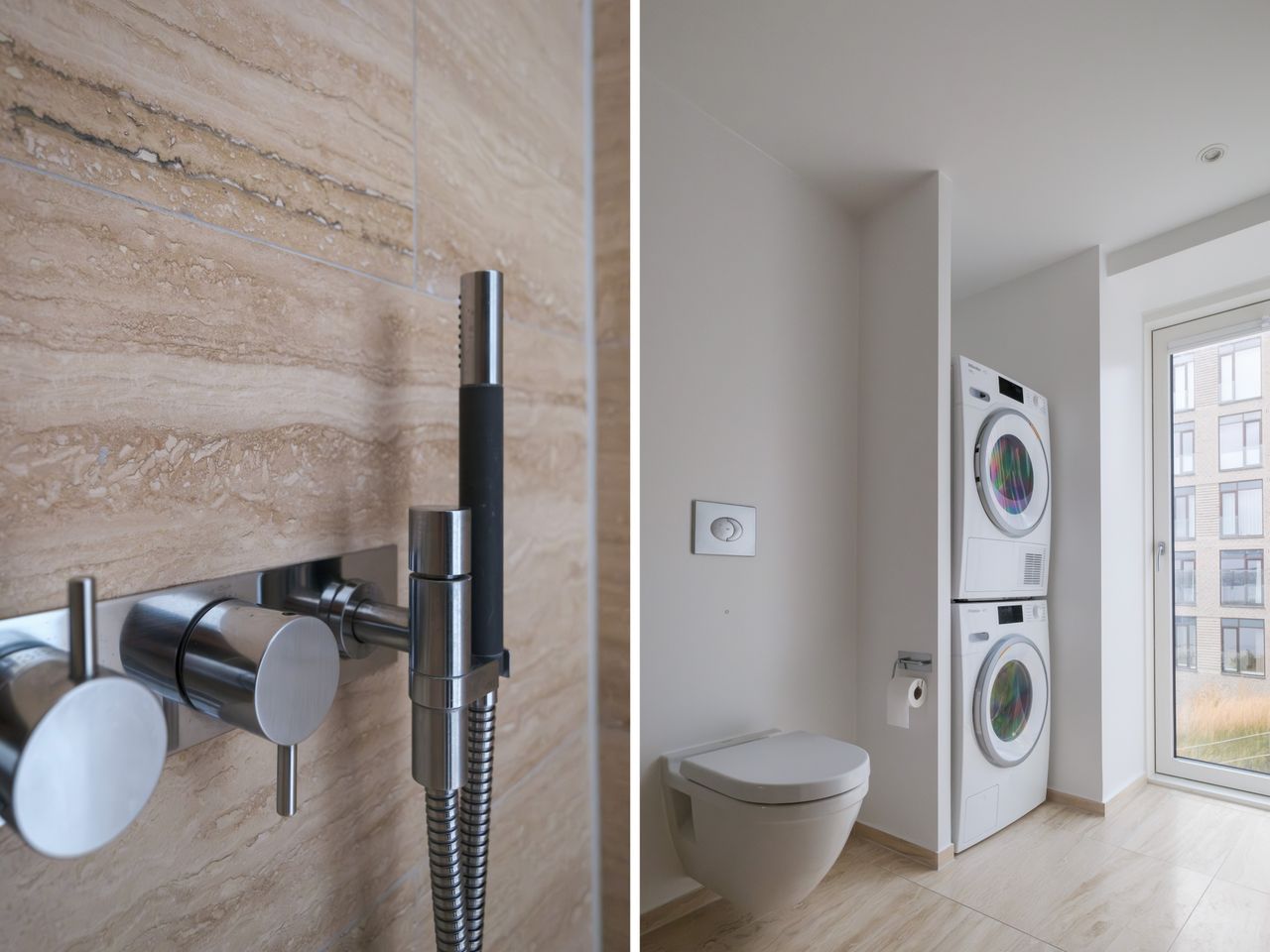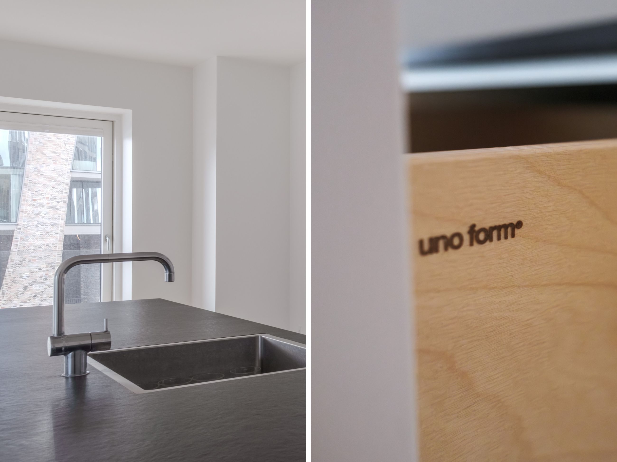 Kvaliteten er gennemført fra ende til anden: Uno Form-køkken, Vola-armaturer, plankegulve og elegante klinker i badeværelserne. Her er kræset for detaljerne i alle rum.