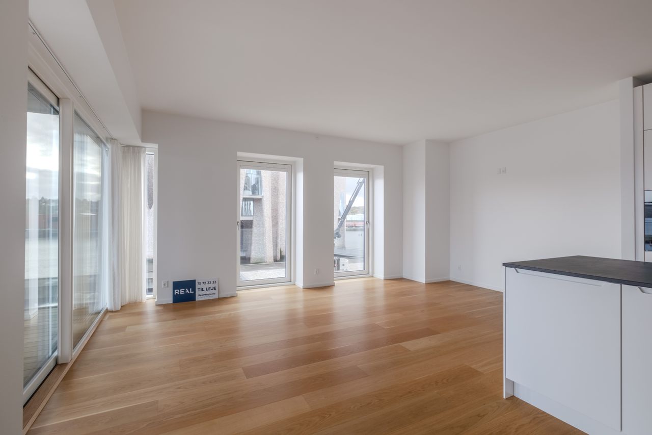 Drømmer du om at bo midt i Vejles mest prestigefyldte byggeri på Havneøen? Denne smukke lejlighed på 1. sal giver dig både udsigt, privatliv og en helt særlig atmosfære tæt på fjorden og Fjordenhus.
