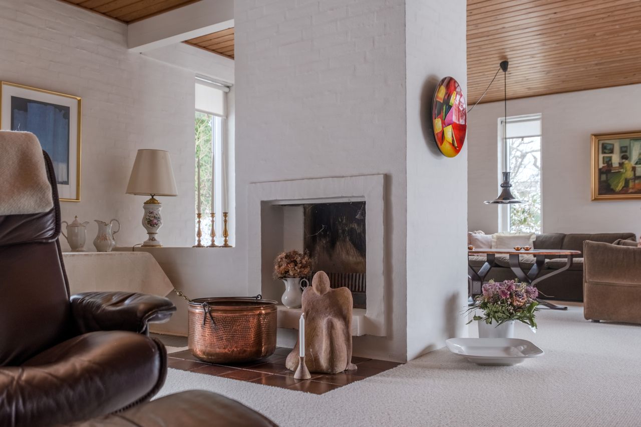 Indretningen byder på en stor og indbydende entré, som giver en god velkomst til hjemmet. Herfra åbner boligen sig op med det dejlige køkken/alrum med god spiseplads og et funktionelt køkken med masser af skabs- og bordplads. Lige ved side af ligger den imponerende store stue, som er opdelt i to naturlige zoner. Den åbne pejs fungerer som stemningsfuld rumdeler og skaber både hygge og karakter. Her er god plads til både spiseafdeling og dagligstue – perfekt til både hverdag og gæster.