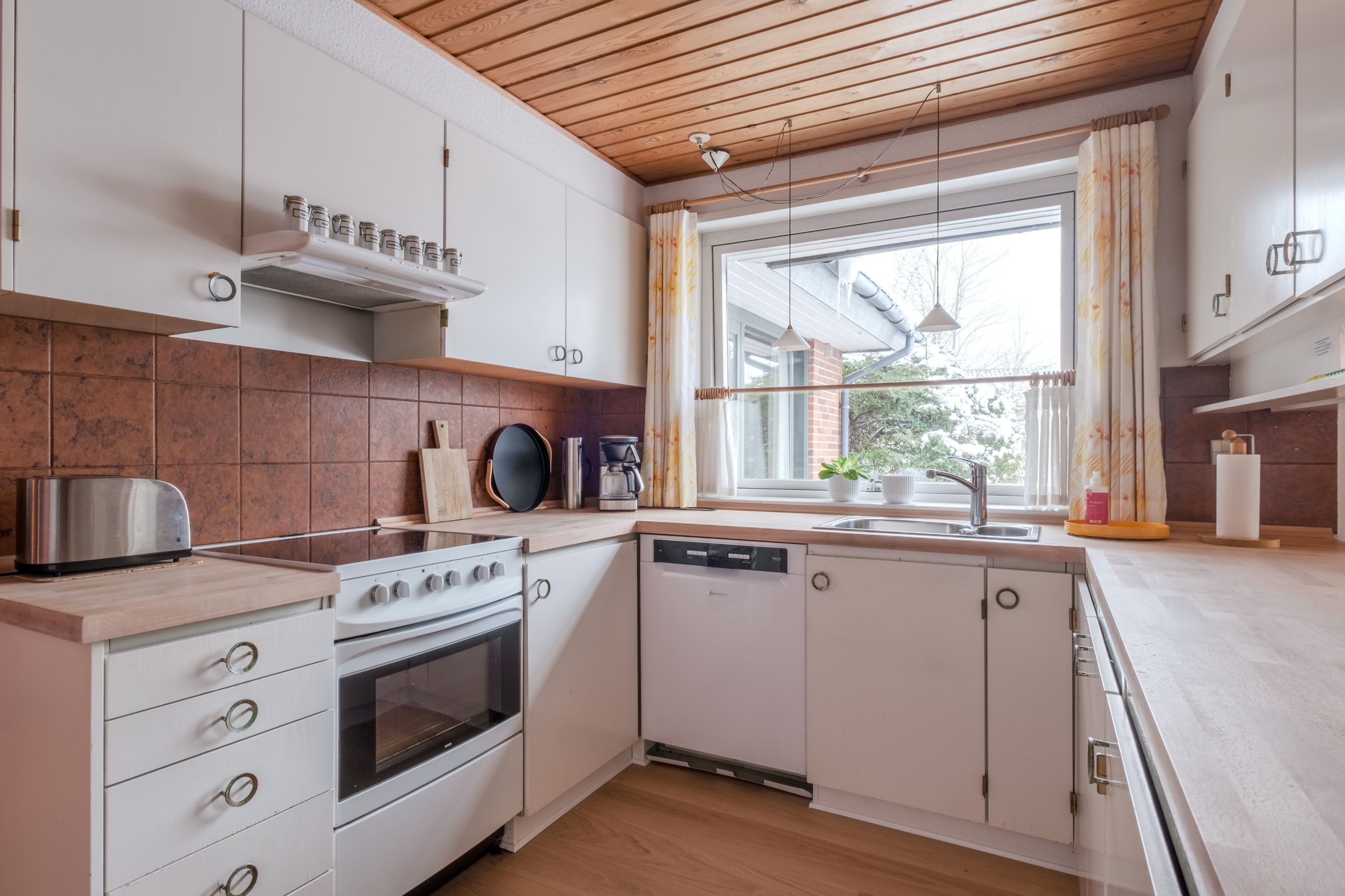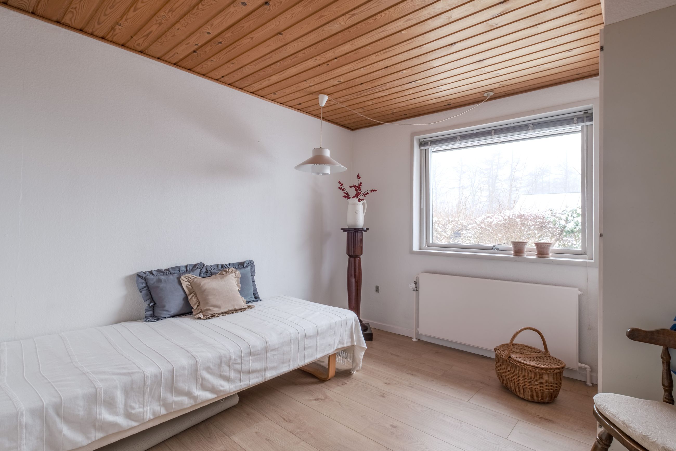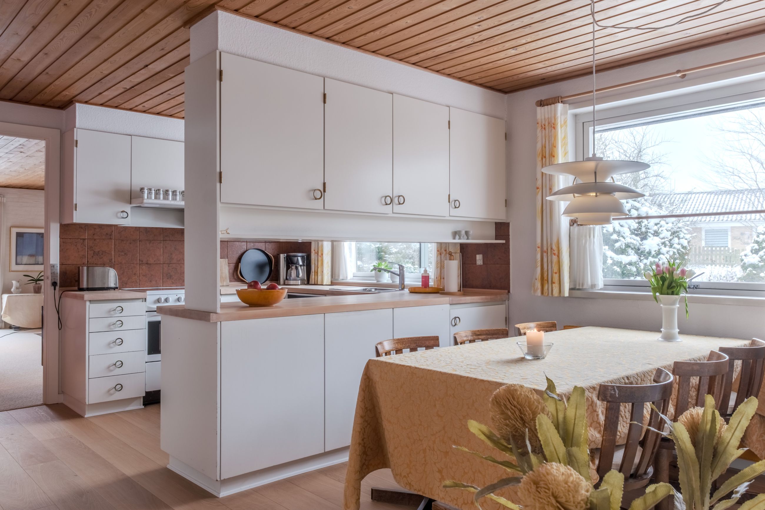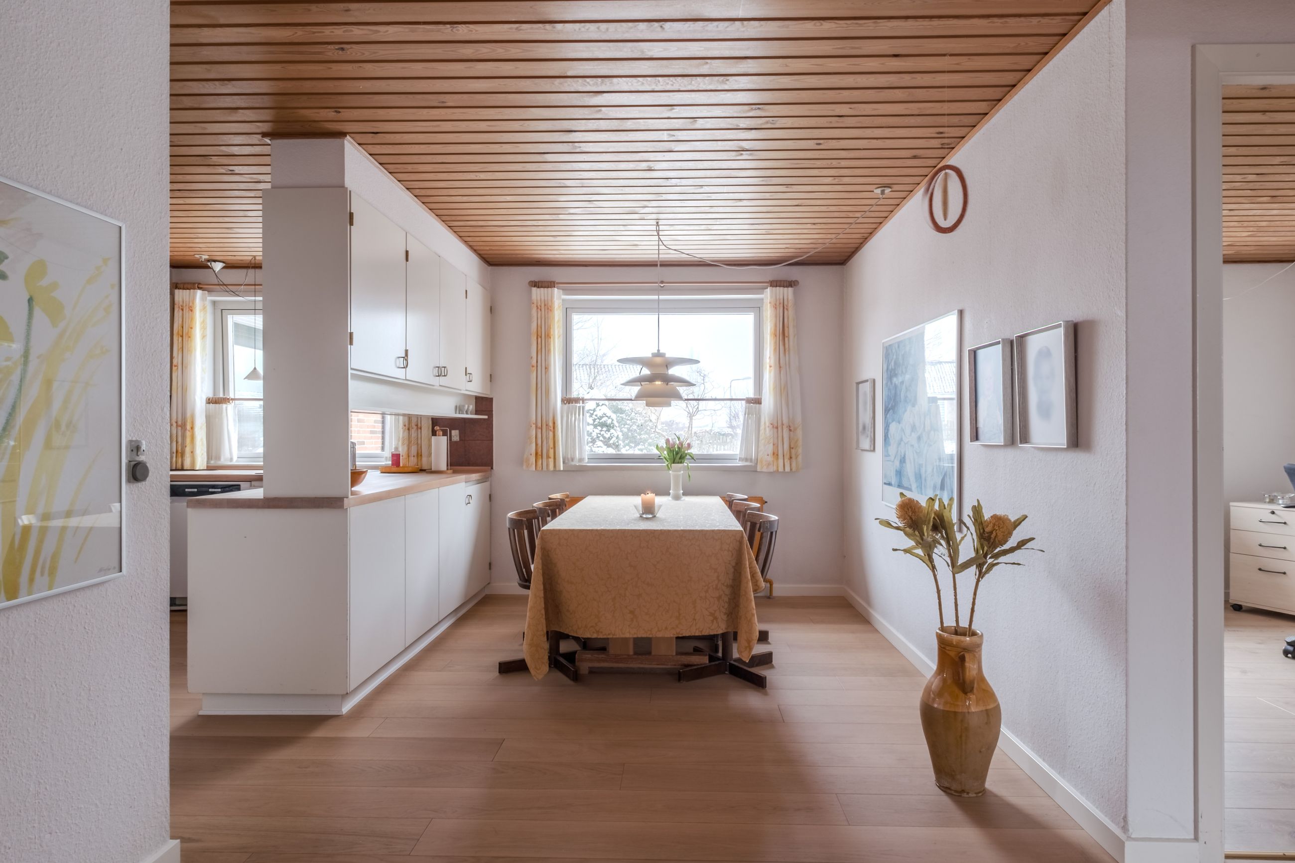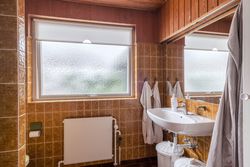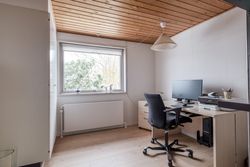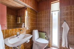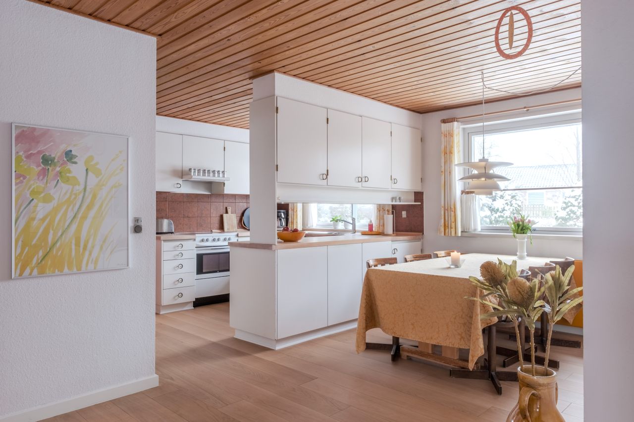 Boligen rummer desuden to store børneværelser og et rummeligt forældresoveværelse samt hele to badeværelser. Badeværelserne er som resten af huset bevaret i den fine originale stil med gullige fliser og hvid sanitet, hvilket giver et virkelig charmerende udtryk. Derudover får du et praktisk bryggers med god opbevaringsplads og arbejdsareal. I store dele af huset er der lagt nyere trægulve, som understøtter den varme helhed.