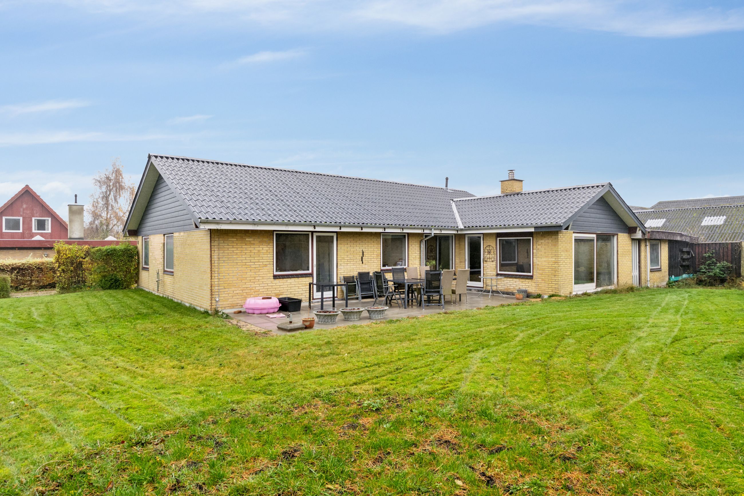 På en rolig, blind vej tæt på skolen i Skægkær ligger denne fine ejendom. Der er tale om en muret etplansvilla fra 1973, som er spækket med originale detaljer og materialer, og I kan således se frem til en yderst stemningsfuld og lys bolig med masser af plads. Også haven danner en skøn ramme om