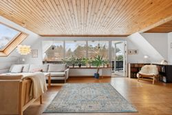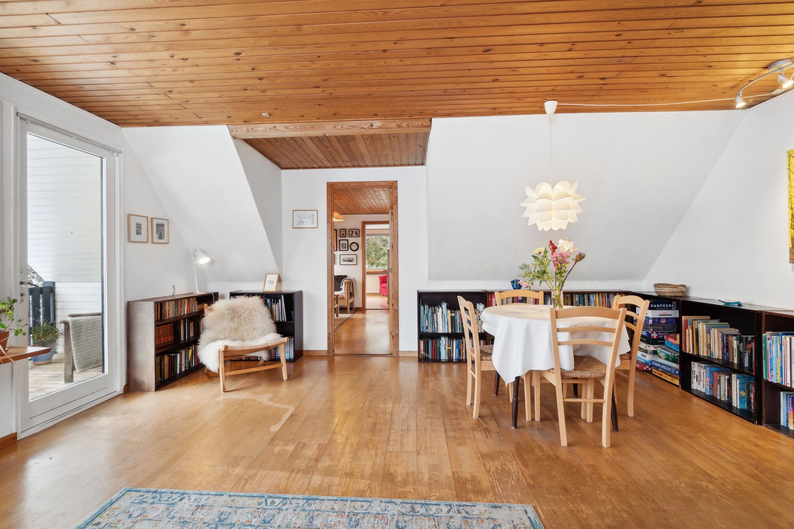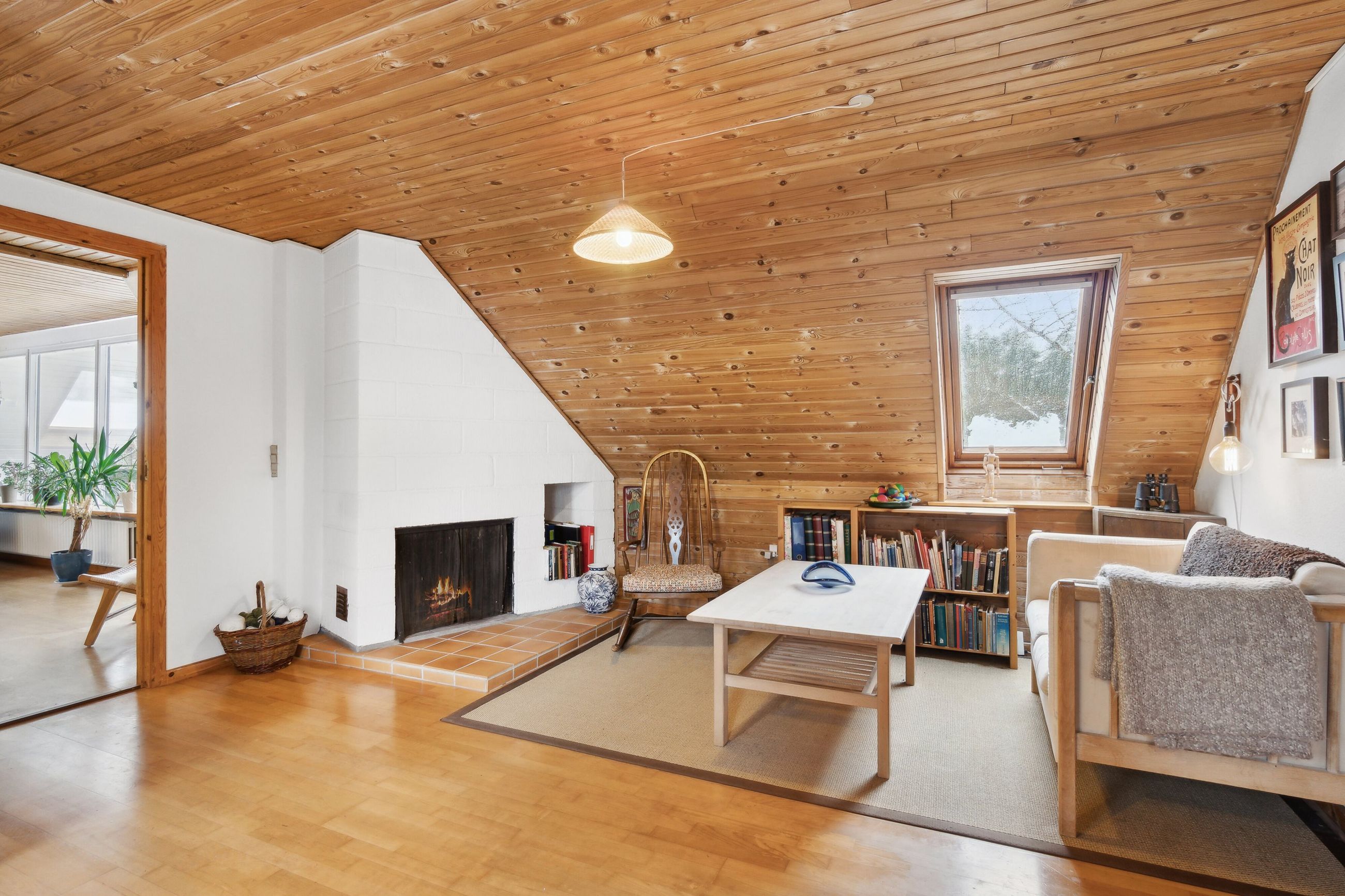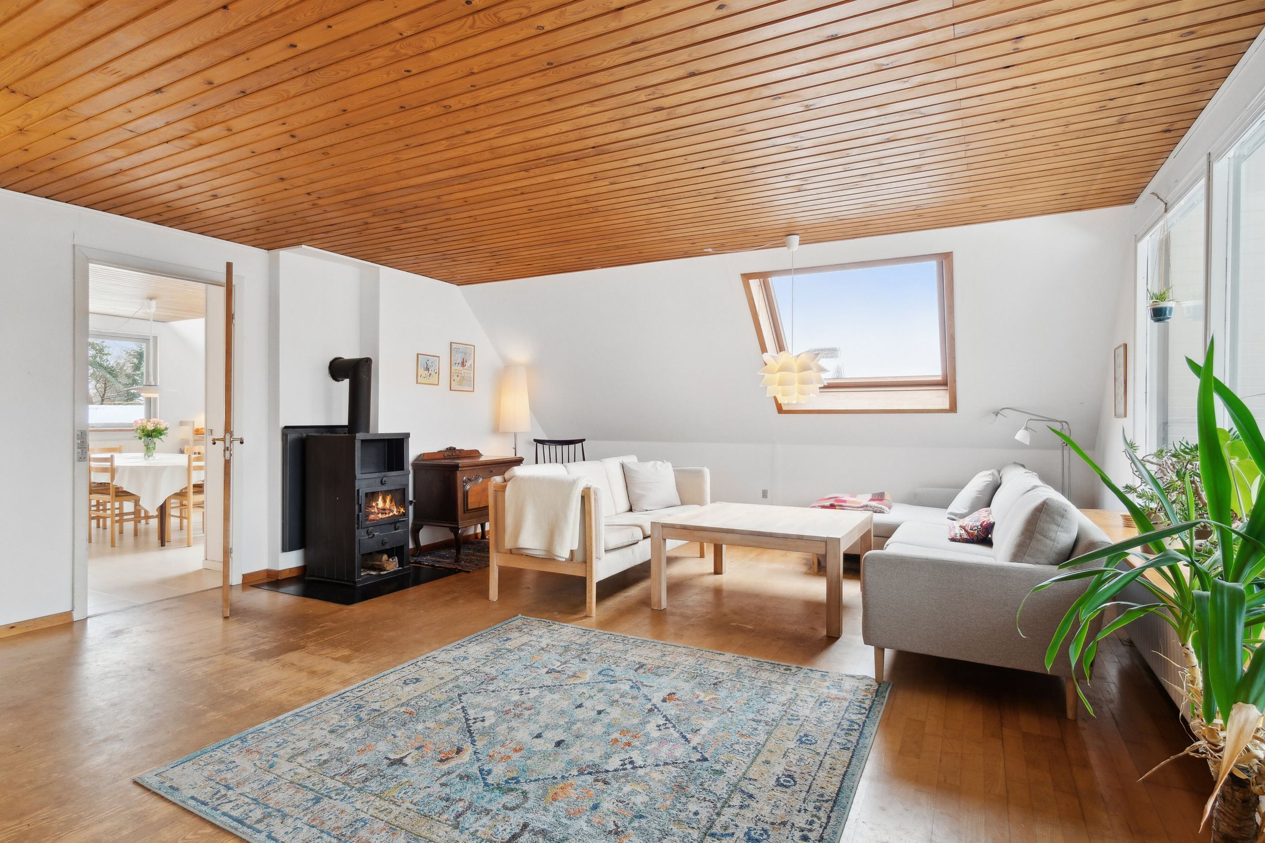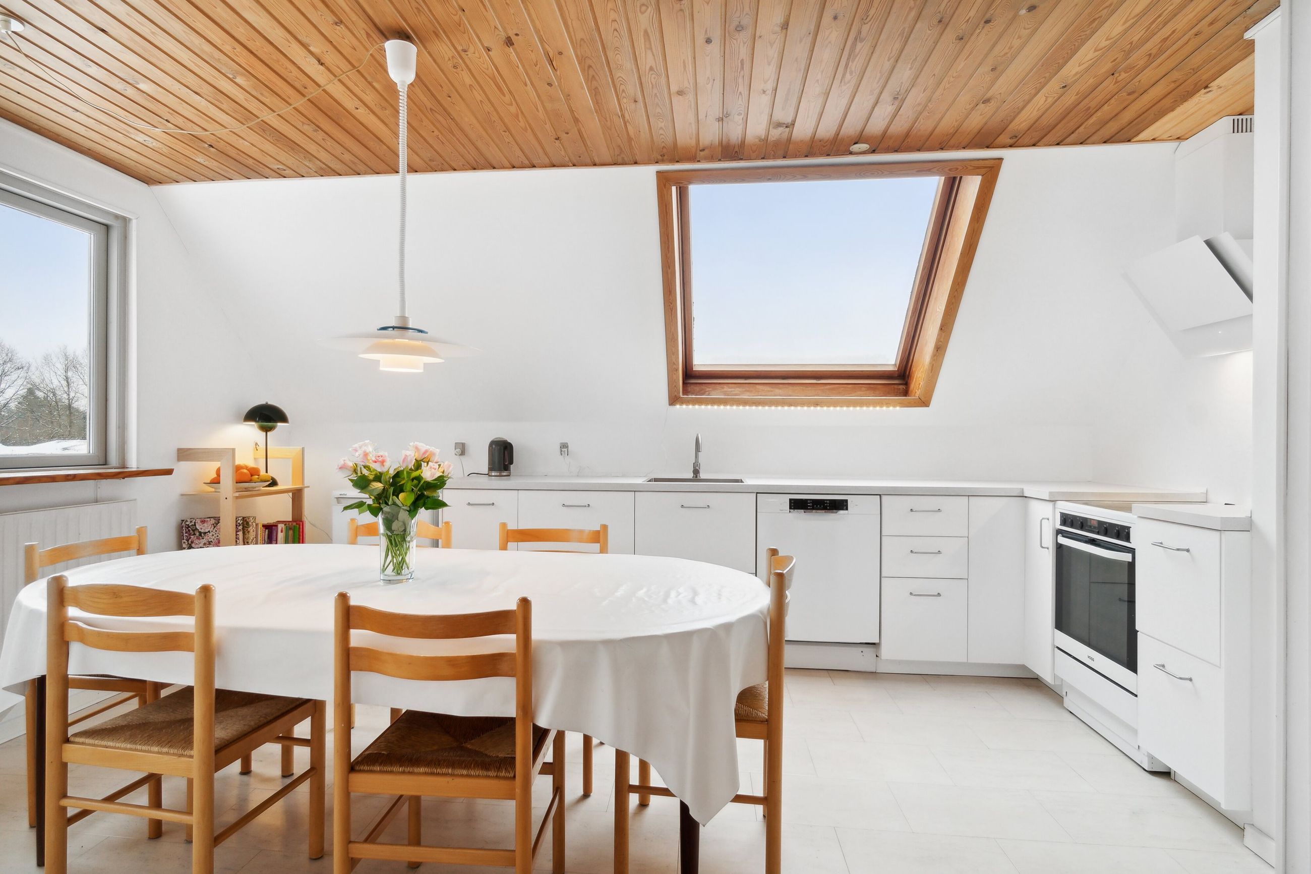 På førstesalen finder I boligens skønne opholdsrum, hvor det moderne køkken, som blev opdateret for få år siden, fremstår både stilfuldt og praktisk. Køkkenet er indrettet i en vinkelform, der skaber plads til et stort spisebord og indbyder til hyggelige fællesaktiviteter. I åben forbindelse med køkkenet ligger en rummelig og lys dagligstue med en stemningsfuld brændeovn, mens en tilstødende stue med indbygget pejs tilbyder endnu et hyggeligt opholdsområde. På samme etage finder I også to værelser, et praktisk viktualierum tilknyttet køkkenet samt et toilet.