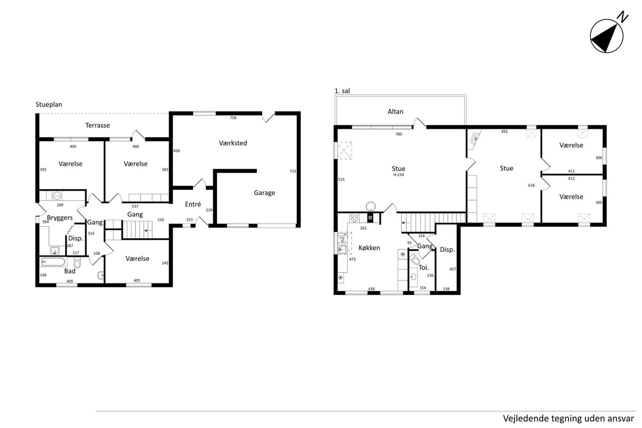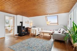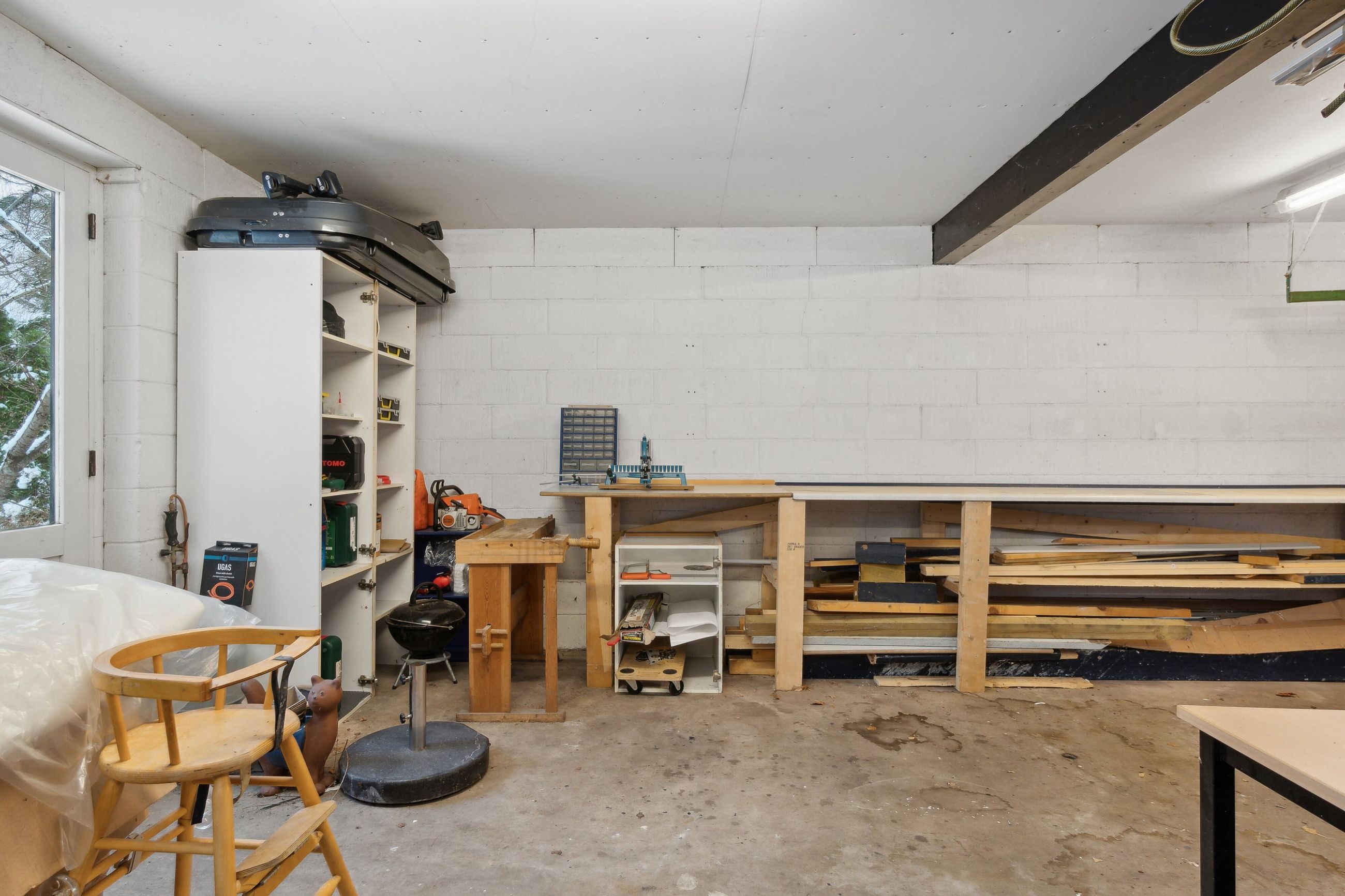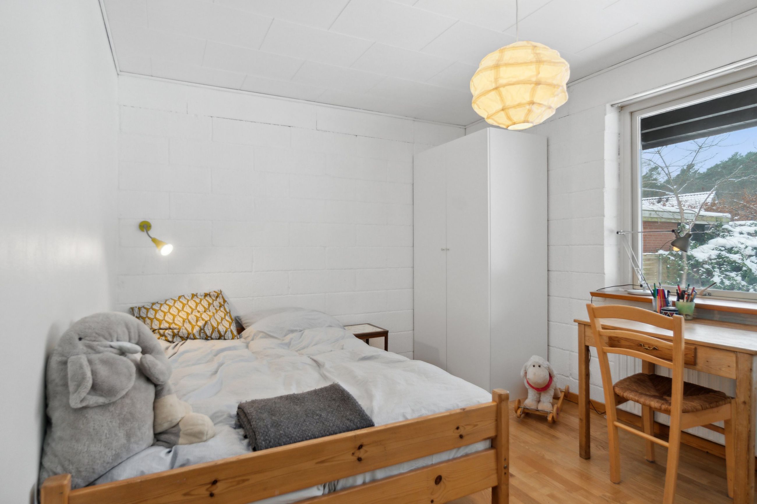 Stueetagen byder på tre yderligere værelser, som alle er lyse og alsidige – ideelle som børneværelser, kontor eller hobbyrum. Et rummeligt badeværelse med badekar og et praktisk bryggers er også placeret her. Fra stueetagen er der direkte adgang til en lukket garage, som kan anvendes til parkering, værksted eller opbevaringsplads.