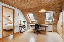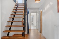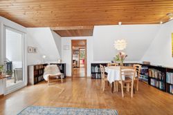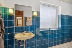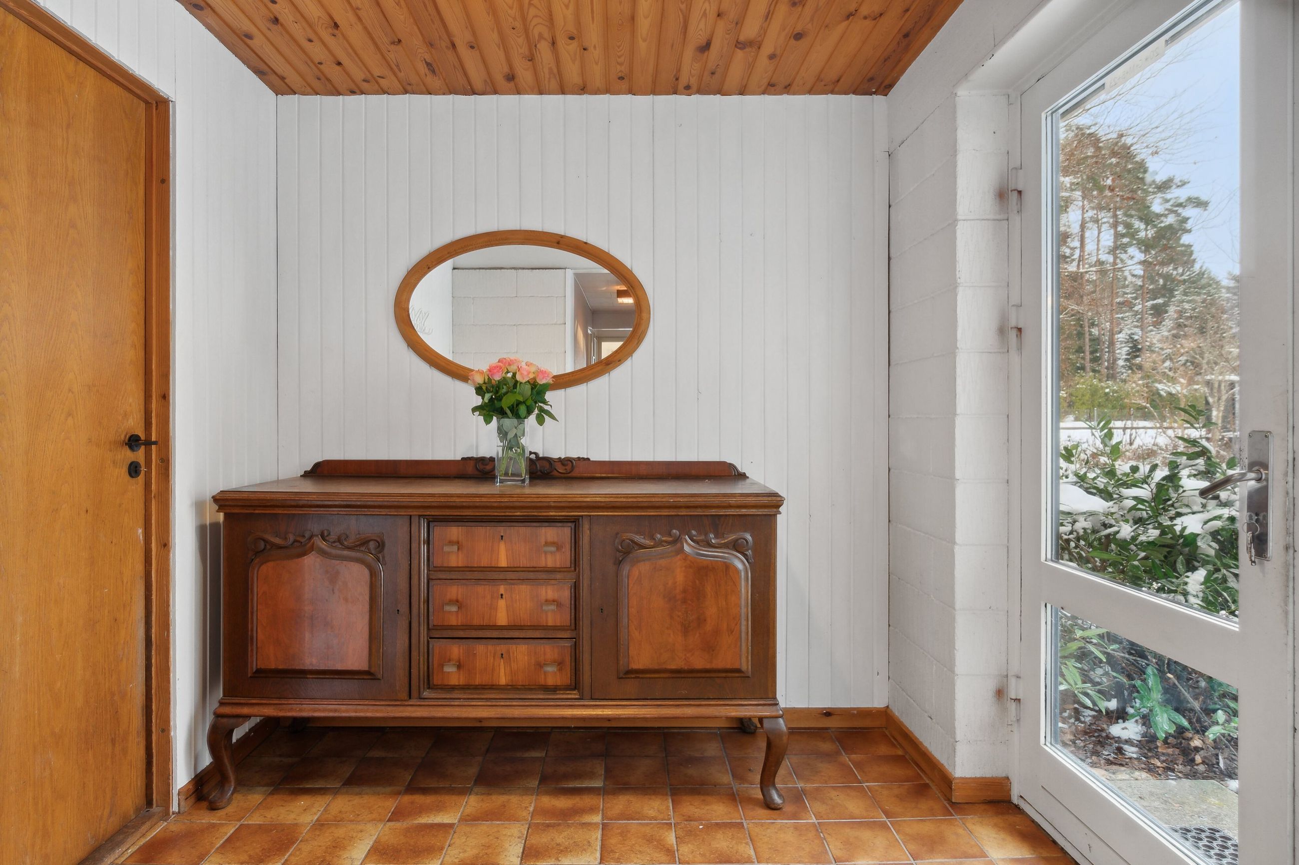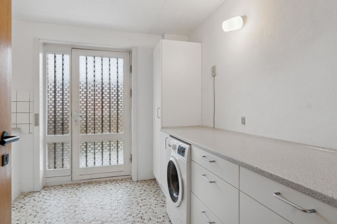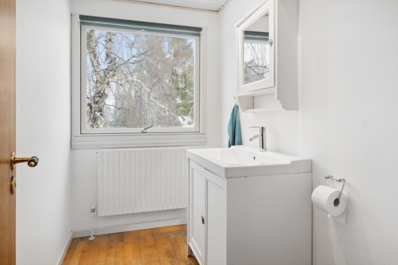 Stueetagen byder på tre yderligere værelser, som alle er lyse og alsidige – ideelle som børneværelser, kontor eller hobbyrum. Et rummeligt badeværelse med badekar og et praktisk bryggers er også placeret her. Fra stueetagen er der direkte adgang til en lukket garage, som kan anvendes til parkering, værksted eller opbevaringsplads.